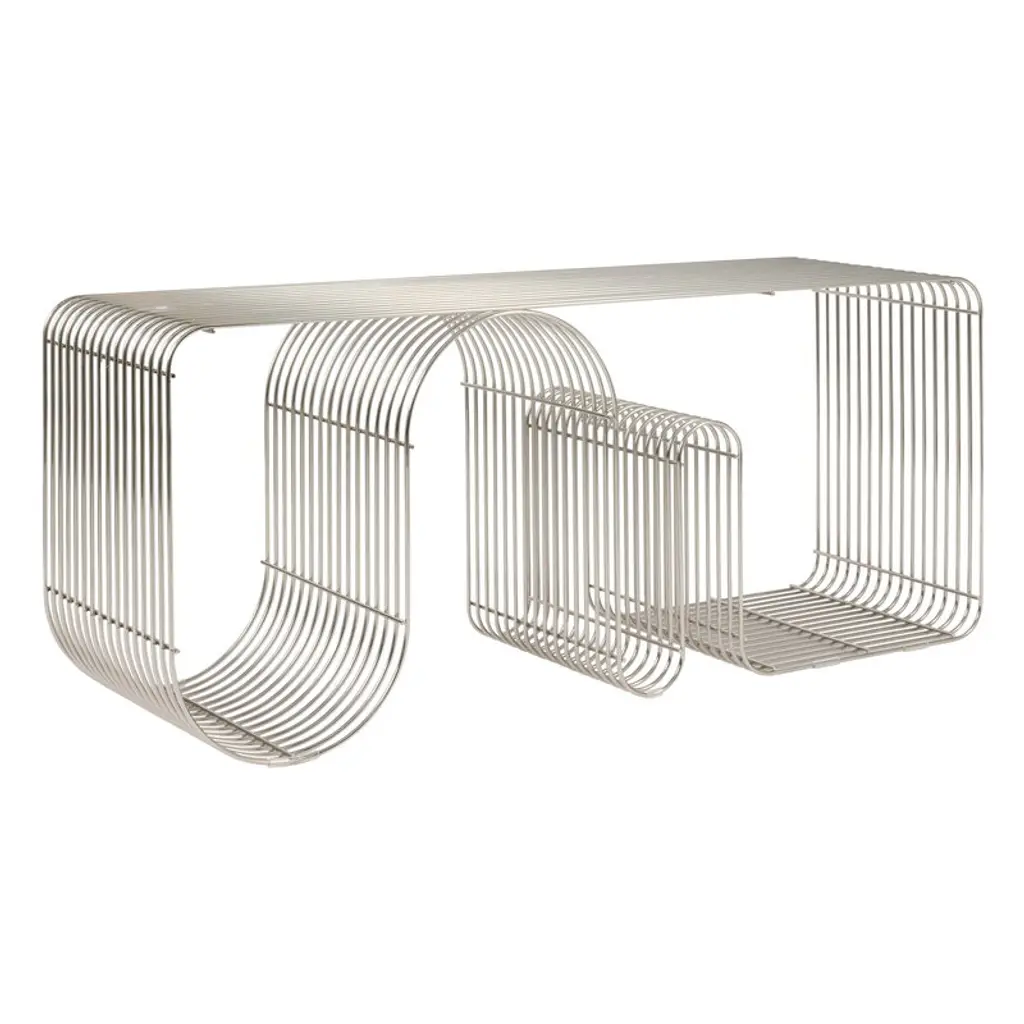 The Curva bench by AYTM attracts the eye with its curvy shape and stylish metallic finish. Made of bent iron, the Curva is not only a strong and practical stool but also an expressive decorative object. The Curva bench makes a convenient hallway chair or practical extra seat in the living room, and its airy structure allows it to serve as a storage unit, too, with wavy lines that can hold books, shoes or houseplants.