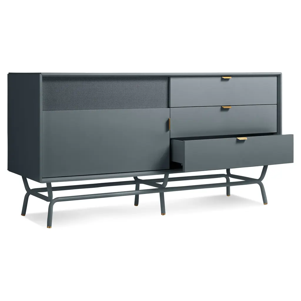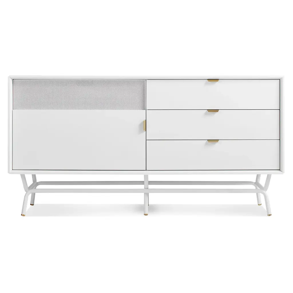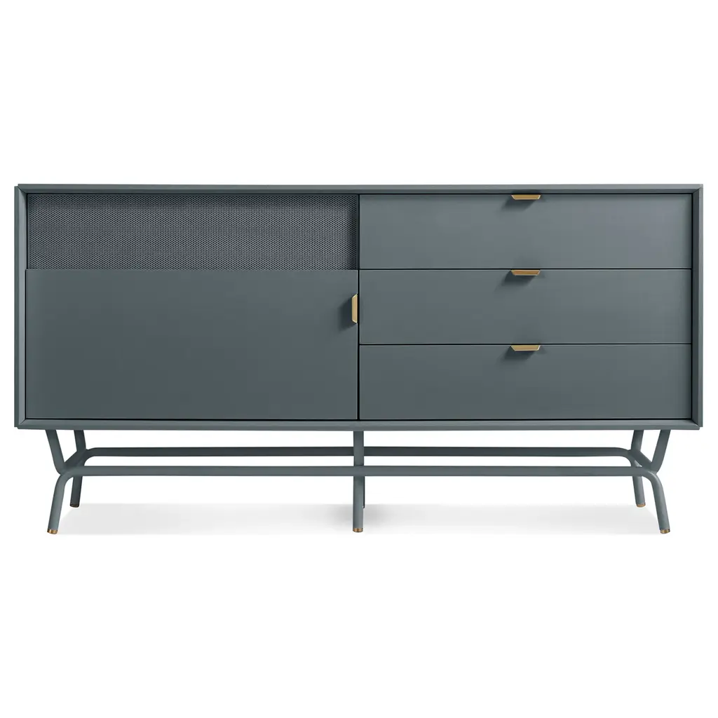The Blu Dot Dang 3 Drawer Console is a striking and versatile modern storage unit that makes a statement in the most sophisticated modern interiors. A refined profile comprised of powder-coated steel, and lots of hidden storage renders Dang both visually elegant and supremely practical. Antique brass detailing and a choice of elegant Blu Dot colors ensure that this modern storage solution complements a wide range of interior design schemes including mid-century modern, Scandinavian, and even farmhouse modern. Highlights