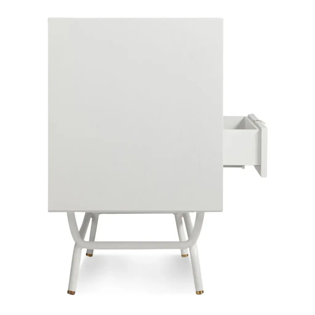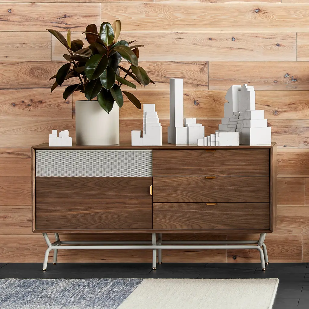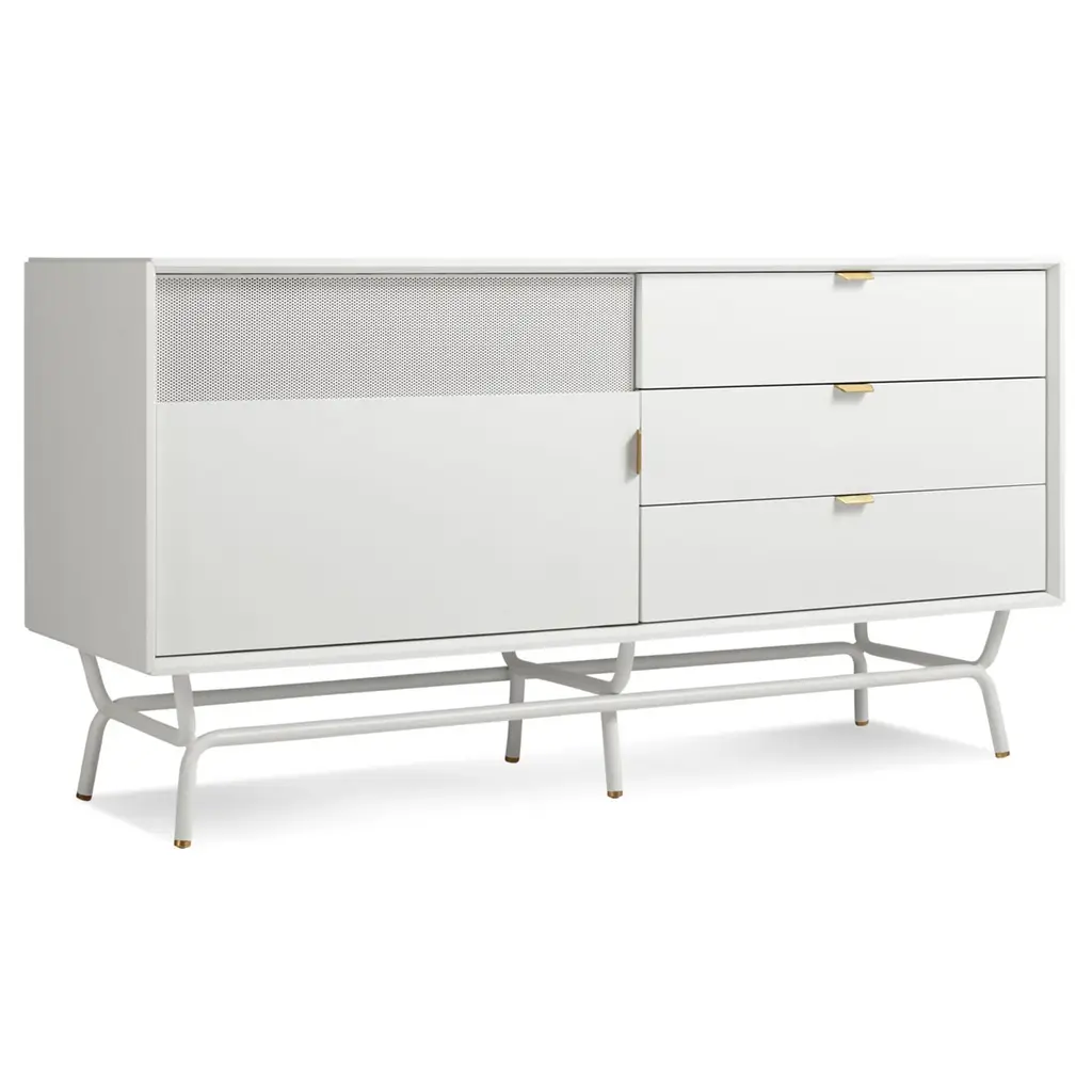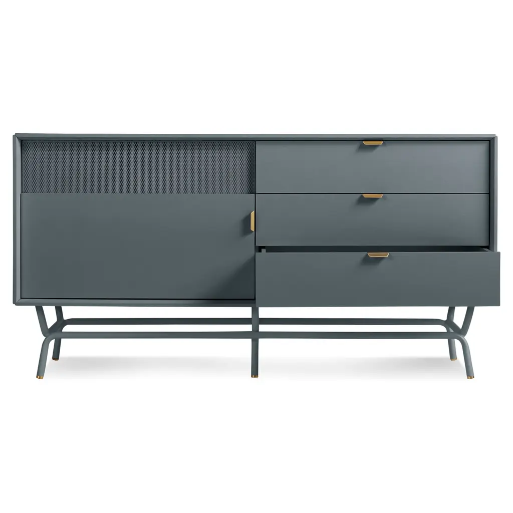 The Blu Dot Dang 3 Drawer Console is a striking and versatile modern storage unit that makes a statement in the most sophisticated modern interiors. A refined profile comprised of powder-coated steel, and lots of hidden storage renders Dang both visually elegant and supremely practical. Antique brass detailing and a choice of elegant Blu Dot colors ensure that this modern storage solution complements a wide range of interior design schemes including mid-century modern, Scandinavian, and even farmhouse modern. Highlights