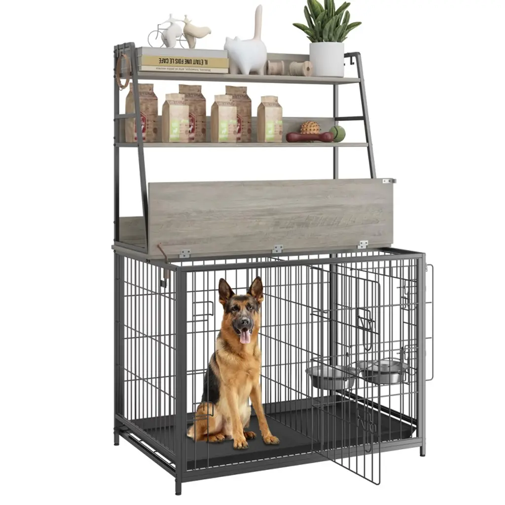 1.Dual-Section Design for Pet Comfort & OrganizationThis 2-in-1 dog crate features a smart split design: the lower 28.7-inch-tall crate creates a secure, cozy sanctuary for your dog, offering a private space to rest and relax. Above it, 3-tier storage shelves provide dedicated room for all your pet essentials¡ªfood, toys, leashes, and grooming supplies¡ªkeeping everything organized and within easy reach while blending pet care with home tidiness.2.Ample Space for Medium to Large BreedsMeasuring 37.4" L x 24.7" W x 57.1" H, this crate offers plenty of room for medium to large dogs to stand, turn, and lie down comfortably. Its generous dimensions ensure your pet has enough space to move without feeling confined, making it suitable for breeds like Labrador Retrievers, German Shepherds, or Golden Retrievers.3.Sturdy Construction with Stylish AppealBuilt with a durable wooden frame and a solid wooden divider, the crate boasts exceptional stability, ensuring it stands firm even with an active dog inside. The sleek, polished finish adds a touch of elegance, allowing it to blend seamlessly into living rooms, bedrooms, or entryways without looking like a typical bulky pet crate.4.Versatile Storage Beyond Pet SuppliesThe 3-tier upper shelves aren¡¯t just for dog gear¡ªthey¡¯re perfect for multitasking. Use them to display books, potted plants, family photos, or decorative items, turning the crate into a functional piece of furniture that enhances your home¡¯s decor while maximizing storage in any room.6.Seamless Integration into Home SpacesDesigned to look more like a stylish storage unit than a traditional crate, this piece fits effortlessly into various home styles, from modern to rustic. Its dual-purpose design saves space by combining your pet¡¯s living area with essential storage, making it a practical and attractive addition to any household with a medium to large dog.