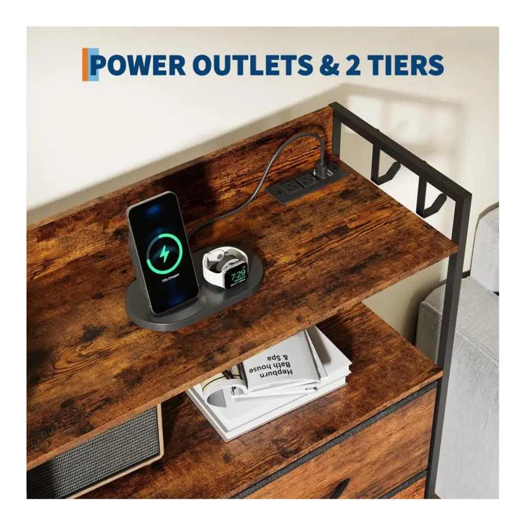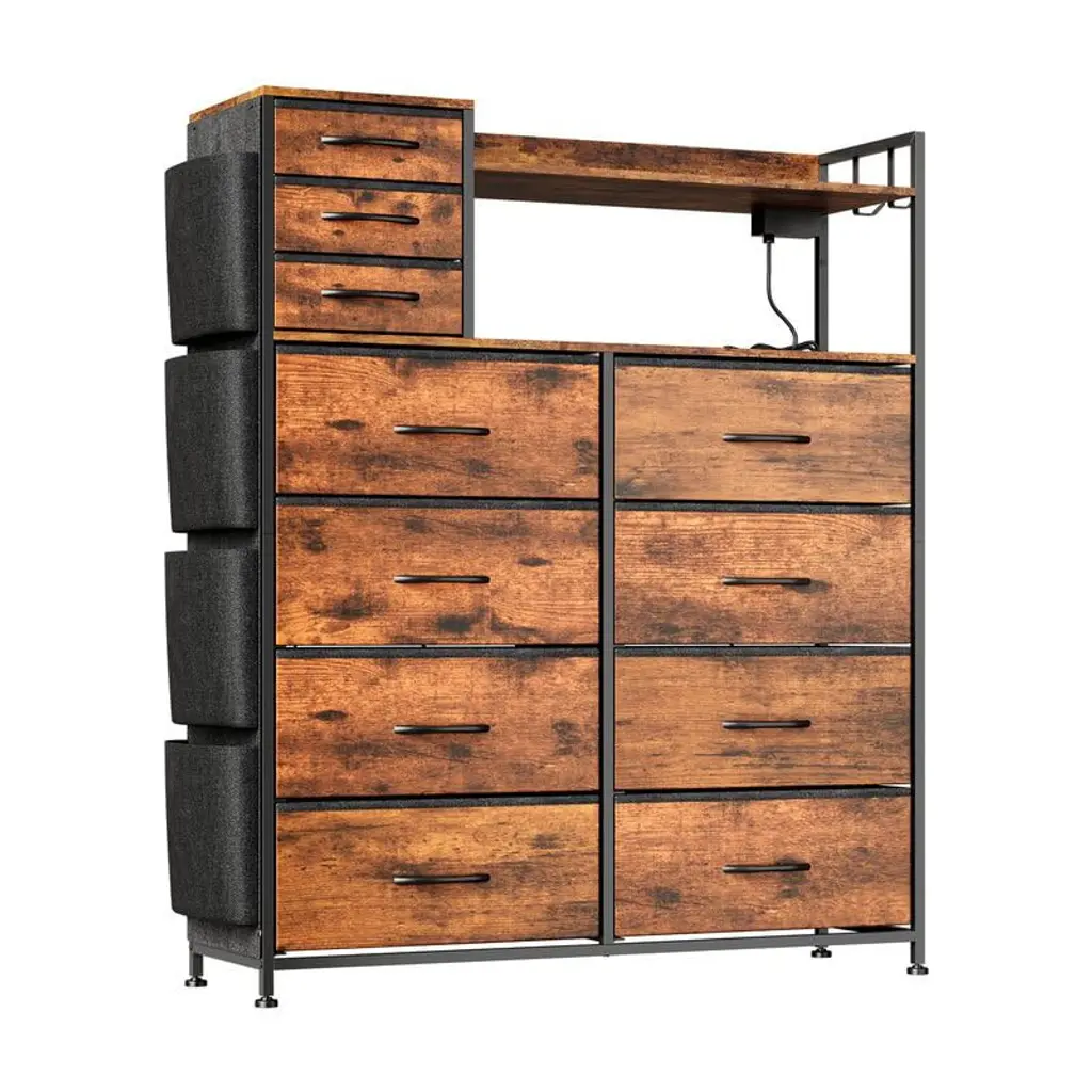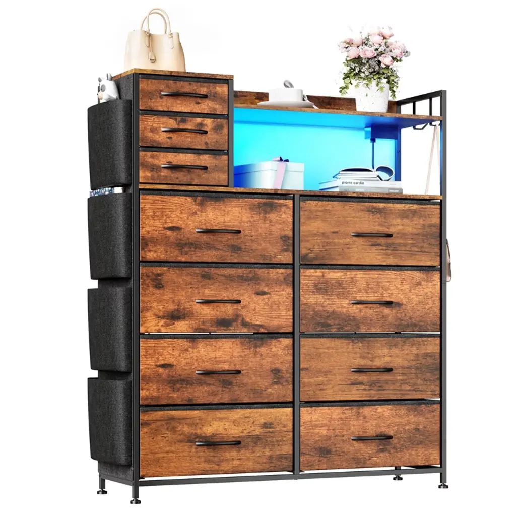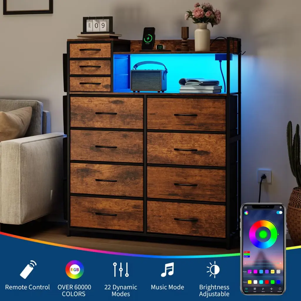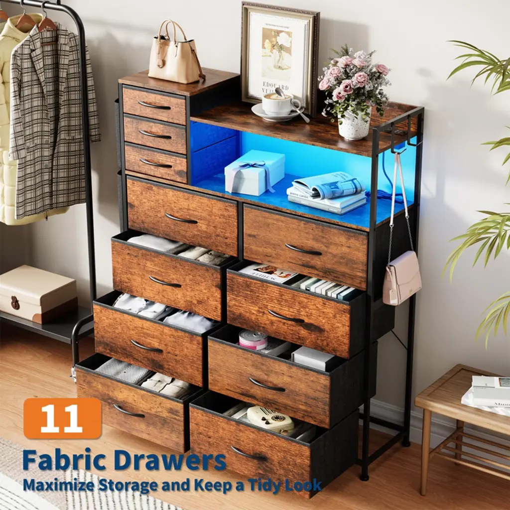 8+3 Drawer Dresser with Charging Station ¨C Fabric Drawer Storage Unit with LED Lights, Side Pockets & Hooks, Metal Frame & Wood Top for BedroomBrand: TROPOWMaterial: Metal Frame + MDF Wood TopStyle: Industrial VintageDimensions: 43.11"W x 14.37"D x 10.24"HStorage Features: 8 Large Fabric Drawers + 3 Small Drawers 4 Side Pockets + Hooks + Shelves Wooden Top Display AreaSpecial Features: Charging Station (2 USB + 2 AC Outlets) APP-Controlled LED Lighting Anti-Tip Device + Adjustable FeetAssembly: Required (No Professional Tools Needed) PRODUCT HIGHLIGHTSSMART MULTI-FUNCTIONAL STORAGE 11 Fabric Drawers ¨C Organize clothes, toys, or accessories 4 Side Pockets ¨C Quick-access for remotes/books Wood Top & Shelves ¨C Display decor or essentials INDUSTRIAL CHIC DESIGN? Rustic wood grain + metal frame blend? Vintage charm fits farmhouse to modern styles? Space-saving depth (14.37") for small spacesTECH-FRIENDLY CONVENIENCE Built-in charging hub ¨C Power devices while organizing APP-controlled LED lights ¨C Adjust brightness/color Cable management ¨C Keeps wires tidy STURDY & SAFE High-strength metal frame ¨C Supports heavy loads Anti-tip kit + adjustable feet ¨C Stable on uneven floors Durable MDF top ¨C Scratch-resistant EASY ASSEMBLY Labeled parts + clear instructions No special tools required 42.88 lbs lightweight for easy placement WHY CHOOSE THIS DRESSER?? Maximized Storage ¨C 11 drawers + shelves + pockets? Tech-Integrated ¨C Charging & smart lighting? Versatile Style ¨C Complements any decor? Space-Efficient ¨C Fits bedrooms to entrywaysPerfect For: Small apartments (multi-functional storage) Kids¡¯ rooms (toys/clothes organization) Living rooms (charging station + decor display)