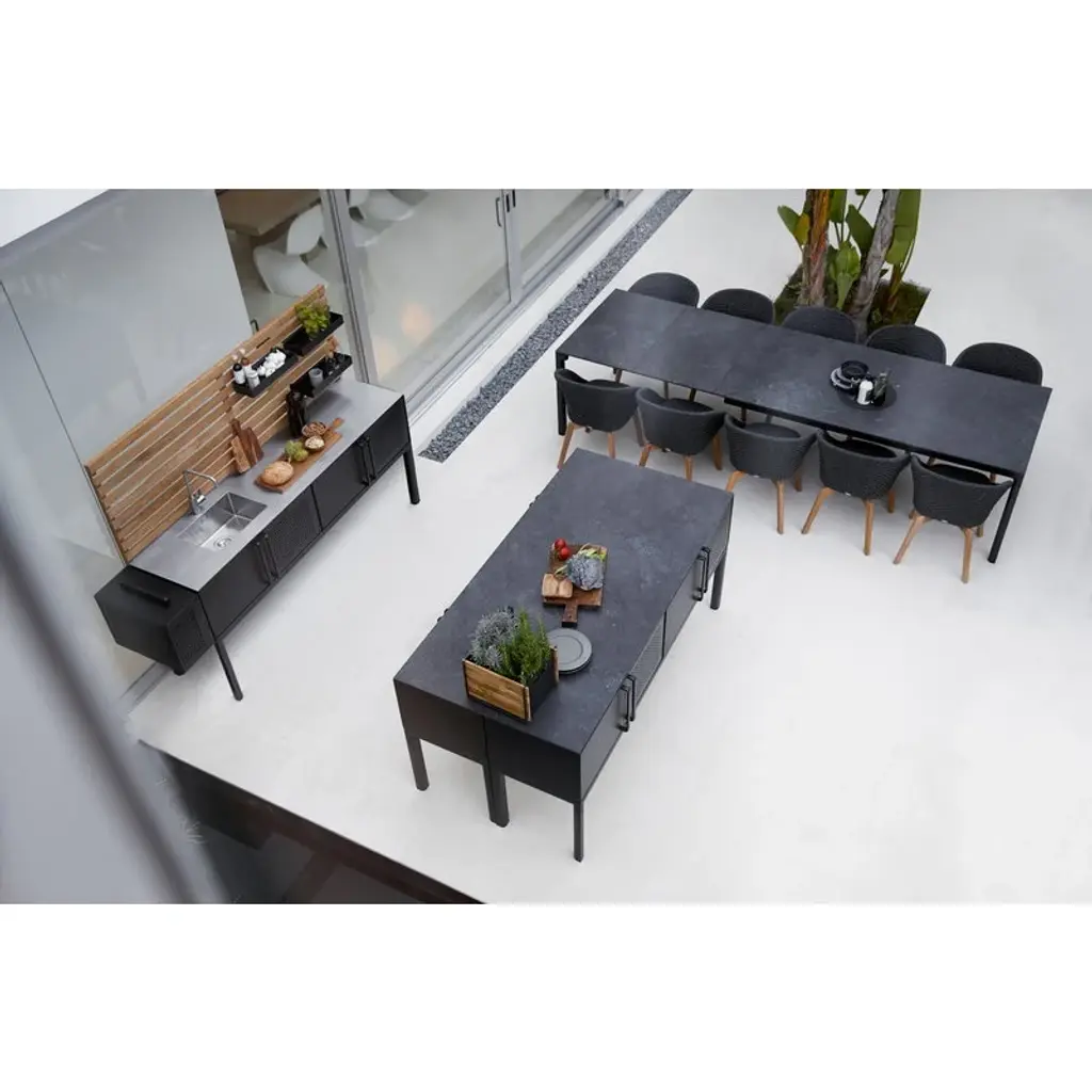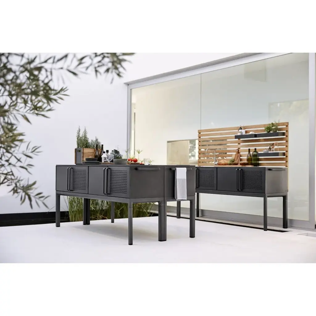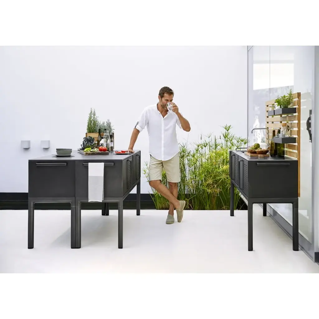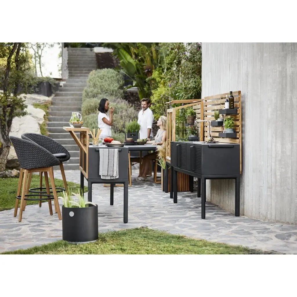 The Drop single kitchen module is a great addition to your outdoor kitchen area. Made of aluminum with a ceramic top, the module features a bar on its side for hanging towels or utensils. Due to its moderate size, the Drop kitchen module also works great as a storage unit on the balcony or patio. Cane-line’s modular Drop outdoor kitchen concept takes outdoor living to the next level. Made of aluminum, the Drop kitchen modules have a distinctively Scandinavian minimalist style that can easily be complemented with add-ons made of teak wood. With the Drop collection, Cane-line encouraged you to make most of your time spent outdoors, also when cooking!