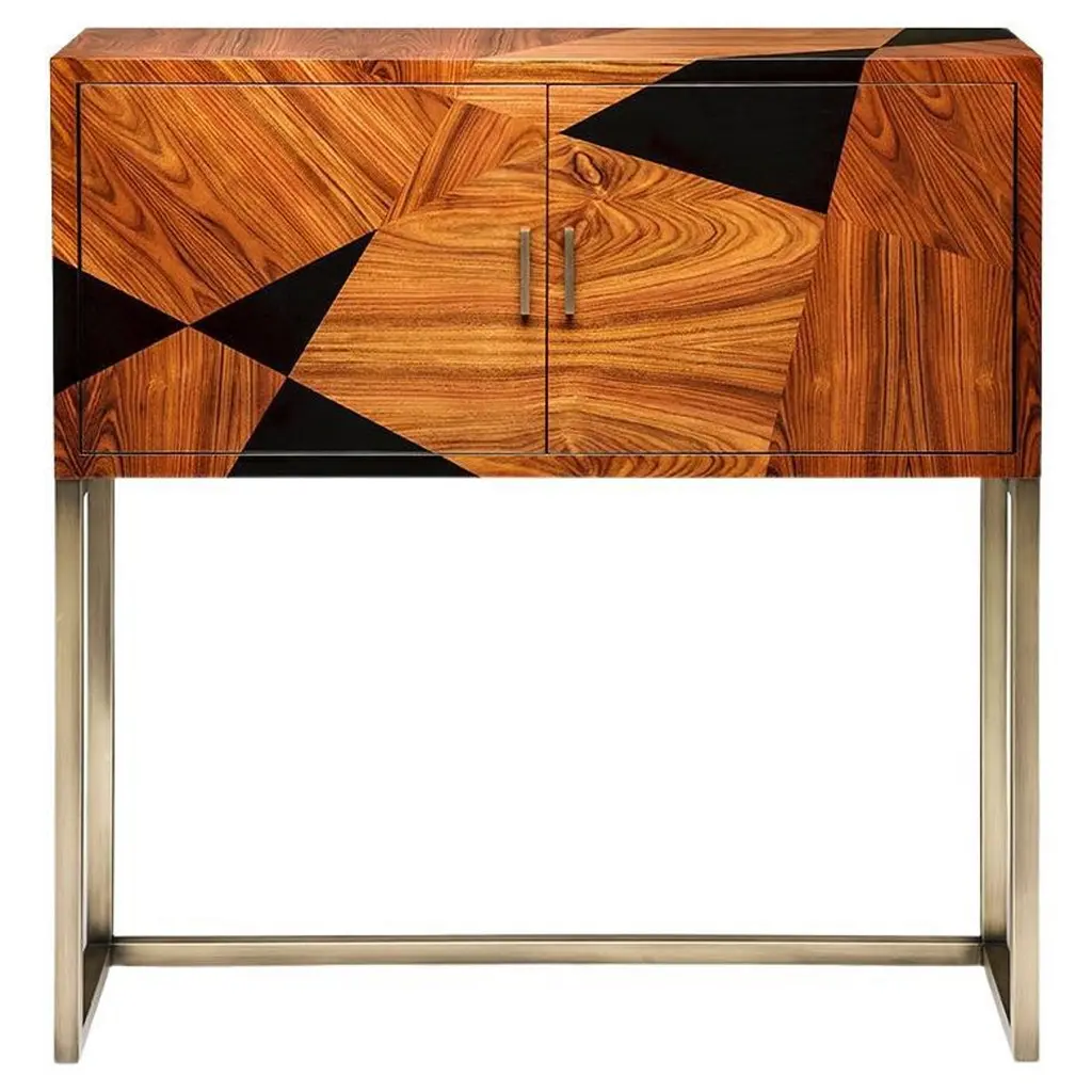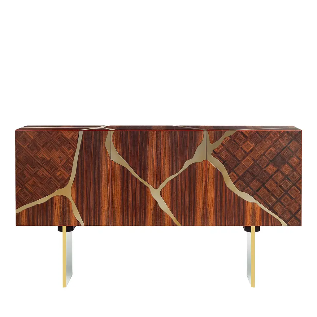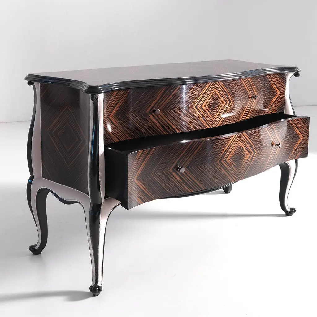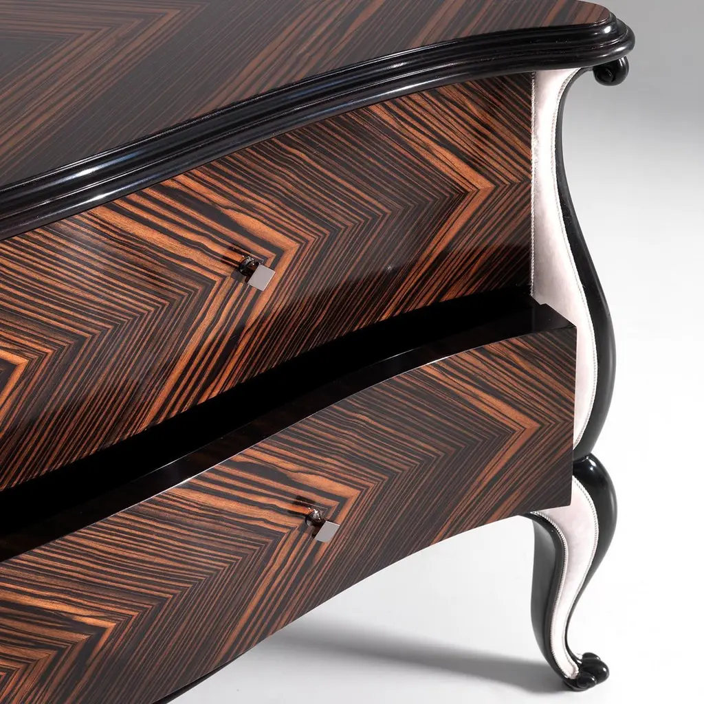 This exquisite dresser echoing clear classic inspiration is distinctive for its soft lines and precious materials. The graceful silhouette in cherry and Makassar ebony boasts the striking natural patterns of the wood's veins harmonizing with the conflicting leather inserts. Its sinuous profile conveys timeless elegance and includes the four legs sustaining the storage unit. Alternative fabric inserts are available on request.