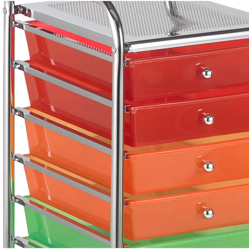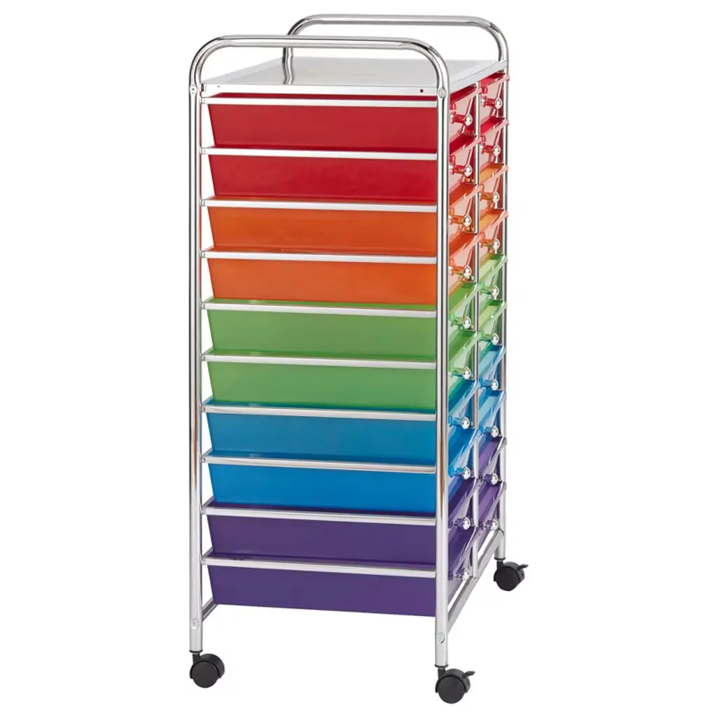 The versatile ECR4Kids 20-Drawer Rolling Storage Cart is an ideal solution for homes, offices, and classrooms. It features 20 sturdy plastic drawers, offering substantial space for organizing small items keeping them off the floor and within reach. The drawers are detachable and slide smoothly on metal channels, allowing for easy removal when needed. The semi-opaque plastic maintains privacy for stored contents. Teachers will find it handy for arranging school supplies and teaching materials, perfectly accommodating standard papers up to 9" x 12". It's also great for sorting and storing scrapbooking materials, stickers, yarn, and other small craft supplies in home offices or educational settings. The mobile organizer can double as a makeup storage unit, neatly hiding nail polish, hair tools, and cosmetics under a vanity. It's equally effective for keeping office supplies in order and mobile, fitting conveniently under a desk. Equipped with four casters, two of which are lockable, the cart is easily movable to wherever it's needed most. It also includes two easy-to-grab handles for effortless maneuvering. The durable frame, made from chrome-plated metal, includes a top shelf for additional display space. Its multifunctional design makes it a perfect addition to laundry rooms, garages, offices, bathrooms, or kitchens.