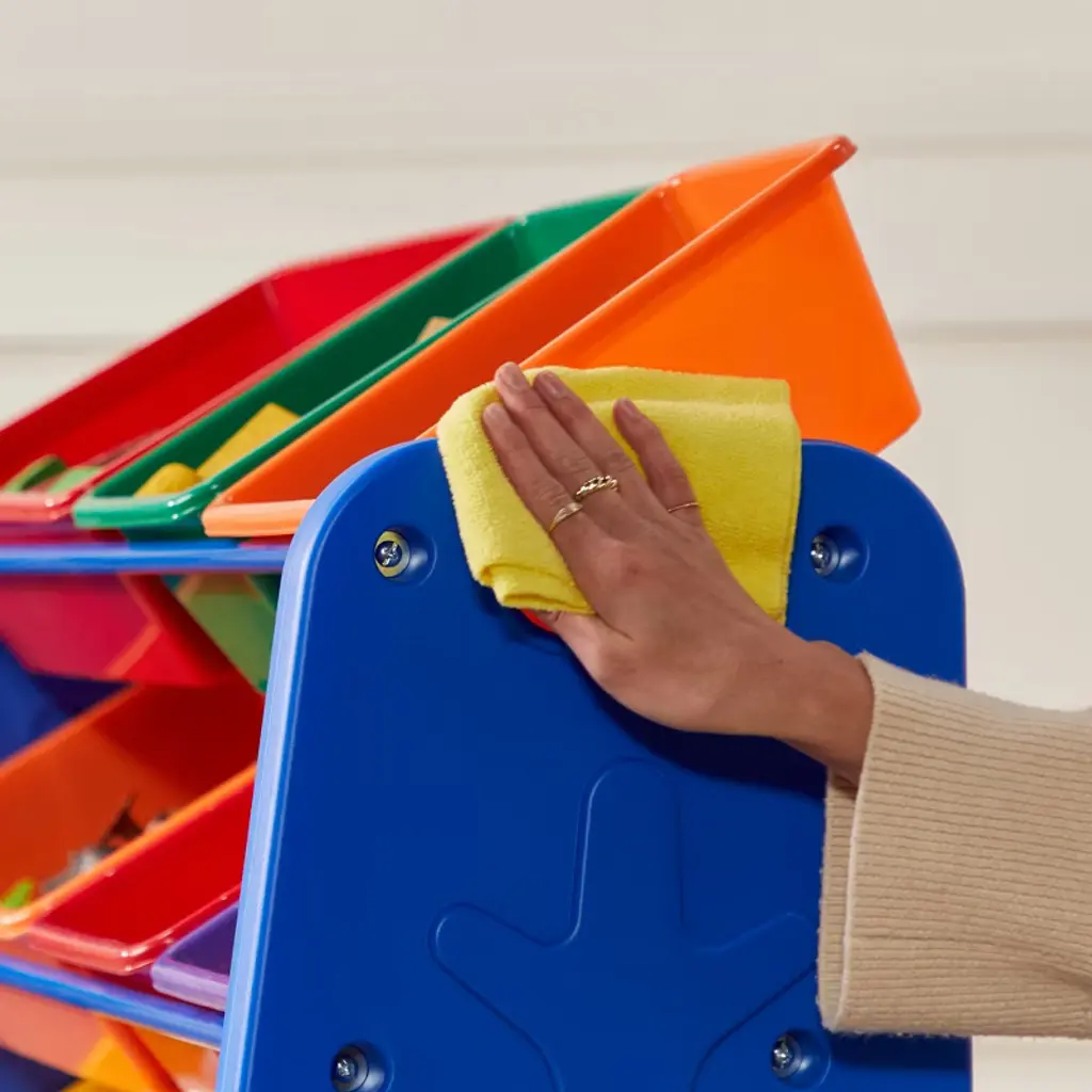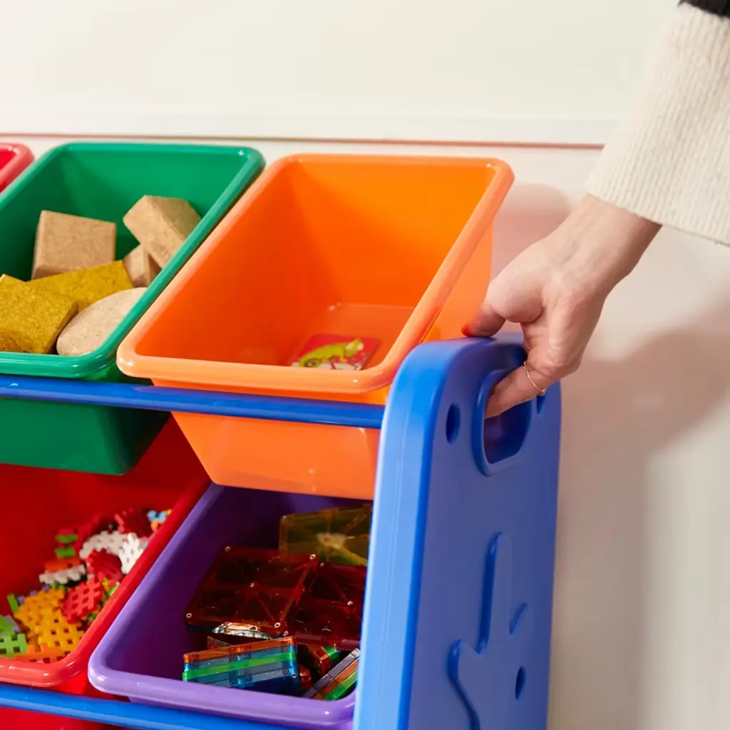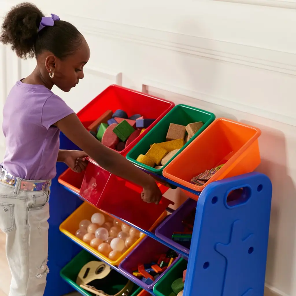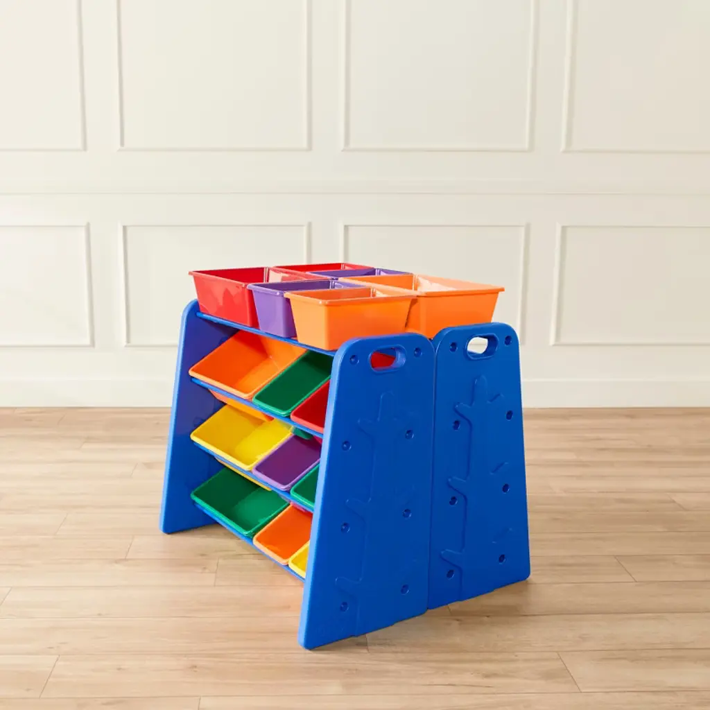 The ECR4Kids Tree Storage Organizer, equipped with 12 plastic bins, offers a whimsical and practical solution for keeping children's bedrooms, playrooms, or family rooms organized. Ideal for home and school use, this open-front storage unit is a great alternative to a traditional toy box. The compact size provides ample storage in a small footprint. Four tiers keep bins at a sloped angle making them easy to access; designed for children, allowing them to independently select and return toys, books, or art supplies. The design promotes self-sufficiency, aiding in the development of autonomy and responsibility. Eight standard and four large-sized bins are constructed with durable plastic and feature rounded edges and a curved interior to easily remove contents. Each lightweight toy bin is easy to remove to bring playtime to the floor, activity table, or outdoors. The playroom essential features adaptability encouraging dynamic interaction with the environment and personal belongings. The sturdy tree-inspired frame has handles on either side making it easy to move, adapting to different organizational needs. The unit features a tip-resistant design, allowing parents to configure the shelf flush to a wall or use two storage racks against each other to create an organization hub.