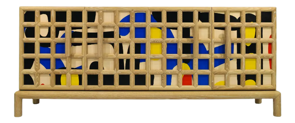 British artist Richard Woods is renowned for his work with garish and repetitious motifs. He has applied these to facades, floors and walls across the world in commissioned work and gallery installations. These ‘logos’ are often abstractions and interpretations of domestic pattern, the woodblock print being a particularly recognizable signature print. Designer Sebastian Wrong teamed up with Woods for Established & Sons’ programme of collaborations where individuals from two creative fields work together. Woods’ block printed motifs were applied to Wrong’s utilitarian cabinets. These storage units are reminiscent of 1950s furniture, a fitting vehicle because much of Woods’ work is based on a nostalgia for midcentury domestic interiors.
