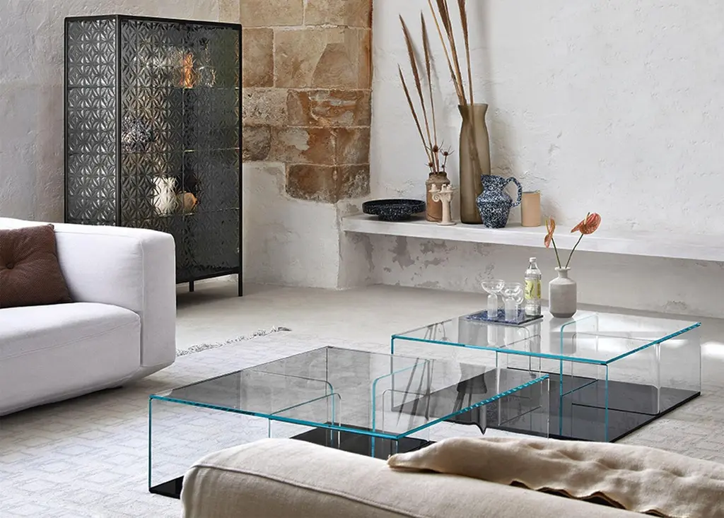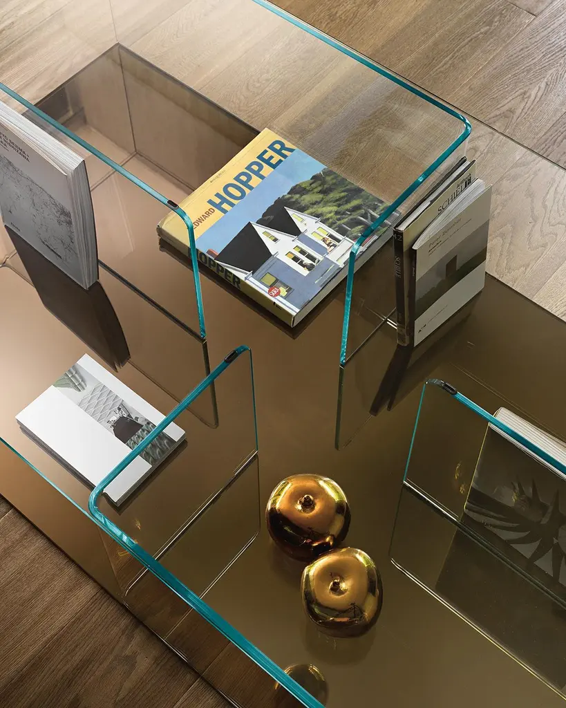 Coffee table/storage unit composed of 4 elements in 10 mm curved glass mounted between two 10 mm glass racks. Top and partitions in extralight glass, bases available in extralight glass, back-painted extralight glass, extralight mirrored glass, back-silvered bronze glass. Coffee table with extralight black back-painted glass base.
