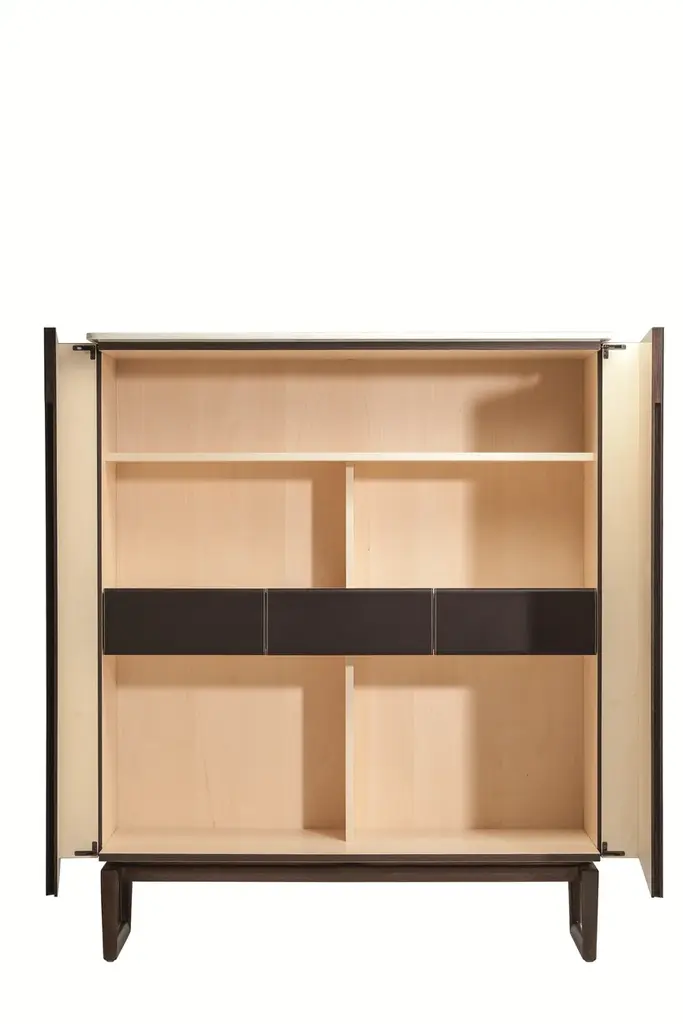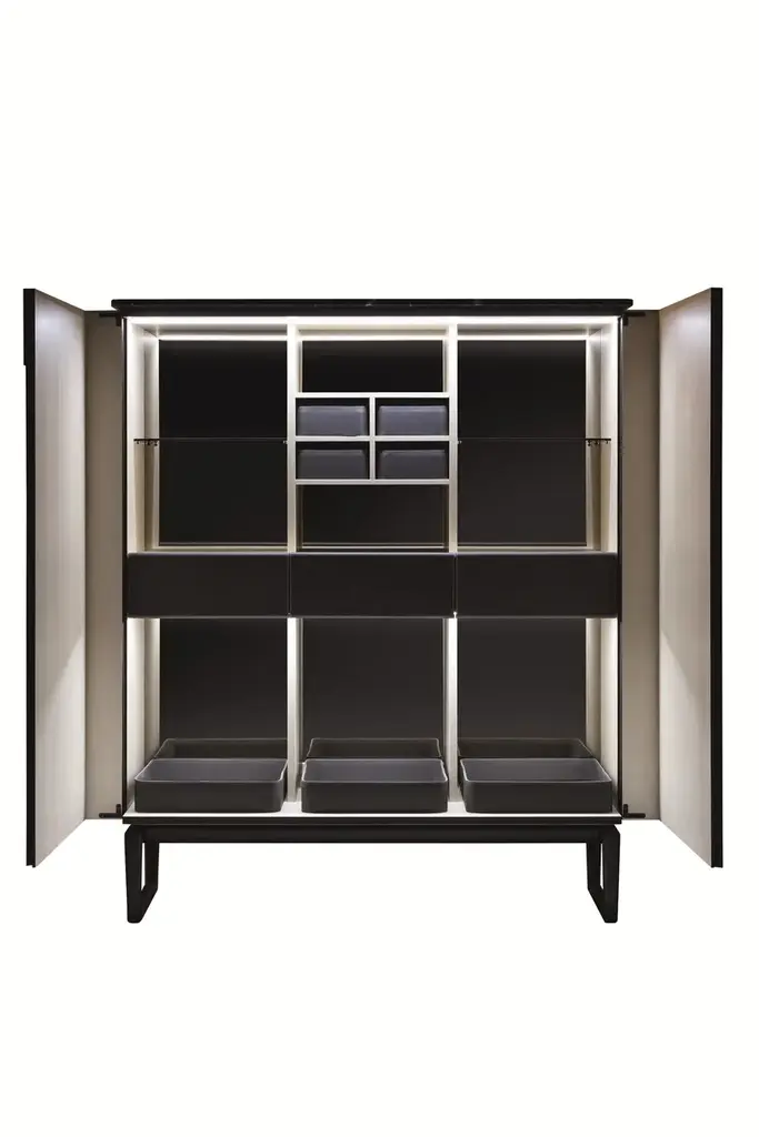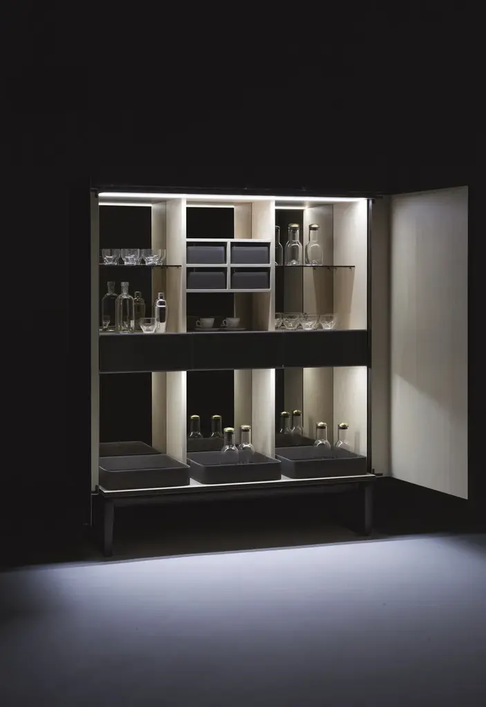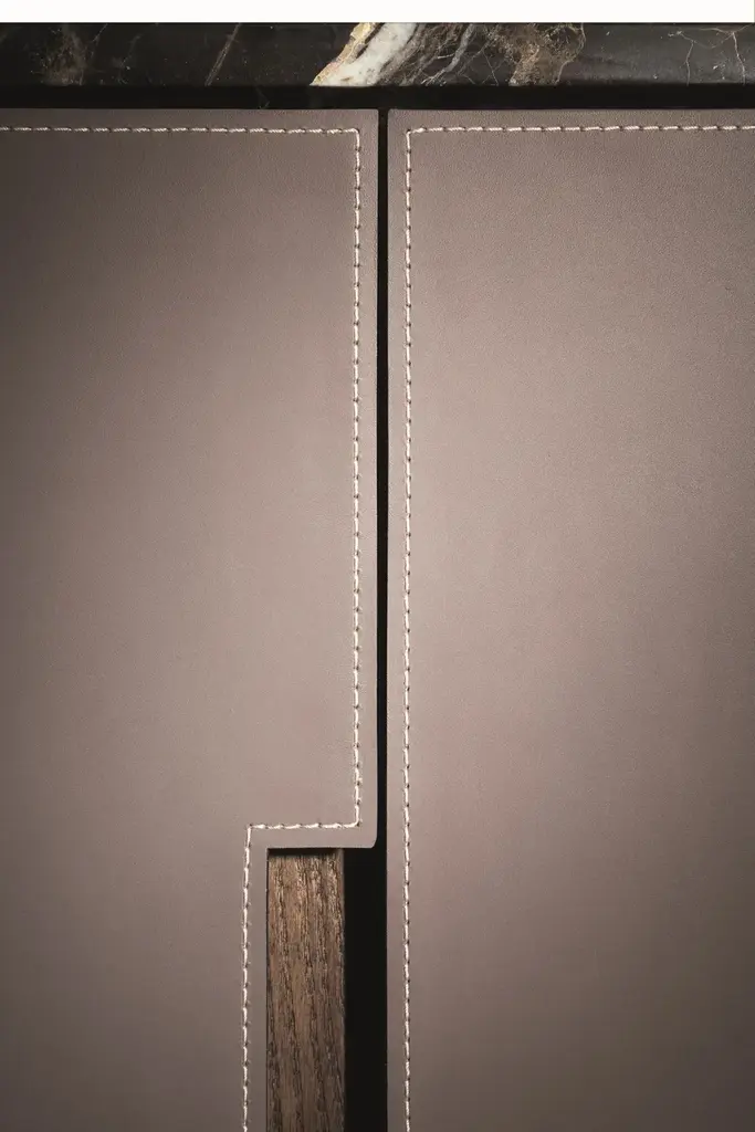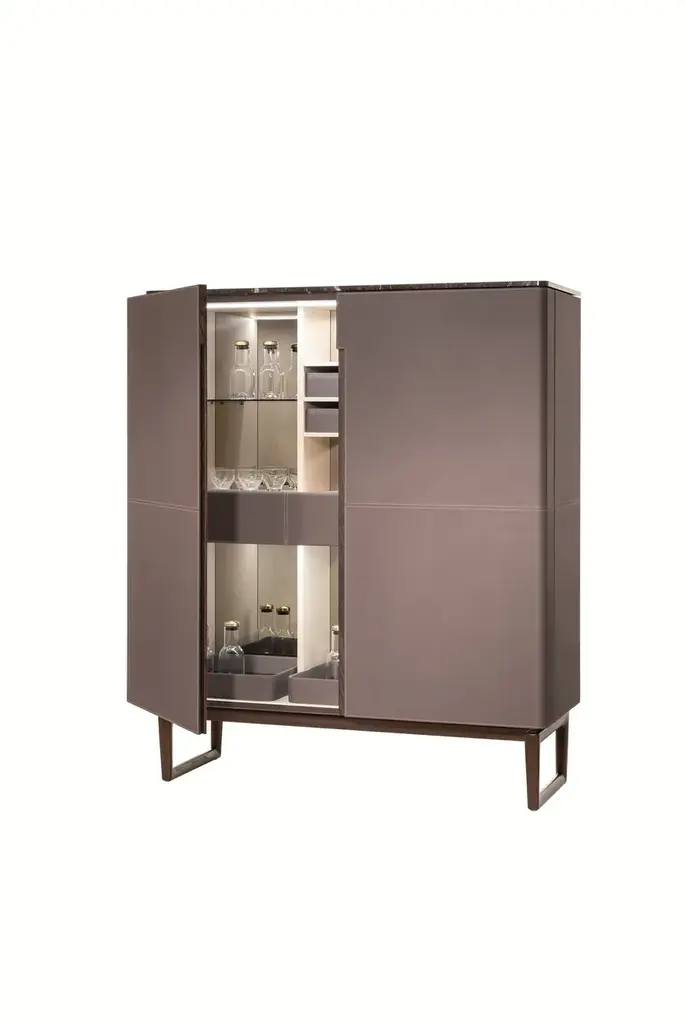 Roberto Lazzeroni has expanded the Fidelio collection offering his interpretation of the high cabinet.Clean, slender lines create a piece of furniture designed like a contemporary cupboard. Its most distinctive feature is the vertical line that neatly separates the two doors. The base takes the form of a moka-coloured solid ash stand that brings out the visual lightness of the piece. The materials evoke the aesthetic codes of the collection, particularly those of the low cabinet. The warm and intense tones of Cuoio Saddle Extra leather or Cuoio Saddle leather envelop the exterior. And in an evocative contrast, when opening the cabinet there is the surprising brightness of the extra light natural maple that completely covers the compartments and the inside surface of the doors, creating movement and depth.There are two alternatives for the interior fittings. A classical and functional arrangement with three large drawers and a system of shelves and surfaces.Or an accessorised version to becomes a stylish mobile bar. It has sophisticated interiors with bottle-holder trays, glass shelves for glasses and multi-purpose trays upholstered in Cuoio Saddle Extra leather or Cuoio Saddle leather. Bronzed mirrors on the back wall embellish the entire effect. Opening the doors, a warm diffused light sets off the interior by way of an LED lighting system automatically activated by sensors.The supporting structure of the Fidelio high cabinet is in solid ash and birch plywood. The top is in ash with a moka finish or Emperador marble with a glossy finish or Calacatta gold marble with a glossy or semi-glossy finish. The rubber-capped steel feet can be adjusted. The fronts of the drawers, mounted on metal runners with soft closing mechanism, are also upholstered in Cuoio Saddle Extra leather or Cuoio Saddle leather. Precious contrast or tone on tone stitching refines the saddle leather cover on the surfaces of the cabinet. If desired, the rear can be in moka-stained ash or upholstered with saddle leather.A collection of storage units for any room in the home. Low cabinet for the living room. Chest of drawers, tall boy and bedside table for the bedroom. Deliberately lean design, precious materials. Functional details become highly characteristic aesthetic elements, such as the recessed handles that provide interesting graphics on the surfaces. Intense contrast also between the dark, warm hues of Cuoio Saddle Extra leather and the wood covering the outside and the bight explosion of the very pale natural maple used inside the compartments and drawers. Formal minimalism and sophisticated finishes for an across-the-board collection, an easy match for all the Poltrona Frau furnishings yet with its own very defined personality. The low cabinet has a supporting frame in solid ash and birch plywood with moka coloured ash veneer. The system of compartments and drawers creates an alternating balance of empty and solid. The unit stands on a solid ash easel structure emphasising its visual lightness, perfect for living areas.The Fidelio bedroom units are more compact, to provide all the storage space needed in this room. The supporting frame is in solid Canaletto walnut and birch plywood with Canaletto walnut veneer. All the pieces in the collection have the outside of the drawers and side panels covered in Cuoio Saddle or Cuoio Saddle Extra leather. On request, the back panel can also be covered in leather, otherwise it comes in moka ash or Canaletto walnut veneer. An even richer impression of solidity is given by the versions with semi-polished Calacatta gold marble top for the bedroom units, plus a polished finished for the low cabinet. Alternatively, top in solid wood with moka coloured ash veneer for the low cabinet or in Canaletto walnut for the bedroom units.
