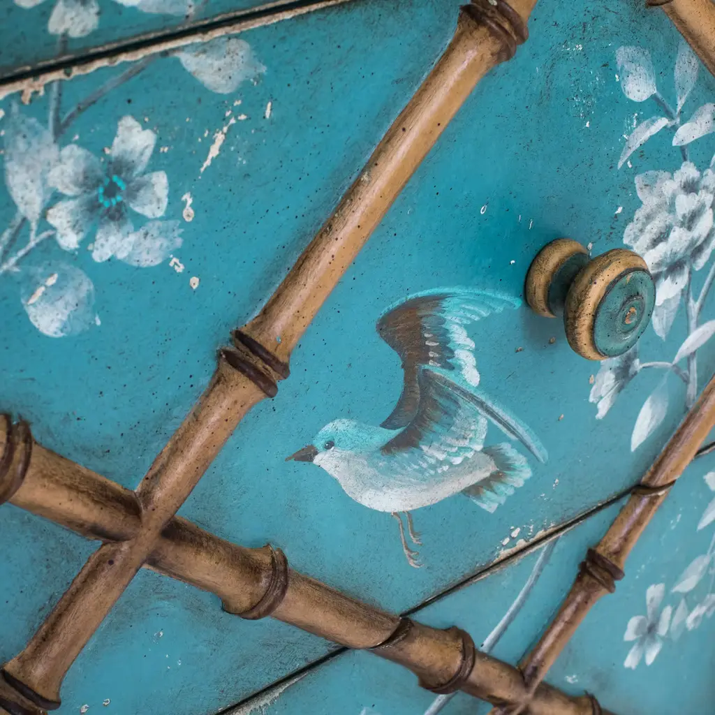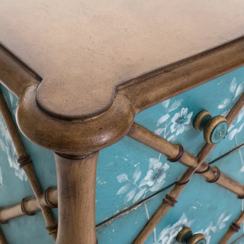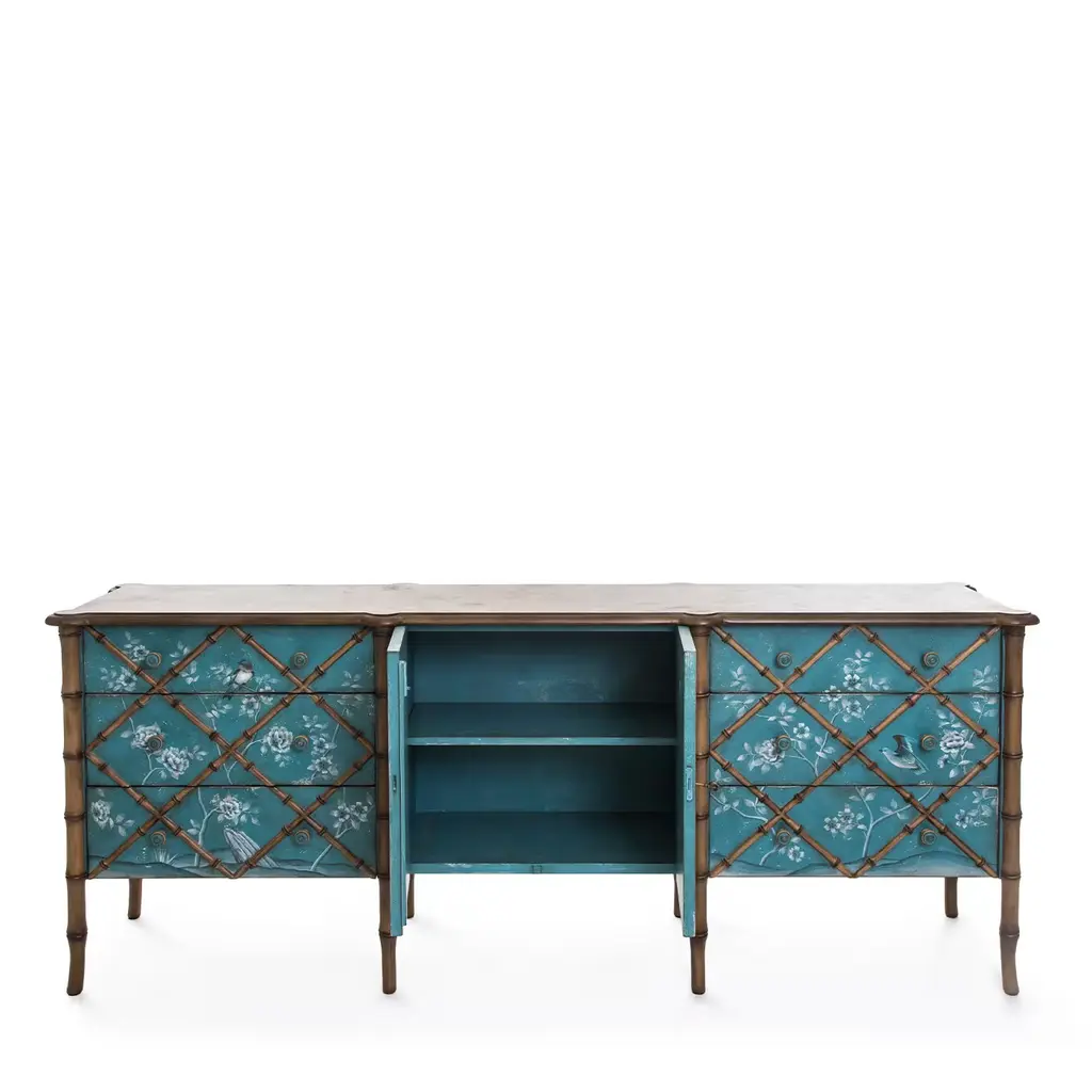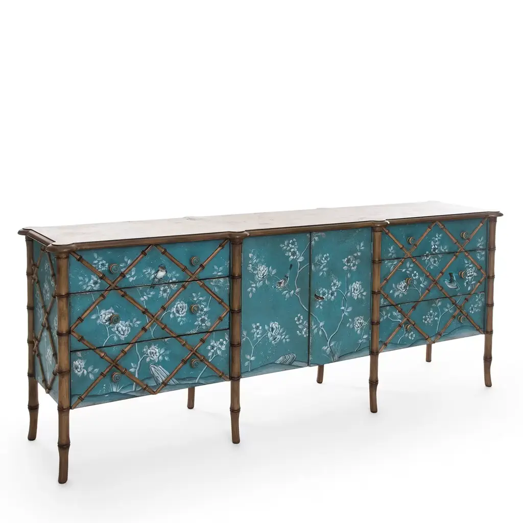 This flattering wooden sideboard with six drawers and two hinged doors boasts a lively, white floral motif set against a turquoise background. Crafted and hand-decorated in impeccable Venetian style by master artisans, it stands out for the bamboo cane-shaped legs, the same design also incorporated in the decoration gracing the storage unit's profile. The piece is entirely customizable and an extra protective layer can be applied to the top, please contact the Concierge for details.