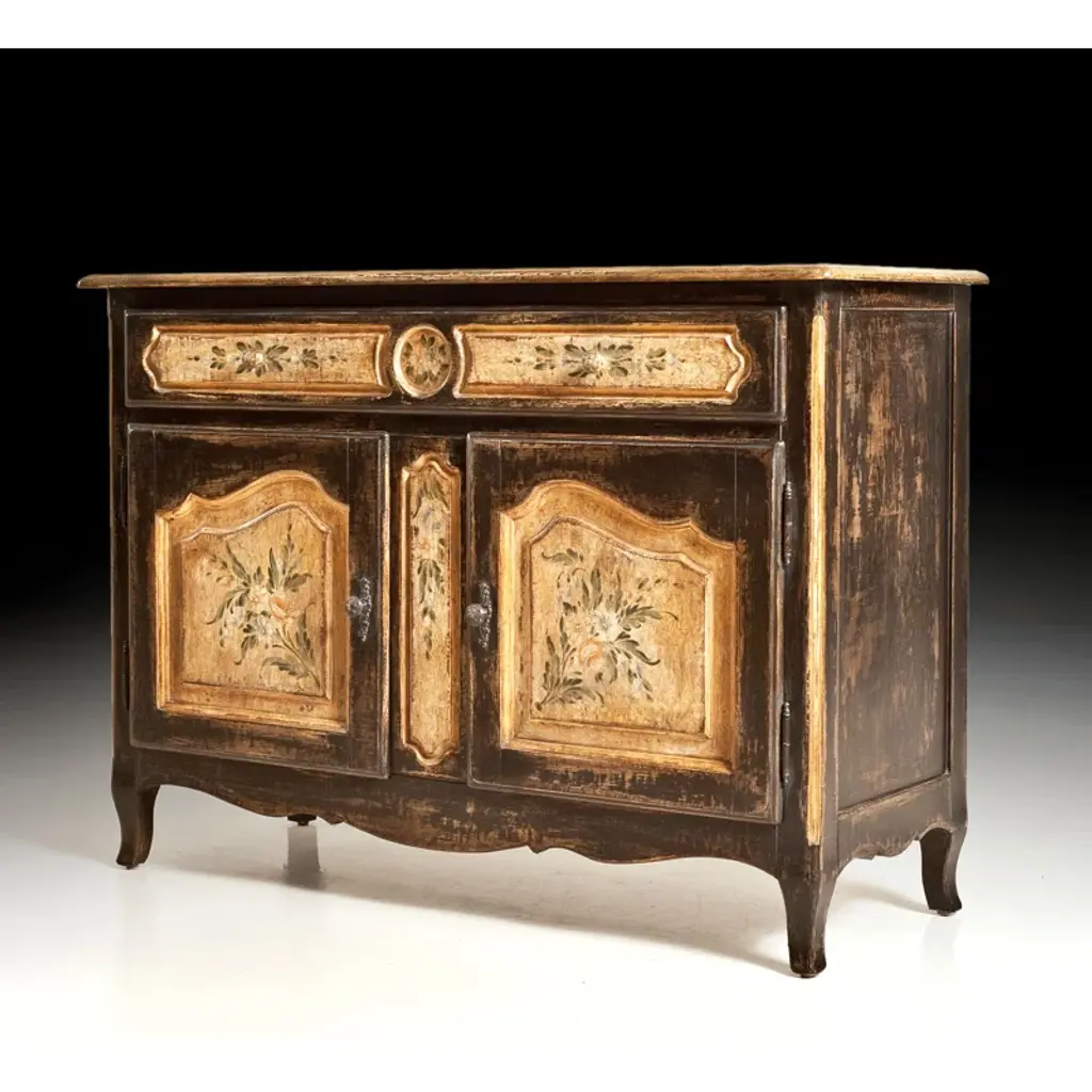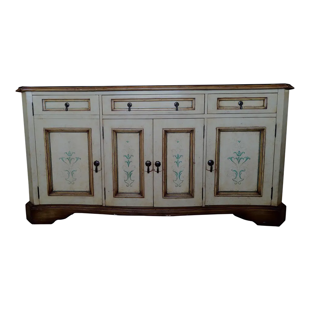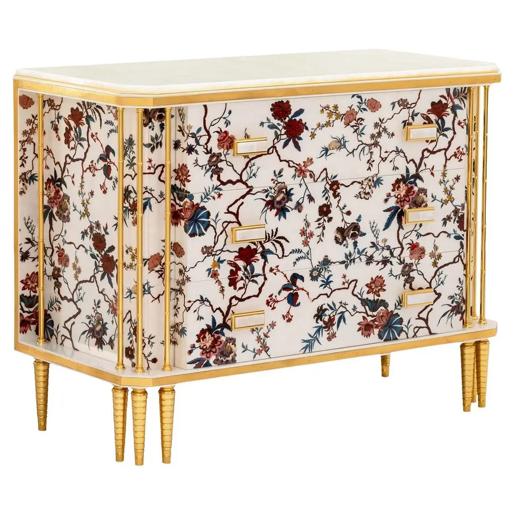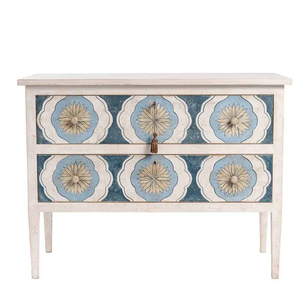This flattering wooden sideboard with six drawers and two hinged doors boasts a lively, white floral motif set against a turquoise background. Crafted and hand-decorated in impeccable Venetian style by master artisans, it stands out for the bamboo cane-shaped legs, the same design also incorporated in the decoration gracing the storage unit's profile. The piece is entirely customizable and an extra protective layer can be applied to the top, please contact the Concierge for details.