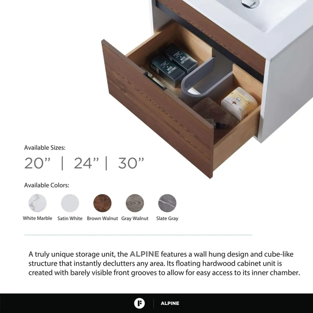 A truly unique storage unit, the Alpine features a wall hung design and cube-like structure that instantly declutters any area. Its floating hardwood cabinet unit is created with barely visible front grooves to allow for easy access to its inner chamber. Innovatively providing a spacious inner cavity, the space saving design opens to reveal a single drawer. Ideal for contemporary and industrial design themes, the wood and quartz combinations in fabulous color tones provide luxurious elements in bathroom decor.