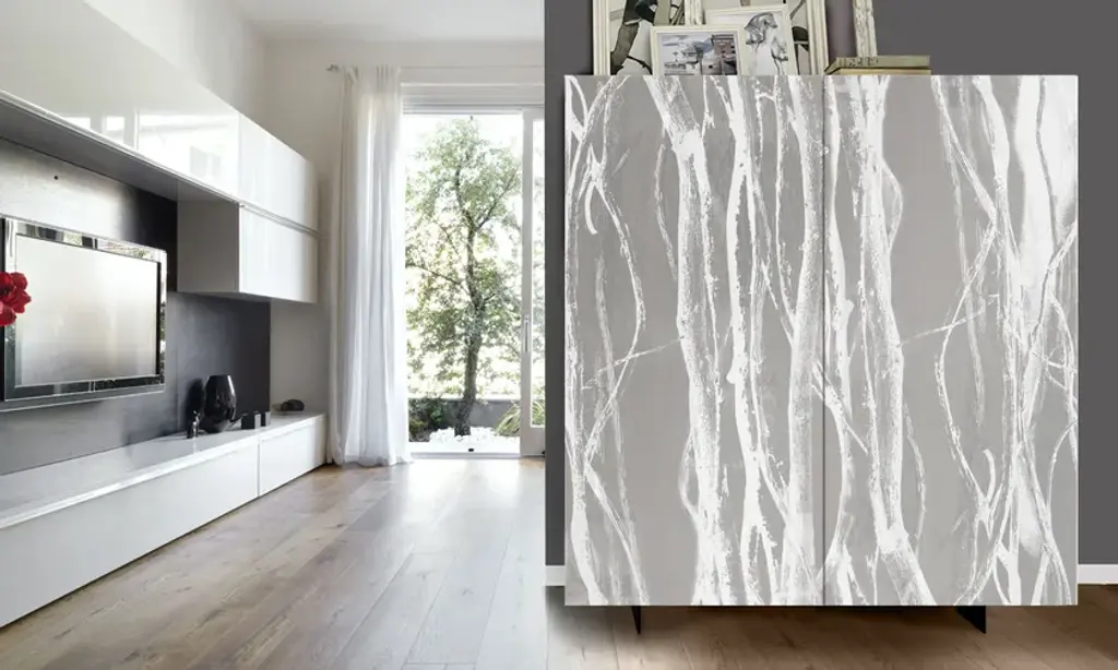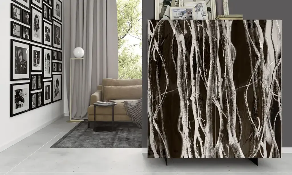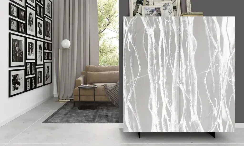 Forest is an hightboard with sides and doors in melamine faced MDF, thickness 19 mm worked at 45. Top, bottom, back and shelves in 19 mm thick melamine faced chipboard. “CARB2/TSCA Title VI-Attestation" and FSC certification. Doors closing with cushioned hinges. The storage unit comes with graphite grey varnished metal pedestal and two adjustable shelves. Digitally printed graphics with protective water-based varnish. Exterior and interior lacquered with water-based varnish recalling the predominant color of the graphics. The cabinet is supplied assembled with suitable cardboard packaging.