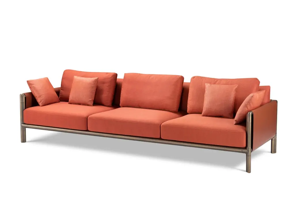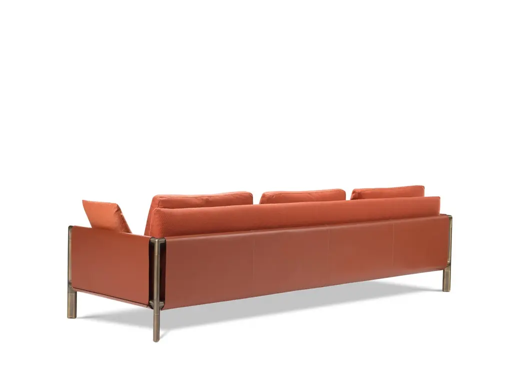 Stefano Giovannoni designs Frame for GHIDINI1961, a new collection composed of sofas, armchairs, dining and coffee tables, bookshelves and cabinets. Everything starts from a simple element: "the joint", which, combined with elegant rounded 45 degrees extrusions, creates an almost infinite family.The collection is characterized by organic junctions that – in their possible combinations – create minimal, compact and powerful structures. Frame is built starting from few elements that are able to create a large family with essential lines. Small tables and storage units are played with different materials, such as glass, wood and marble, while the sofa has a leather structure and fabric cushions.Structure: Base in painted and strapped metal. Backrest in rubber in different densities with plywood panel. Cushions: Back cushions in high grammage wadding with internal rubber insert. Seat cushions in polyurethane rubber of different densities. Side and back sides in natural cuoio leather. Covers: All covers are completely removable for both fabric and leather versions. Base: The sofa and armchair is based on the Frame family of castings. The frame castings are made of Italian alluminium, die casted in-house at Ghidini1961. Polished manually, and lacquered with transparent finish to guarantee a longlasting durability.Additional Information:Materials: Brass, cuoio and fabric Legs Finish: Brown burnished brassDimensions: W 280 x D 90 x H 78 cmAvailable in other upholstery options: Nabuk leather, cuoio and nappa leather, cuoio and natural learther, cuoio and velvet Available in other finish option: Polished brass, satin brass, light burnished brass, dark burnished brass, black goldAvailable in 2-seater sofa version