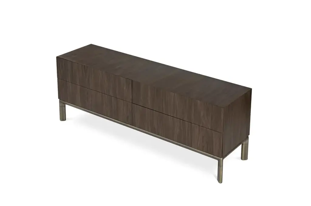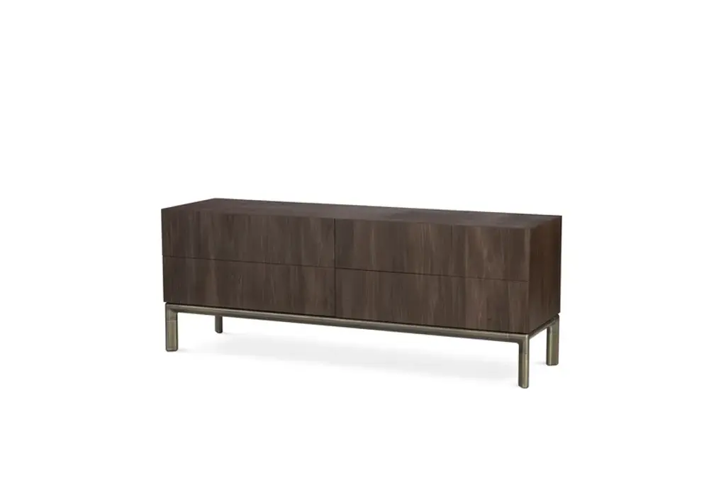 Frame Dining CabinetStructure33x60mm oval tubular in aluminium with die-cast corners. Galvanic finish in polished brass, or satin brass and painted burnished brass. Dark Tulip Wood veneered melamine container, matte acrylic polish.InteriorInterior shelving and internal bases covered in natural leather. Opening with internal push system.Stefano Giovannoni designs Frame for GHIDINI1961, a new collection composed of sofas, armchairs, dining and coffee tables, bookshelves and cabinets.Everything starts from a simple element: "the joint", which, combined with elegant rounded 45 degrees extrusions, creates an almost infinite family.The collection is characterized by organic junctions that – in their possible combinations – create minimal, compact and powerful structures.Frame is built starting from few elements that are able to create a large family with essential lines.Small tables and storage units are played with different materials, such as glass, wood and marble, while the sofa has a leather structure and fabric cushions.