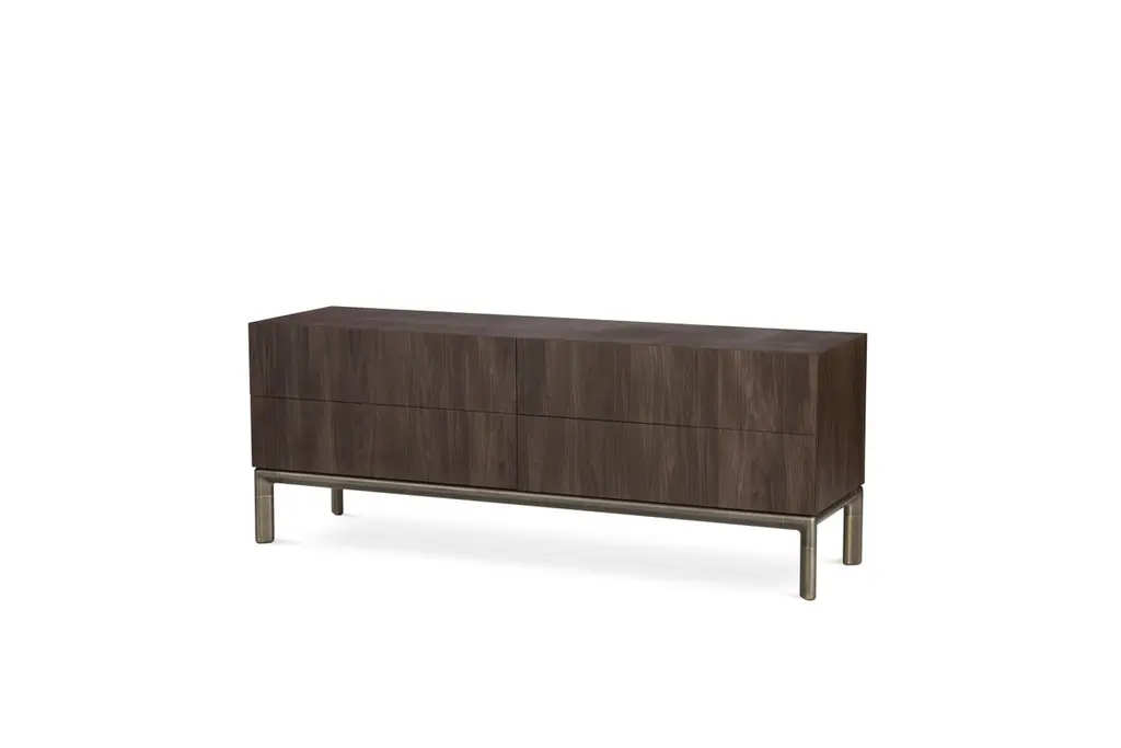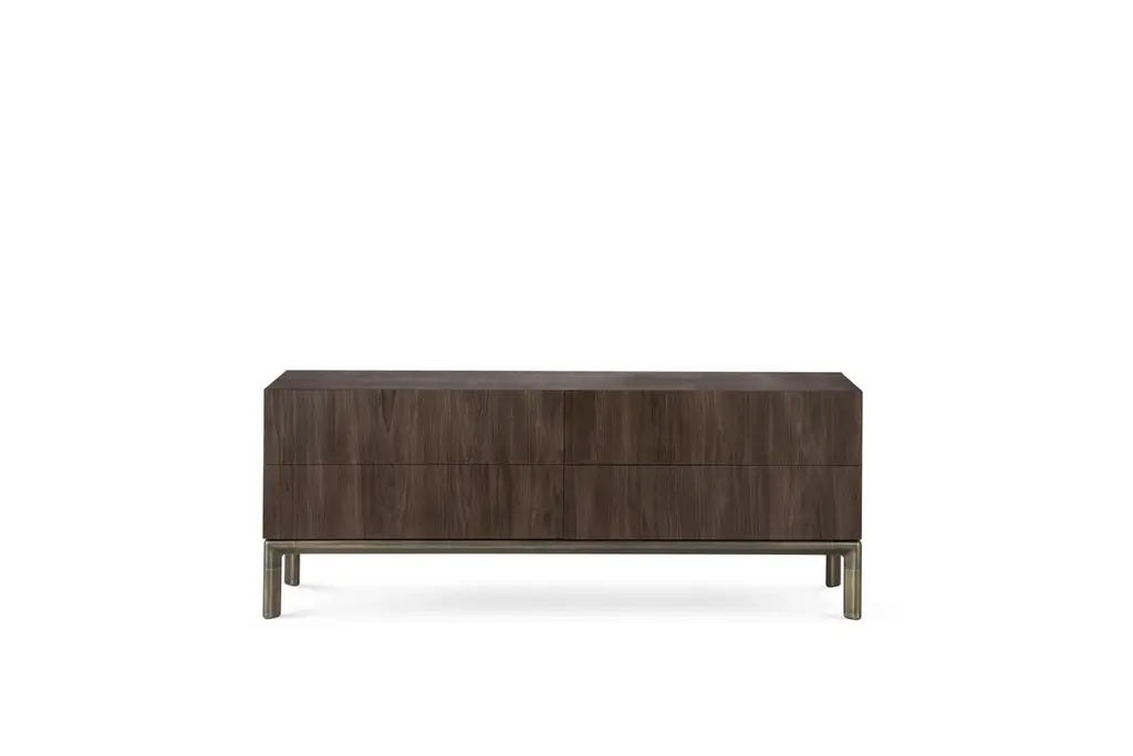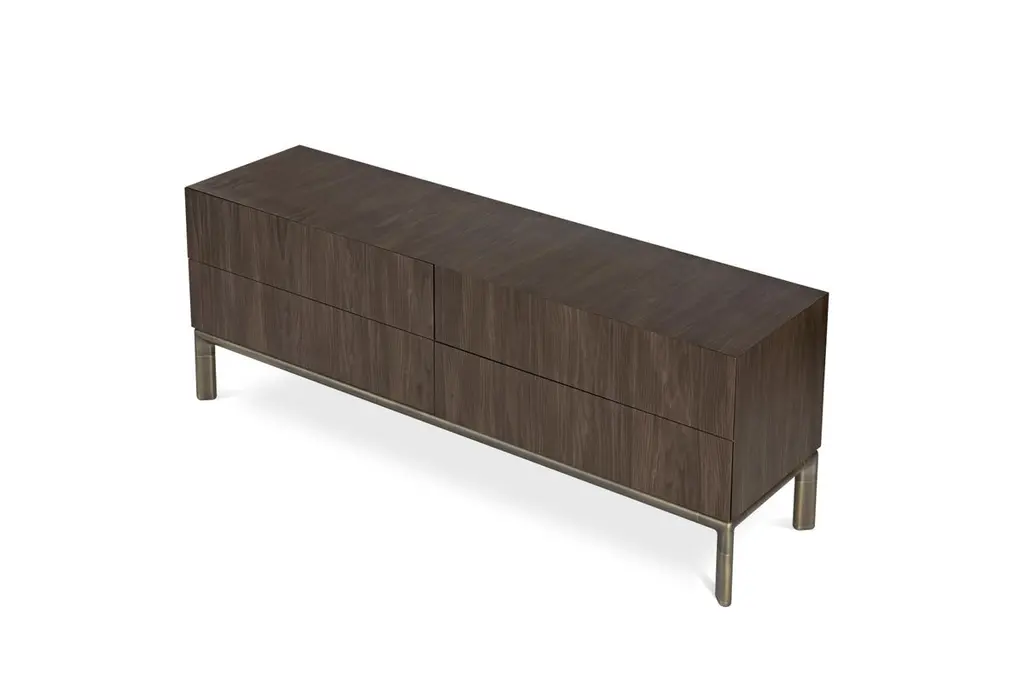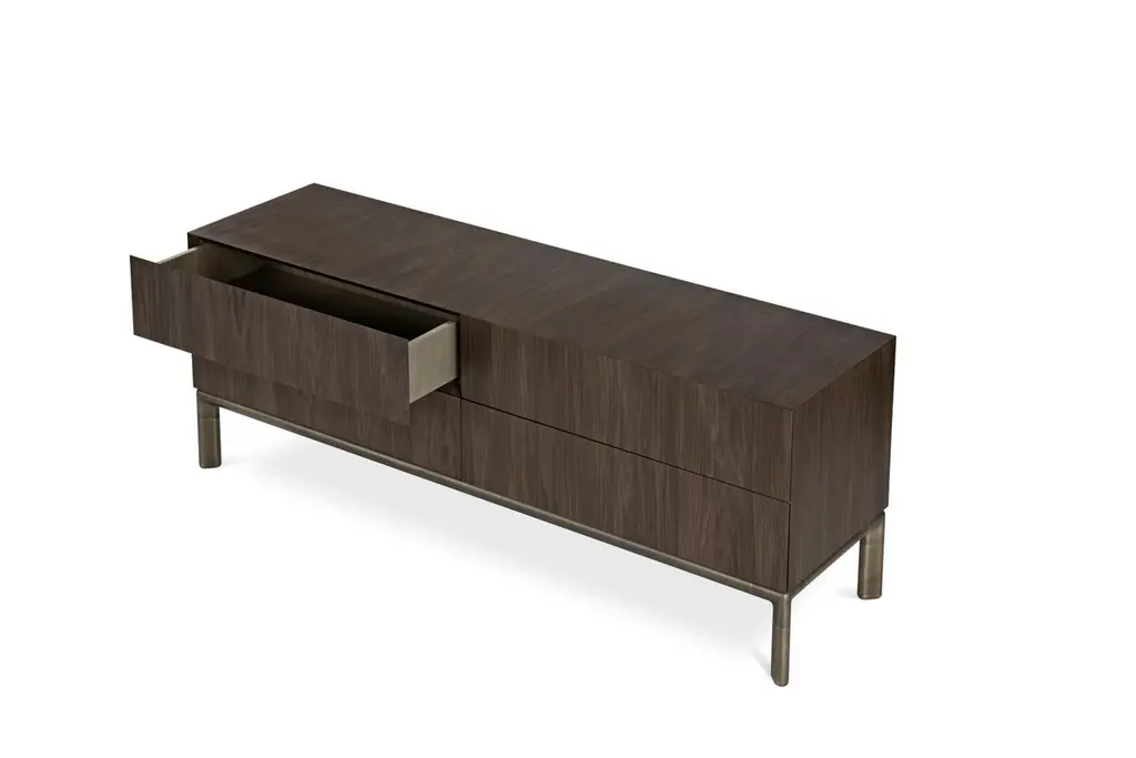 Stefano Giovannoni designs Frame for GHIDINI1961, a new collection composed of sofas, armchairs, dining and coffee tables, bookshelves and cabinets. Everything starts from a simple element: "the joint", which, combined with elegant rounded 45 degrees extrusions, creates an almost infinite family.The collection is characterized by organic junctions that – in their possible combinations – create minimal, compact and powerful structures. Frame is built starting from few elements that are able to create a large family with essential lines. Small tables and storage units are played with different materials, such as glass, wood and marble, while the sofa has a leather structure and fabric cushionsStructure: 33x60mm oval tubular in aluminium with die-cast corners. Galvanic finish in polished brass, or satin brass and painted burnished brass. Dark Tulip Wood veneered melamine container, matte acrylic polish.Interior: Interior shelving and internal bases covered in natural leather. Opening with internal push system.Additional Information:Material: Brass, bolivar woodFinish: Brown burnished brassDimensions: W 270 x D 50 x H 69 cmAvailable in other wood finish option: Striped oak, canaletto walnut, mahogany, new lime, caleidoAvailable in other finish options: Polished brass, light burnished brass, satin brass, dark burnished brass, black gold
