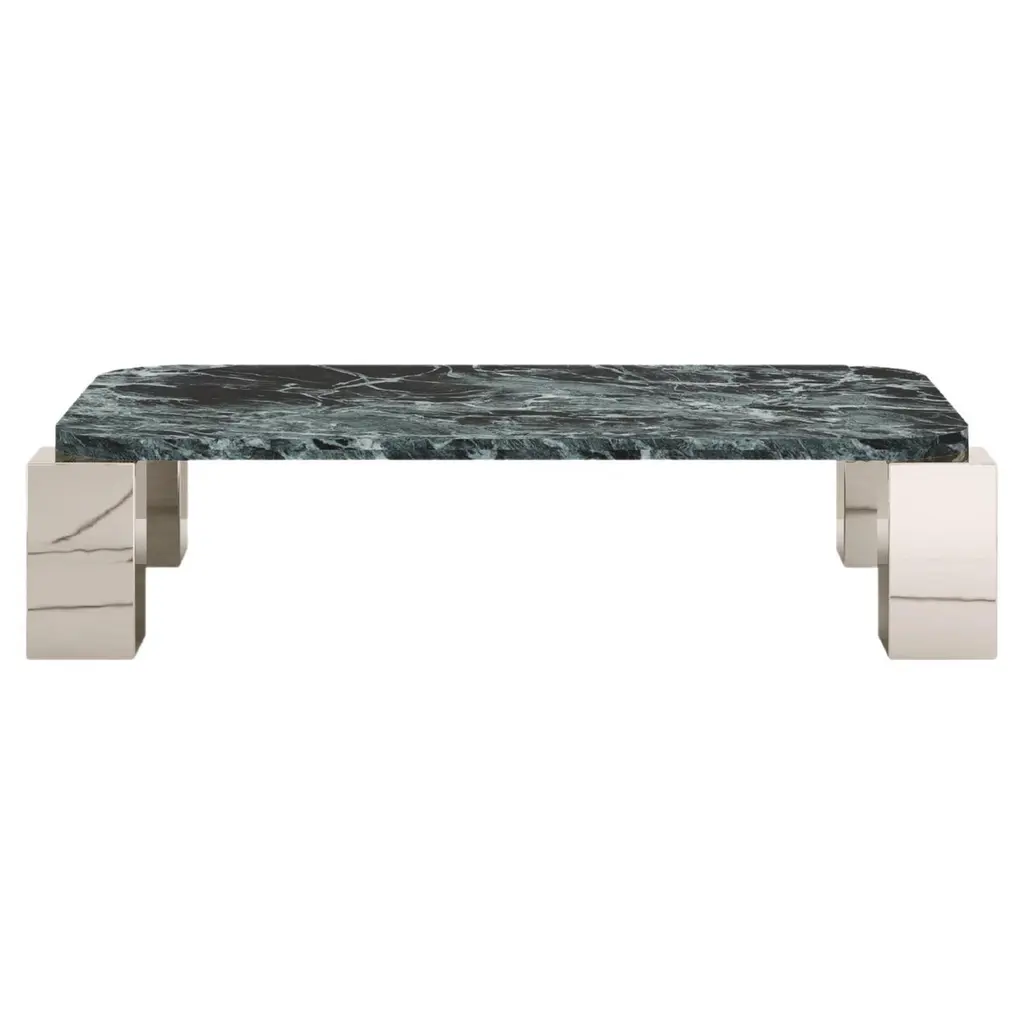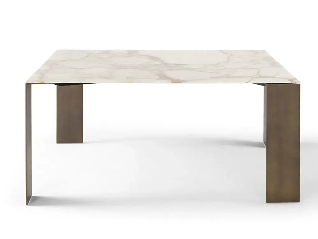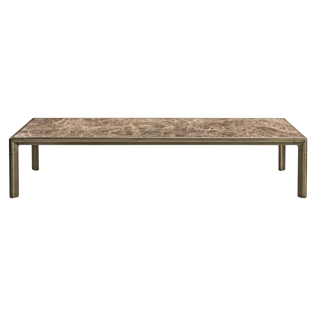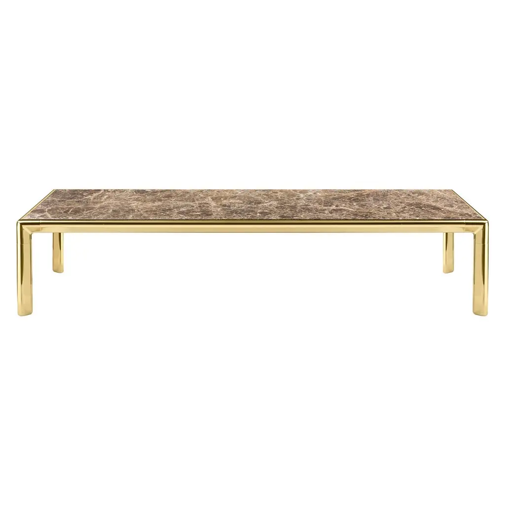 Stefano Giovannoni designs Frame for GHIDINI1961, a new collection composed of sofas, armchairs, dining and coffee tables, bookshelves and cabinets. Everything starts from a simple element: "the joint", which, combined with elegant rounded 45 degrees extrusions, creates an almost infinite family.The collection is characterized by organic junctions that – in their possible combinations – create minimal, compact and powerful structures. Frame is built starting from few elements that are able to create a large family with essential lines. Small tables and storage units are played with different materials, such as glass, wood and marble, while the sofa has a leather structure and fabric cushions.Structure: Die casted aluminium on the angular elements and tubular alluvium for the supporting structure on the perimeter.Top finishes: 20mm marble, 20mm wood, 20mm cuoio leather.Additional Information:Material: Brass, marbleFinish: Brown burnished brassTop: Calacatta gold marbleDimensions: W 150 x D 75 x H 37 cmAvailable in other size option: LargeAvailable in other top finish option: Cuoio leatherAvailable in other wood top finish options: Striped oak, canaletto walnut, bolivar, new lime, caleido, mahoganyAvailable in other marble top options: Carrara white, emperador dark, sahara noir, eramosa brownAvailable in other finish options: Satin brass, light burnished brass, polished brass, dark burnished brass, black gold