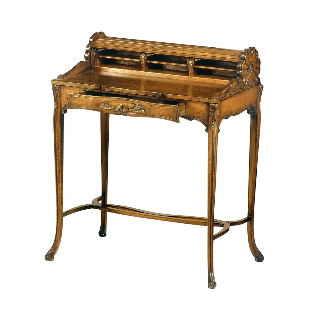 This bespoke writing desk exemplifies the fancy hand-carved aesthetic of Art Nouveau pieces. An impeccable reproduction of an original design from around 1880-1915, it is distinguished by a graceful beechwood silhouette equipped with a drawer that, when pulled, also reveals compartments in the roll storage unit with romantic flower-shaped sides.