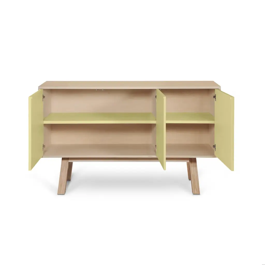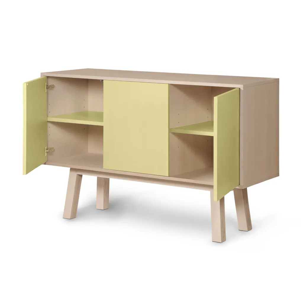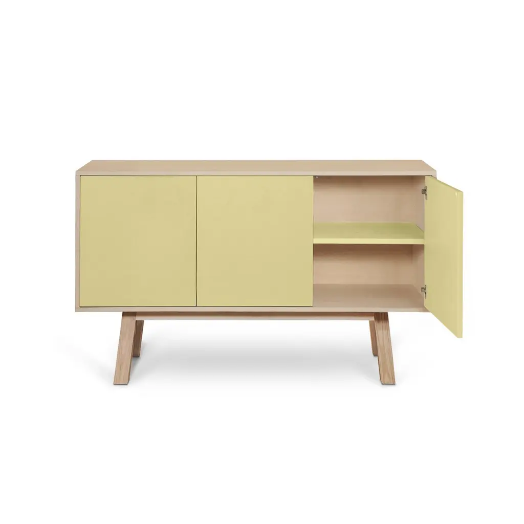 This 3-door sideboard is 100% made in France in oak, veneer oak and with lacquered doors in MDF panels. The 3 doors open with a "push-to-release" pressure. A vertical interior divider allows 2 independent storage units.An adjustable shelf in solid ash is placed behind the 2 doors and adjustable on (supplied) cleats.The shelf colour is identical to the doors' colour.collection ÉGÉEThis sideboard is part of the ÉGÉE collection designed by Eric Gizard in Paris. Eric combines the sleek and refined codes of Scandinavian design with natural materials and muted and "trendy" colorful lacquers.Mon Petit Meuble Francaisprovides you exclusively with 100% Made in France furniture pieces. The manufacture and finishes are of very high-end quality, carried out in French craft workshops, in the west countryside of France: Loire and Bretagne. The solid ash comes from sustainably managed French forests.