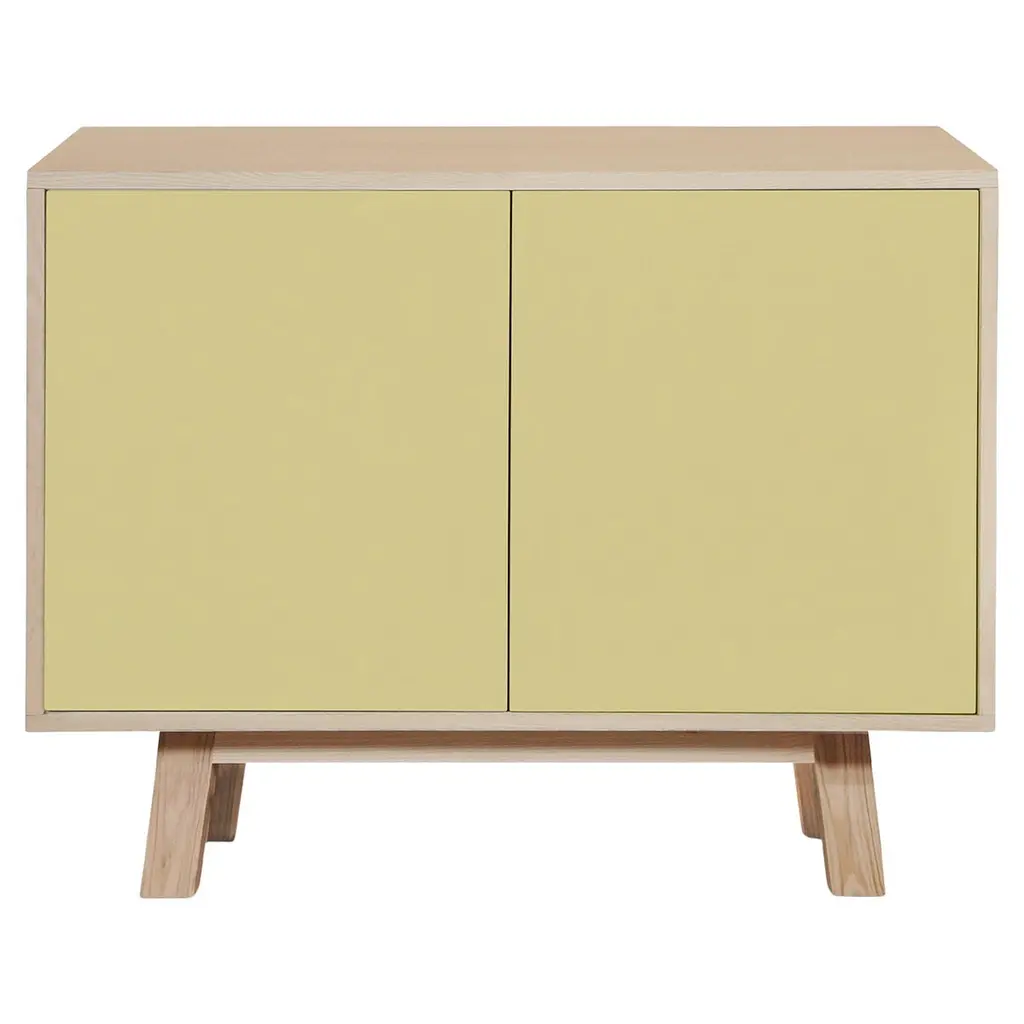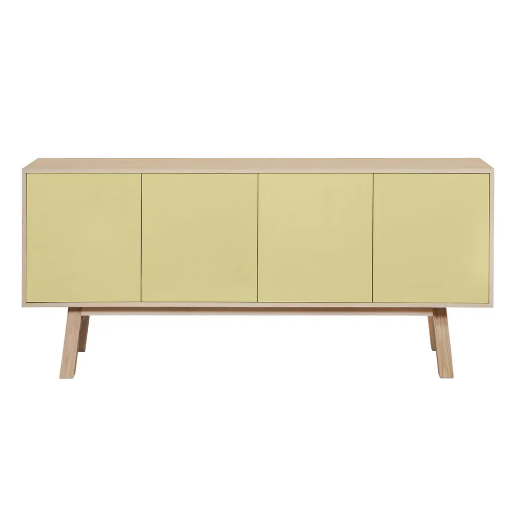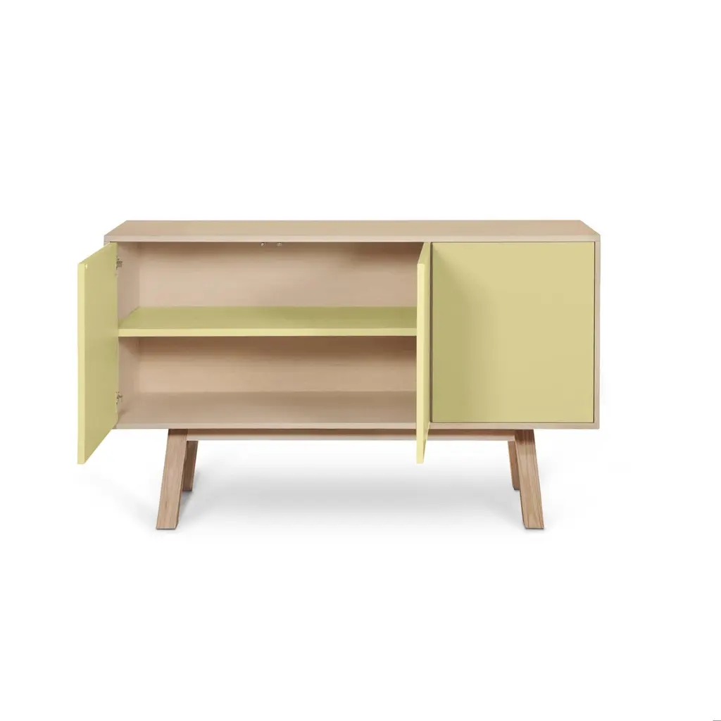 This 3-door sideboard is 100% made in France in oak, veneer oak and with lacquered doors in MDF panels. The 3 doors open with a "push-to-release" pressure. A vertical interior divider allows 2 independent storage units.An adjustable shelf in solid ash is placed behind the 2 doors and adjustable on (supplied) cleats.The shelf colour is identical to the doors' colour.collection ÉGÉEThis sideboard is part of the ÉGÉE collection designed by Eric Gizard in Paris. Eric combines the sleek and refined codes of Scandinavian design with natural materials and muted and "trendy" colorful lacquers.Mon Petit Meuble Francaisprovides you exclusively with 100% Made in France furniture pieces. The manufacture and finishes are of very high-end quality, carried out in French craft workshops, in the west countryside of France: Loire and Bretagne. The solid ash comes from sustainably managed French forests.