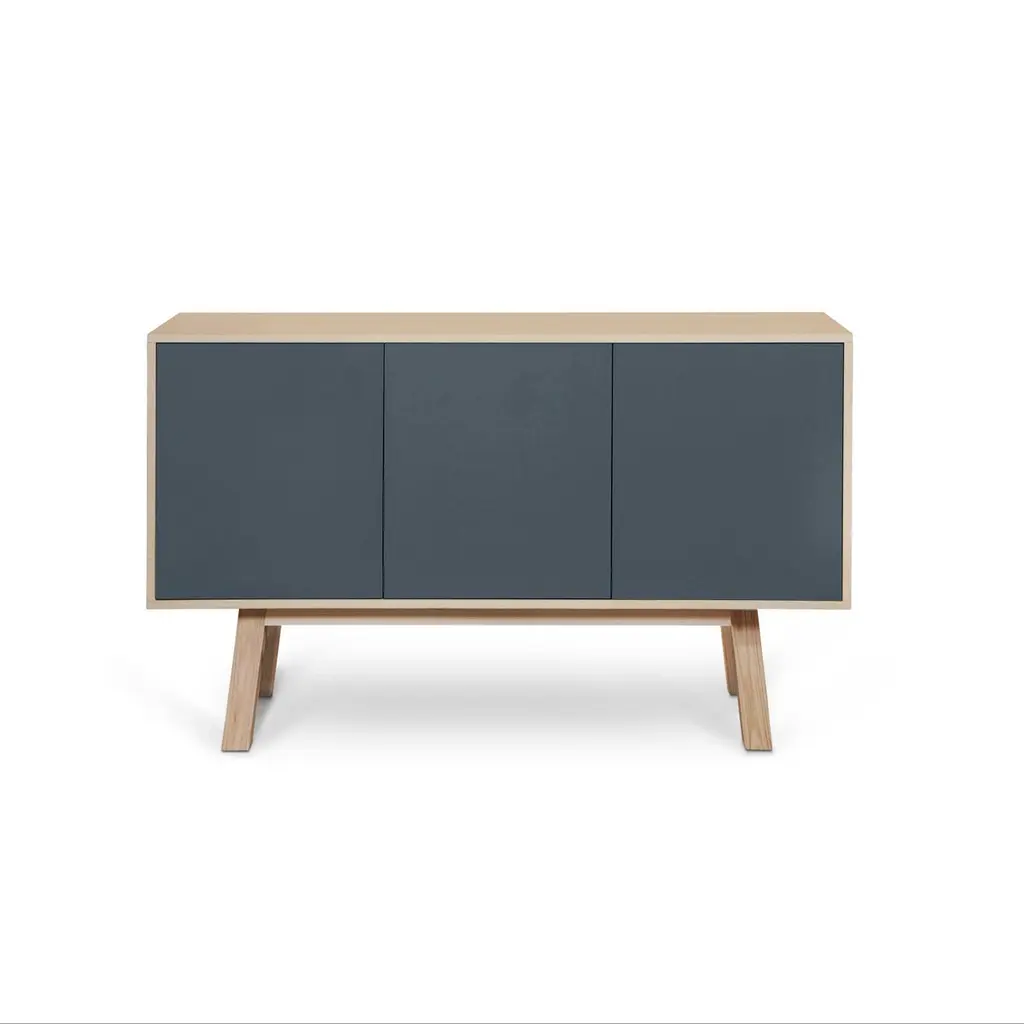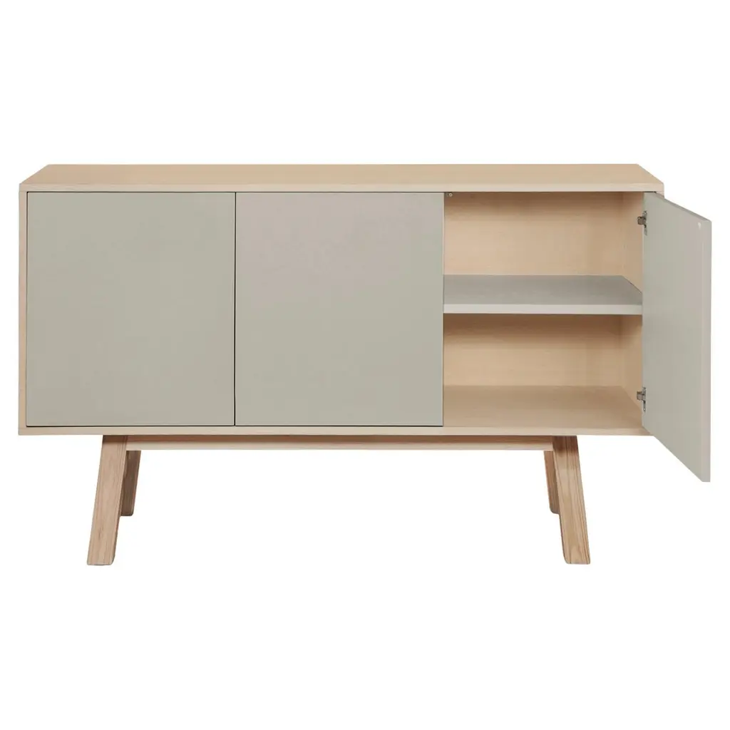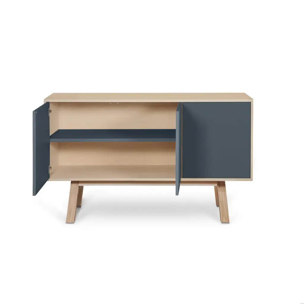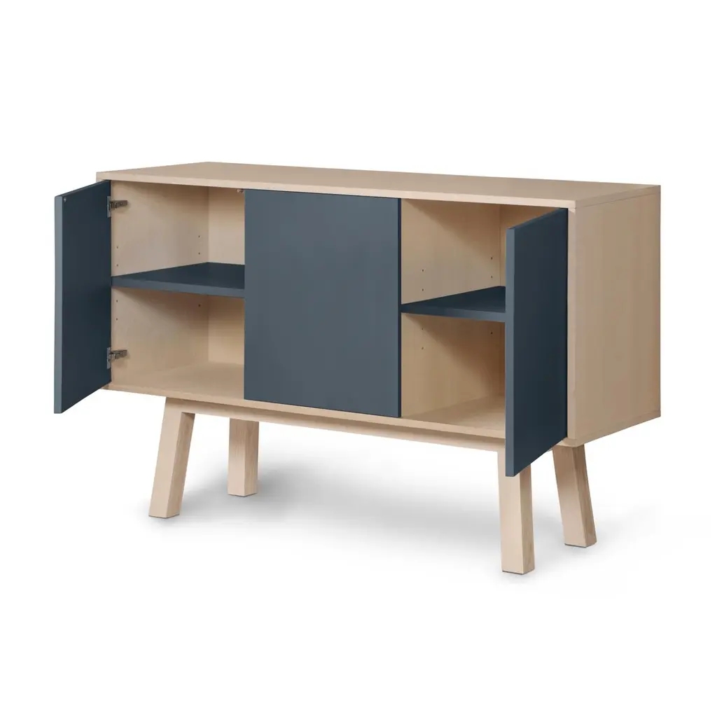 This 3-door sideboard is 100% made in France in oak, veneer oak and with lacquered doors in MDF panels. The 3 doors open with a "push-to-release" pressure. A vertical interior divider allows 2 independent storage units.An adjustable shelf in solid ash is placed behind the 2 doors and adjustable on (supplied) cleats.The shelf colour is identical to the doors' colour.collection ÉGÉEThis sideboard is part of the ÉGÉE collection designed by Eric Gizard in Paris. Eric combines the sleek and refined codes of Scandinavian design with natural materials and muted and "trendy" colorful lacquers.Mon Petit Meuble Francaisprovides you exclusively with 100% Made in France furniture pieces. The manufacture and finishes are of very high-end quality, carried out in French craft workshops, in the west countryside of France: Loire and Bretagne. The solid ash comes from sustainably managed French forests.
