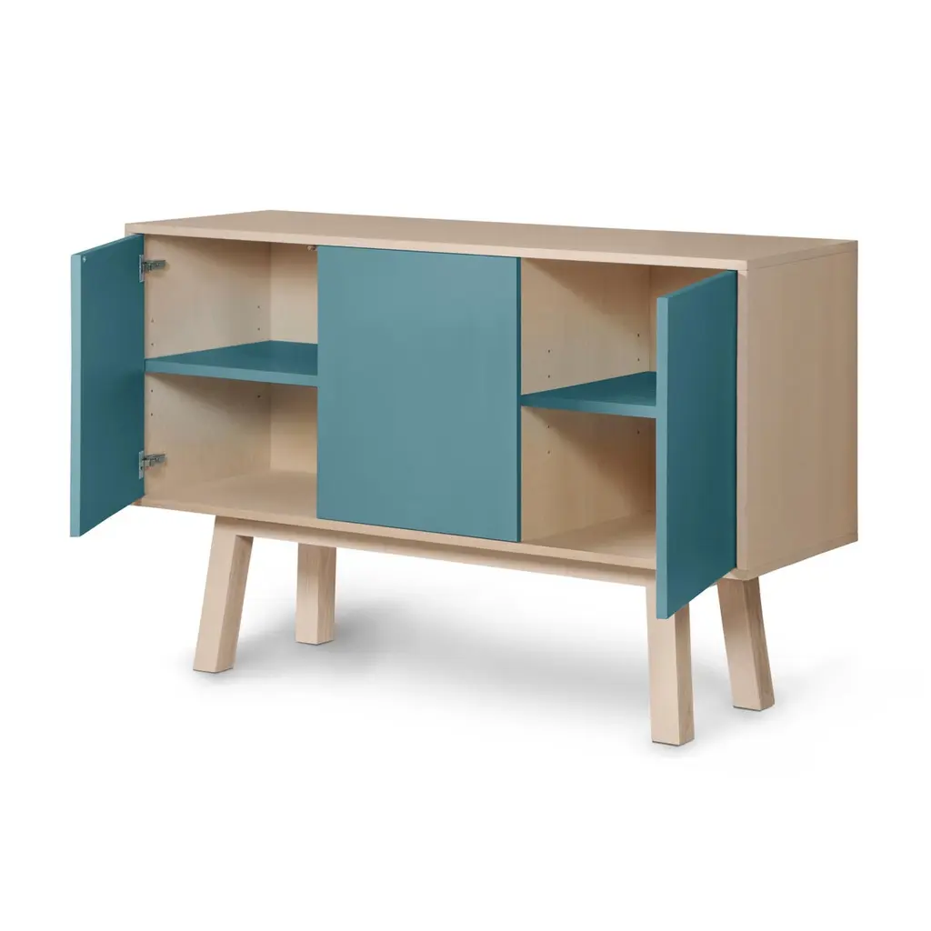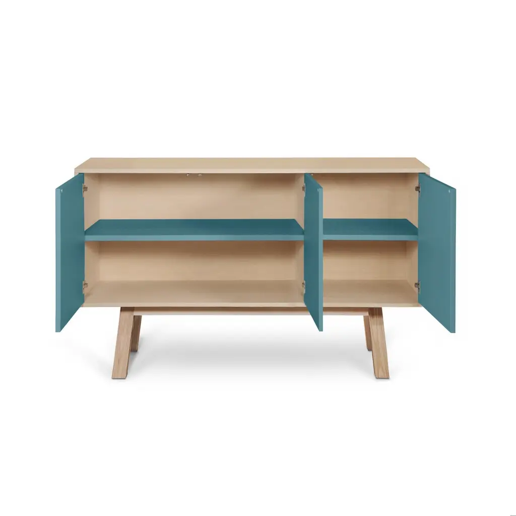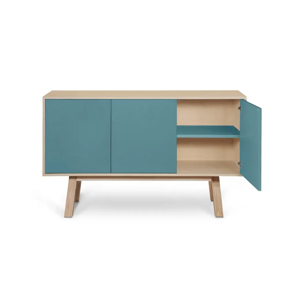 This 3-door sideboard is 100% made in France in oak, veneer oak and with lacquered doors in MDF panels. The 3 doors open with a "push-to-release" pressure. A vertical interior divider allows 2 independent storage units.An adjustable shelf in solid ash is placed behind the 2 doors and adjustable on (supplied) cleats.The shelf colour is identical to the doors' colour.collection ÉGÉEThis sideboard is part of the ÉGÉE collection designed by Eric Gizard in Paris. Eric combines the sleek and refined codes of Scandinavian design with natural materials and muted and "trendy" colorful lacquers.Mon Petit Meuble Francaisprovides you exclusively with 100% Made in France furniture pieces. The manufacture and finishes are of very high-end quality, carried out in French craft workshops, in the west countryside of France: Loire and Bretagne. The solid ash comes from sustainably managed French forests.