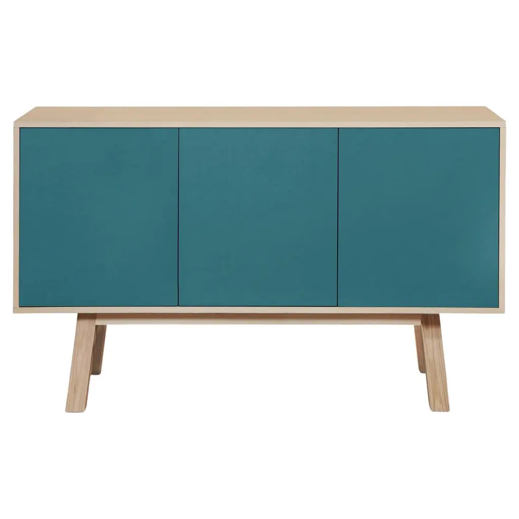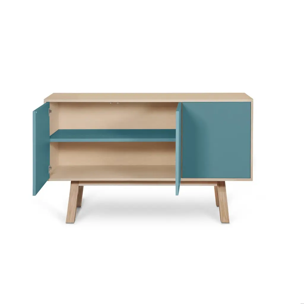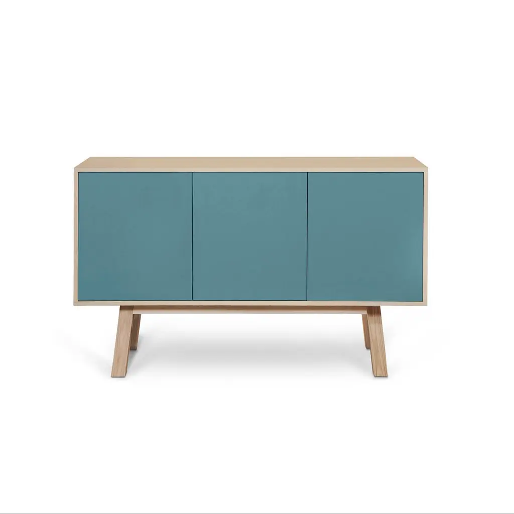 This 3-door sideboard is 100% made in France in oak, veneer oak and with lacquered doors in MDF panels. The 3 doors open with a "push-to-release" pressure. A vertical interior divider allows 2 independent storage units.An adjustable shelf in solid ash is placed behind the 2 doors and adjustable on (supplied) cleats.The shelf colour is identical to the doors' colour.collection ÉGÉEThis sideboard is part of the ÉGÉE collection designed by Eric Gizard in Paris. Eric combines the sleek and refined codes of Scandinavian design with natural materials and muted and "trendy" colorful lacquers.Mon Petit Meuble Francaisprovides you exclusively with 100% Made in France furniture pieces. The manufacture and finishes are of very high-end quality, carried out in French craft workshops, in the west countryside of France: Loire and Bretagne. The solid ash comes from sustainably managed French forests.