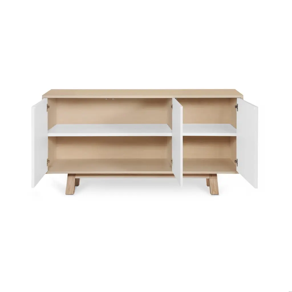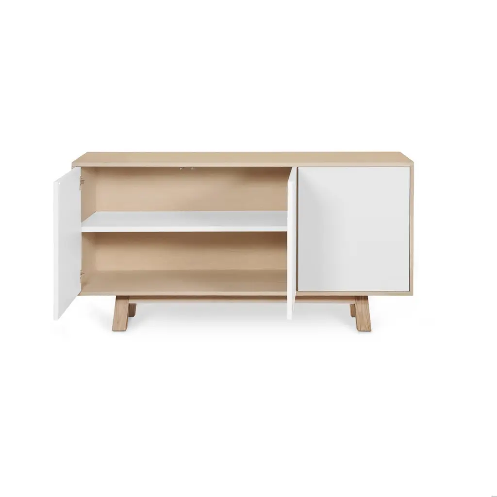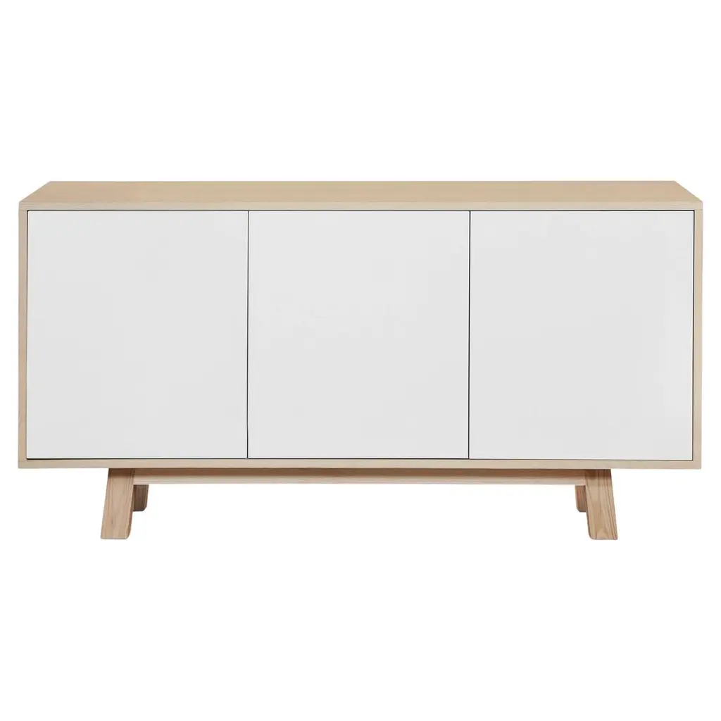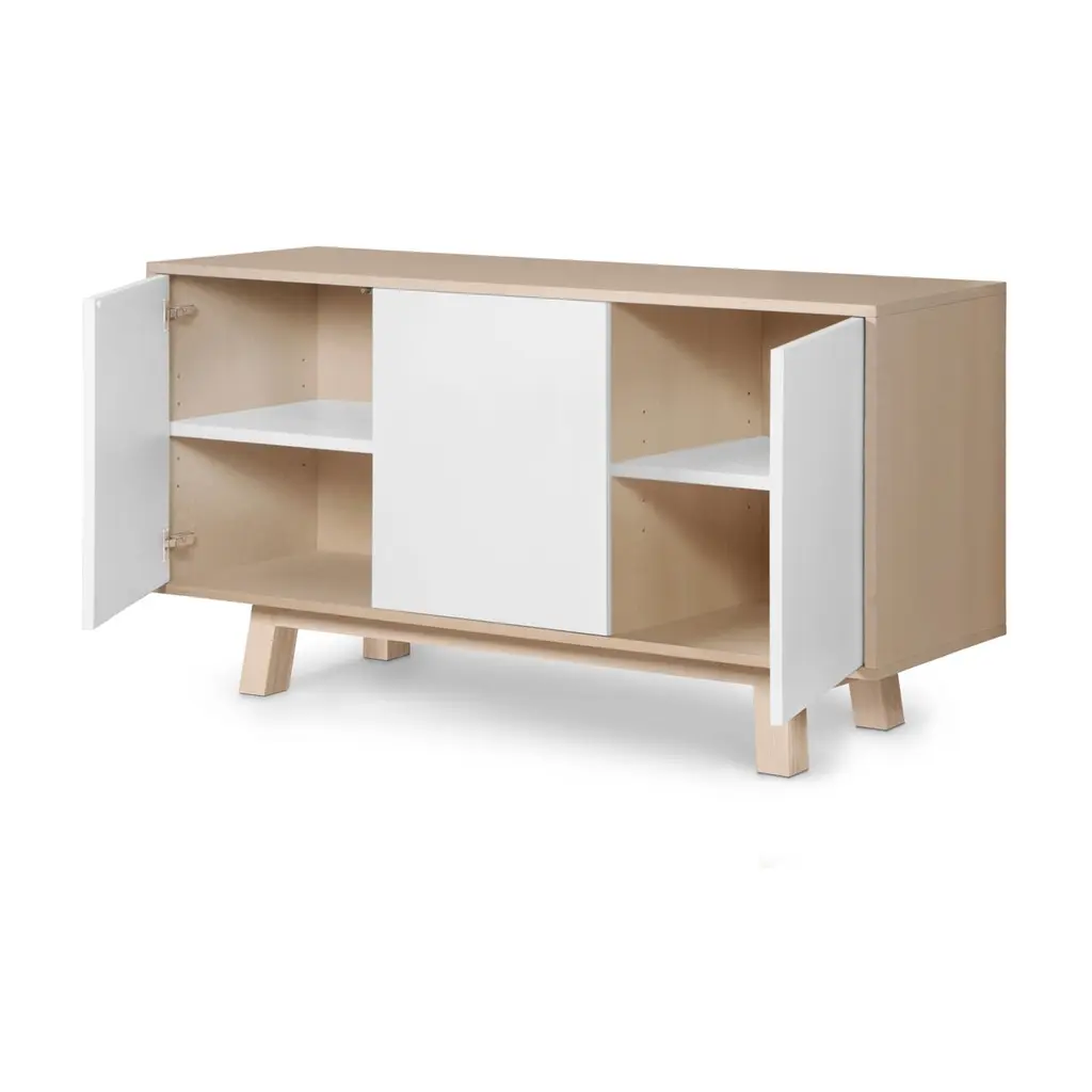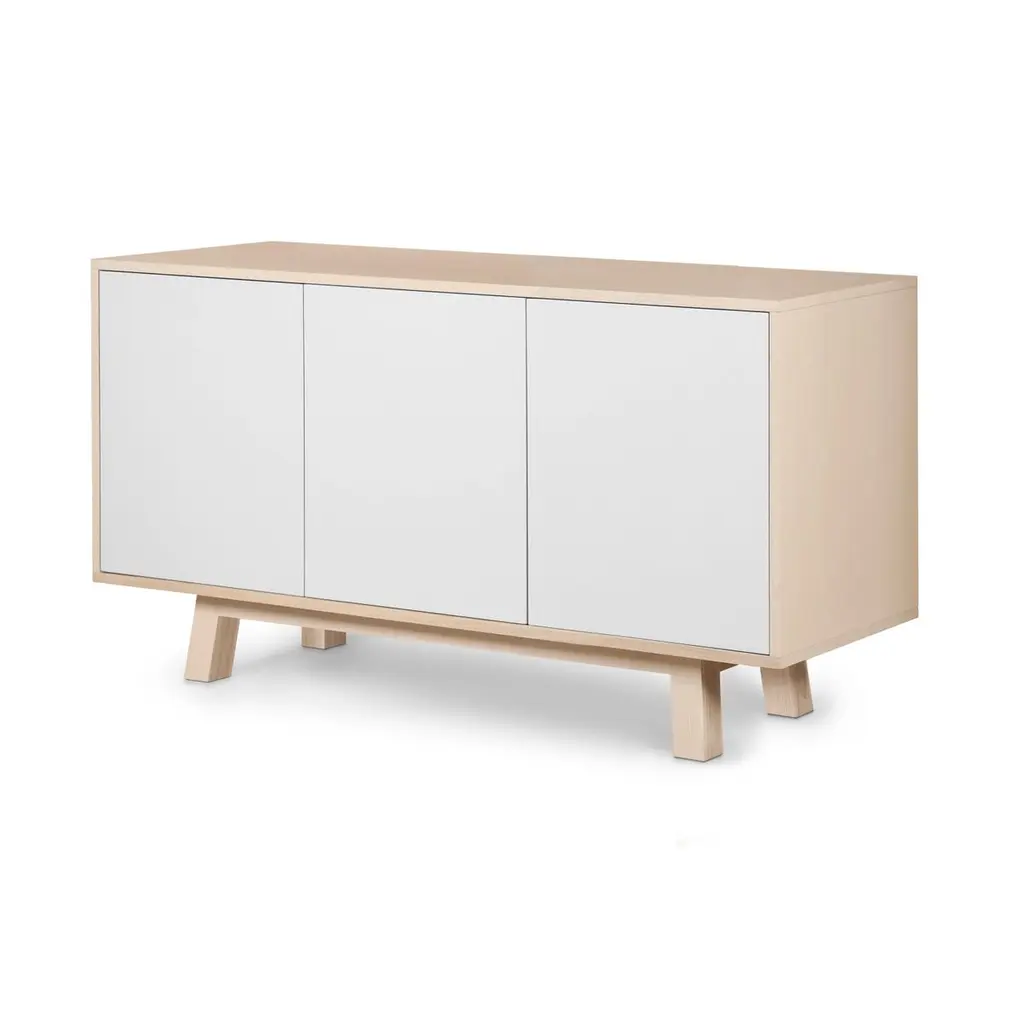 This 3-door sideboard is 100% made in France in oak, veneer oak and with lacquered doors in MDF panels. The 3 doors open with a "push-to-release" pressure. A vertical interior divider allows 2 independent storage units.An adjustable shelf in solid ash is placed behind the 2 doors and adjustable on (supplied) cleats.The shelf colour is identical to the doors' colour.collection ÉGÉEThis sideboard is part of the ÉGÉE collection designed by Eric Gizard in Paris. Eric combines the sleek and refined codes of Scandinavian design with natural materials and muted and "trendy" colorful lacquers.MON PETIT MEUBLE FRANCAISprovides you exclusively with 100% Made in France furniture pieces. The manufacture and finishes are of very high-end quality, carried out in French craft workshops, in the west countryside of France: Loire and Bretagne. The solid ash comes from sustainably managed French forests.