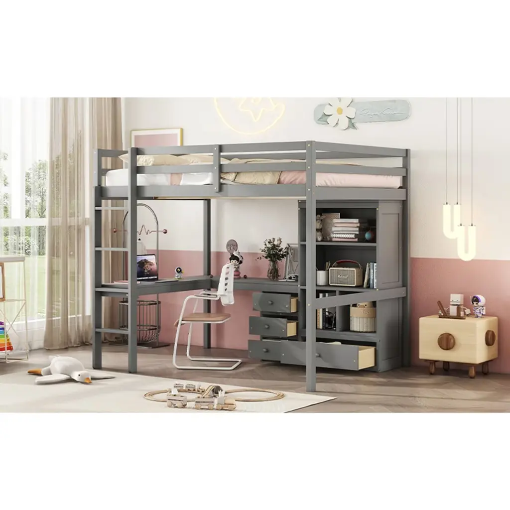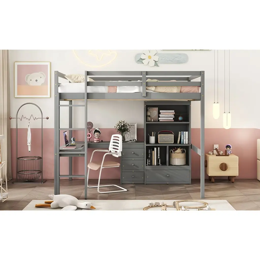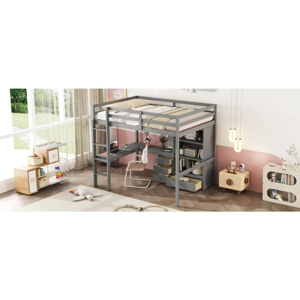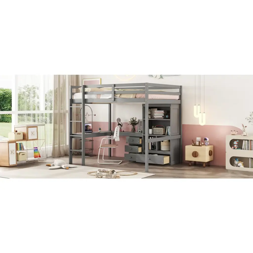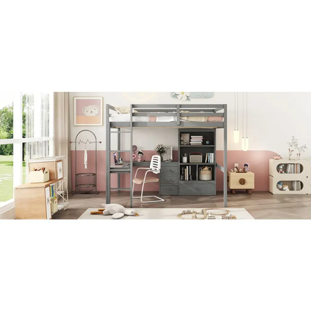 Full Size Loft Bed With Desk, Storage Shelves And Drawers
