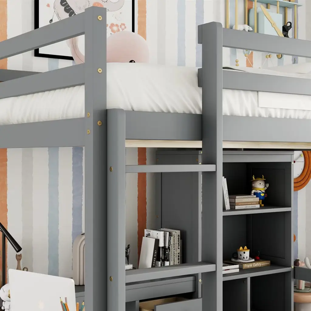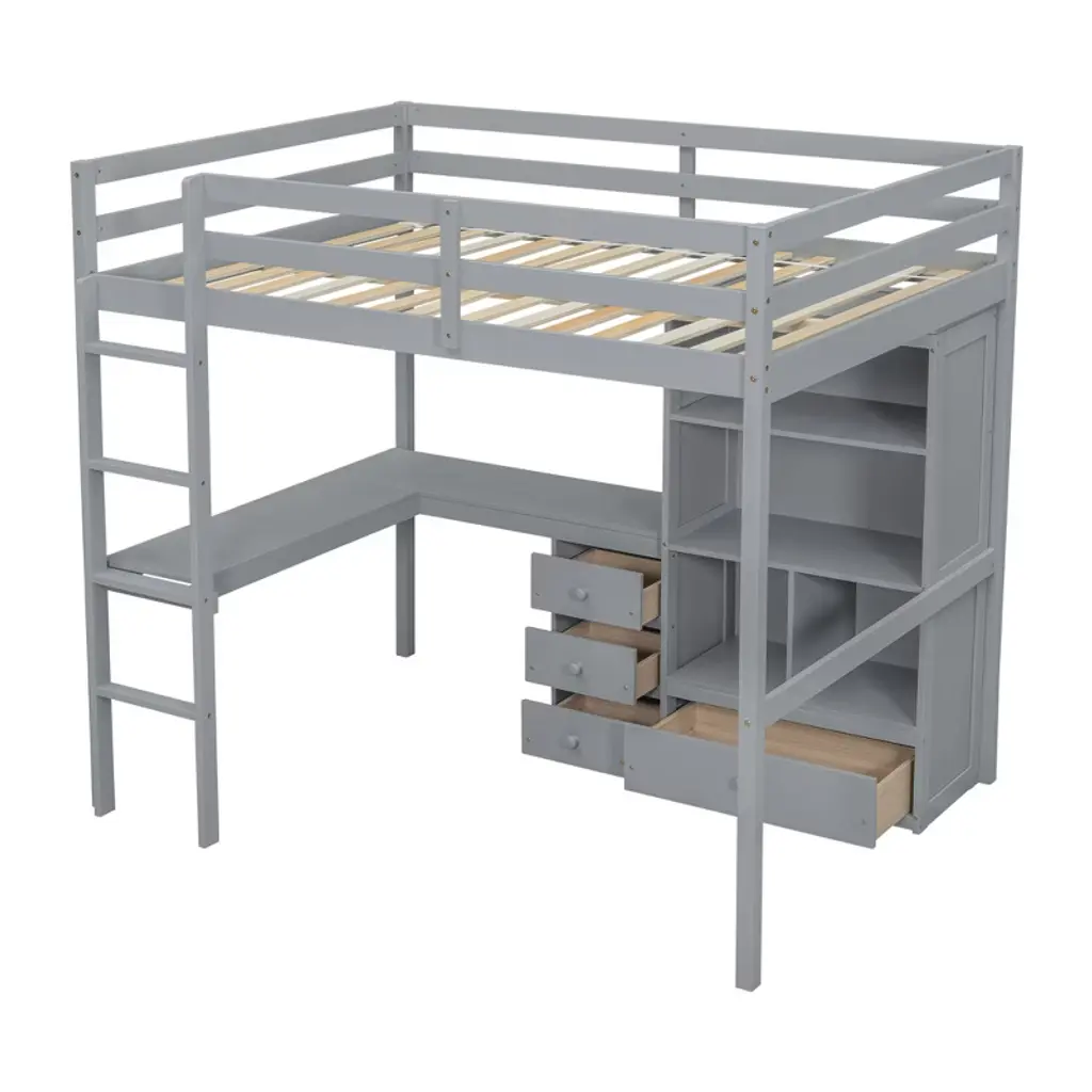 Product Features [Ample Space Storage] The capacious space under the high loft bed can be used to be a study and cozy space. It is the perfect place to be decorated with toys, handiwork and other accessories, maximizing the space and flexibility of your bedroom. The abundant space offers better organisation of storage space, allowing your bedroom to be neat and tidy.[Comprehensive Design] The high loft bed features a L-shaped desk offering a quiet, cozy place for reading and writing, while the storage combination including multi-tier bookshelves and 1 big drawer plus 3 small drawers with smooth sliders. In addition, the built-in ladder is designed with a safe and wider width to provide more spacious steps and solid support, facilitating effortless ascents and descents.[Safety and Quality Guaranteed] This loft bed is crafted mainly from premium pine wood, providing lasting sturdiness and durability. The loft bed platform is constructed with firmly secured structure of 14 slats, enhanced by a central lengthwise strengthened slat, forging strong stability that ensures the safety and stability. The high guardrails surrounding the upper bed will ensure extra protection.[Stylistic Elements] The bed exudes elegance through its contemporary and practical design of its structure, suiting interior designs of all, enabling the bed to merge perfectly into any scenario. Moreover, there are a variety of classic colours that you can choose from, which you believe suits your children’s bedroom the most.[Easy Assembly] This loft bed is delivered in two packages, along with an installation manual and full set of hardware necessary to guide you through the process of assembly, and this loft bed will definitely be assembled conveniently.Notice : Due to variations in lighting, equipment, weather conditions, and other factors, the colour tones of the products customers purchase may exhibit slight differences compared to the representations in the pictures or photos displayed in our store. Descriptions The full size loft bed combines bedroom and study into a cozy and lovely space. Under the upper bunk there are a built-in L-shaped desk ,storage shelves and drawers ,which provide children with a comfortable space to do homework, read and get books and daily items from the book-shelves very conveniently. The built-in ladder on the loft bed also adds amusement and physical activity. Description Product Type: Loft Bed with Built-in Desk£¬Storage Shelves and DrawersSize: FullMaterial (main): Pine + Plywood + PB + MDFNumber of Slats: Bed: 14 pcsSpring Box: No needAssembly Required: YesManual and Hardware: Yes Technical Details Overall Product Dimension: 79.5” x 58.8” x 72.0”Overall Product Weight: 207.2 lbsPackage Details: Please refer to the SpecificationBed Weight Capacity: Bed: 250 lbsSuggested Mattress Thickness: 6 inches or less