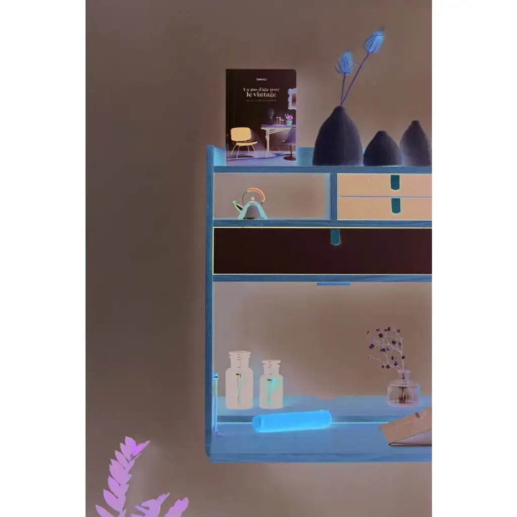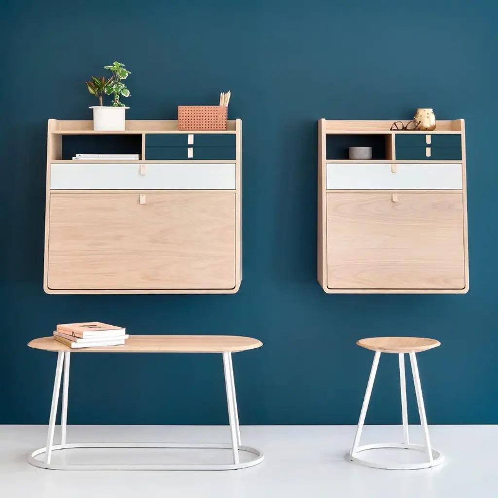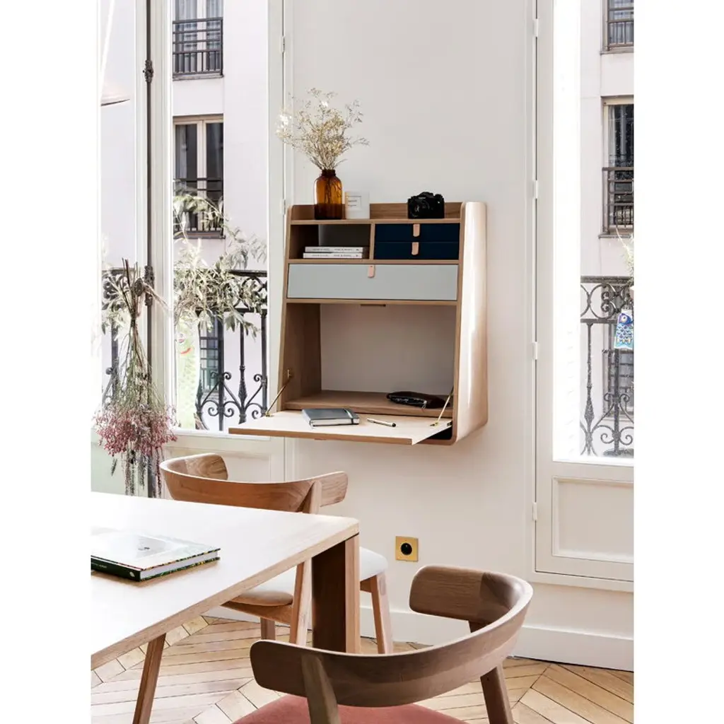 Hartô's Gaston wall desk will delight you with its versatility. The stylish storage unit can be used in its traditional role as a shelf or, more surprisingly, as a desk. The folding tabletop is easy to pull out and close when it is no longer needed. The Gaston wall desk is ideal for a smaller home office but also works well as additional wall space in the company's office. Shelves and three drawers ensure there's plenty of storage space for important papers, magazines and other small items. Designed by Florence Watine, Gaston's look is completed by the elegant leather pulls on the drawers.