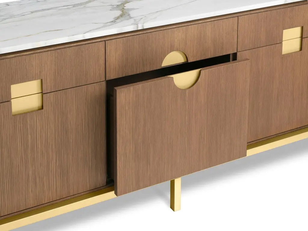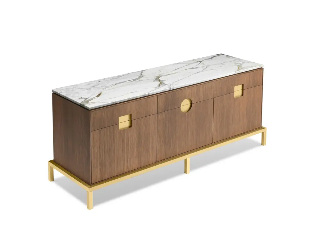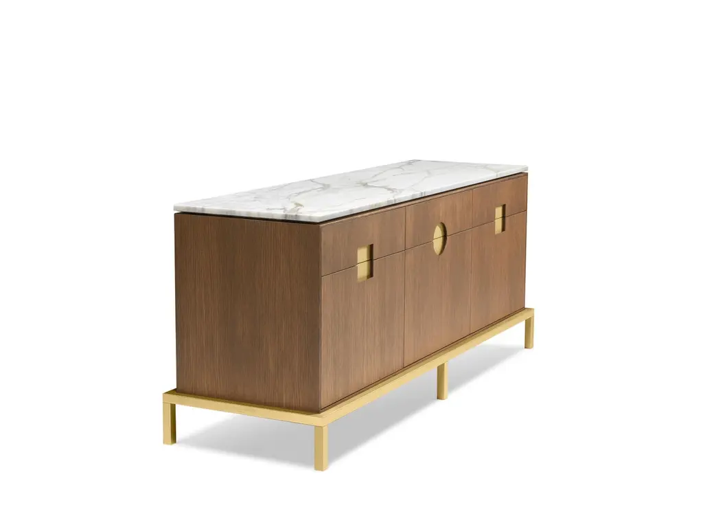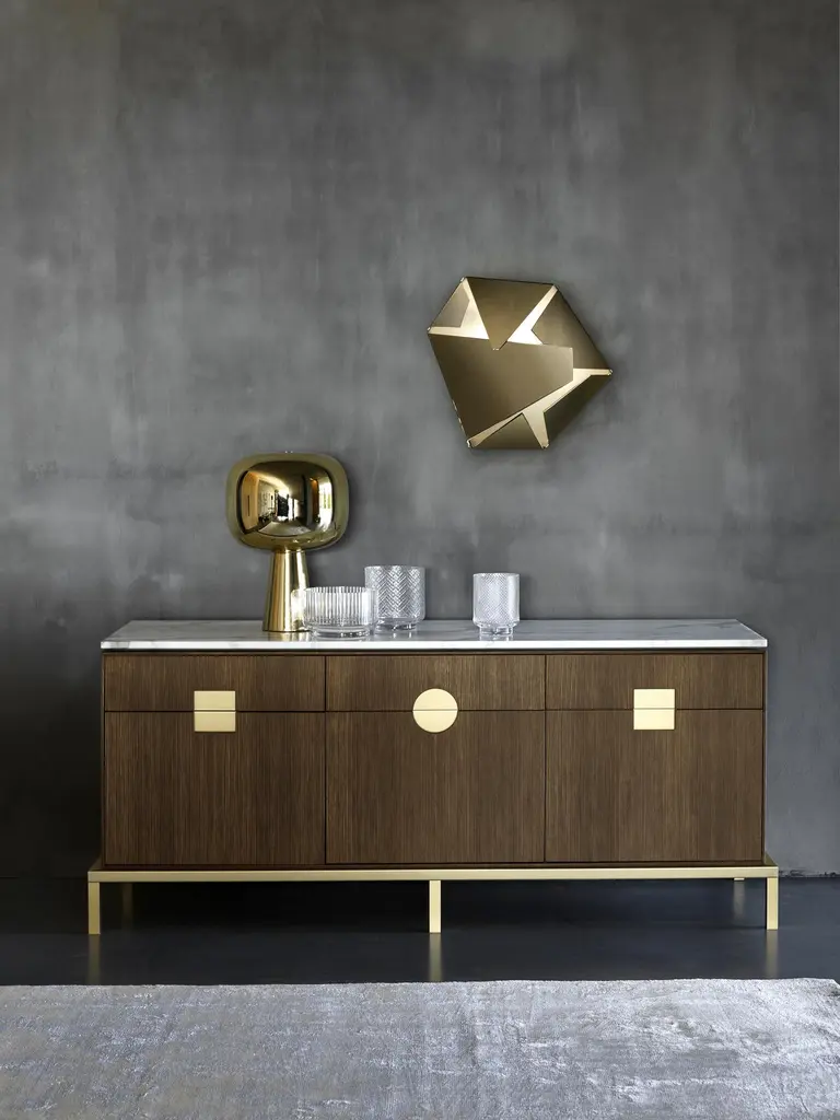 Elegant cabinet with essential lines of Japanese flavor. The slender structure in essence is opposed by four slim legs in gilded metal. Zuan is recognizable by the detail of the support, a quarter of a circle with great aesthetic and functionality, which defines the character of the storage unit. The central compartment, closed by essential brass handles, has shelves in Verde Alpi marble, a gesture of surprising refinement. The upper part of the cabinet is divided into four sections, in turn divided into smaller niches, drawn according to the golden proportion, inscribable in a perfect spiral. A wunderkabinet to exhibit our wonders.Different cultural needs and references in time and space are combined in the "Zuan" cabinet collection. The timeless classical Chinese cabinets and the 18th century English "chests" are revisited and updated. The single piece combines three materials in a variable and versatile way: brass, wood and marble. The brass for the support frames and partition walls, the wood for the containers and the marble for the support surfaces.The passionate quality of traditional cabinetmakers is supported by engineering in all production phases and by numerical control technologies, from the general scale to that of detail. The result is a product freed from fashions and boundaries.Additional information:Materials: Satin brass, oak and Calacatta marbleDimensions: W 184 x D 59 x H 78 cmAvailable in other finish options: Polished brass, light burnished brass, brown burnished brass, dark burnished brass, black gold.