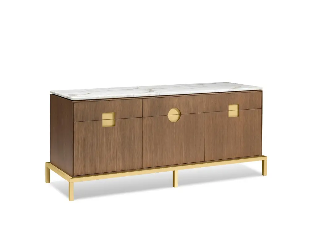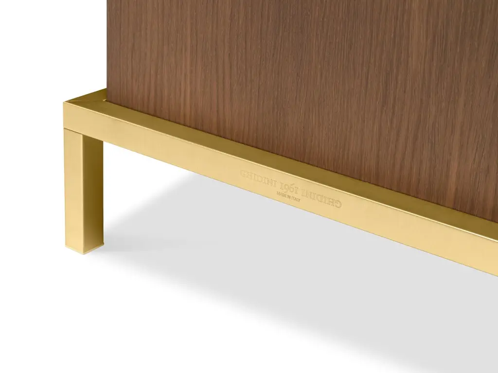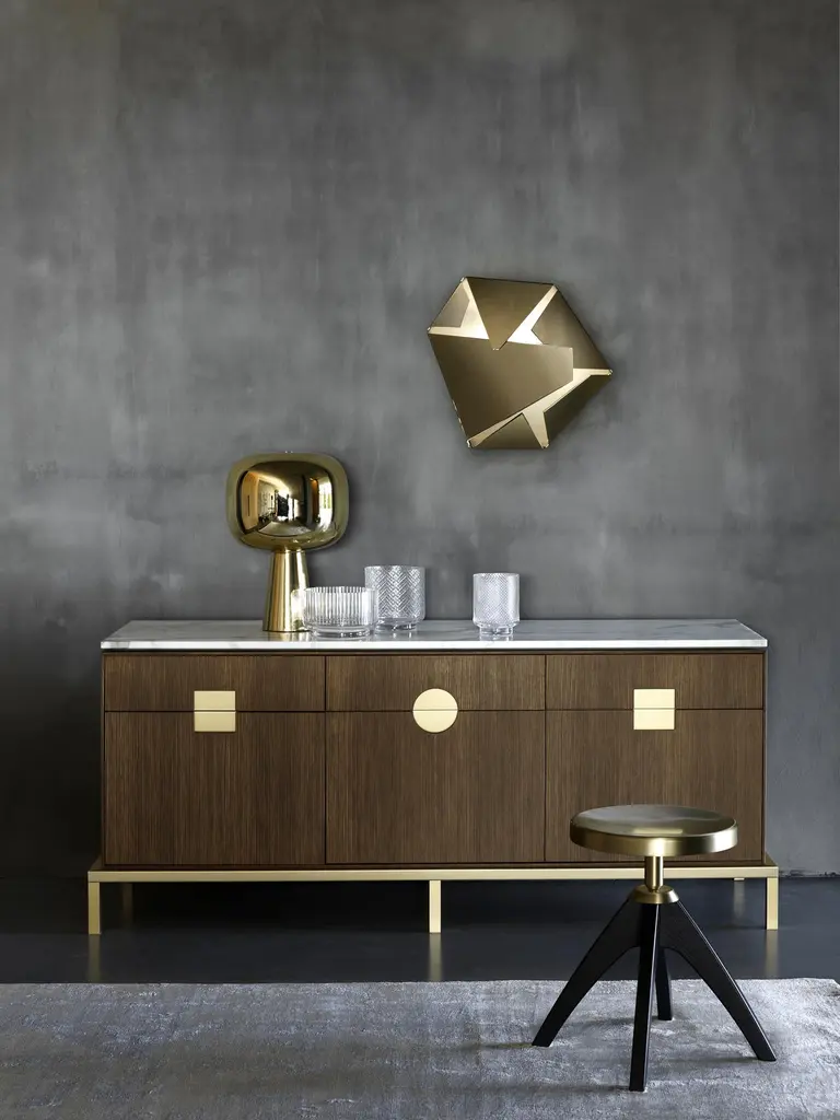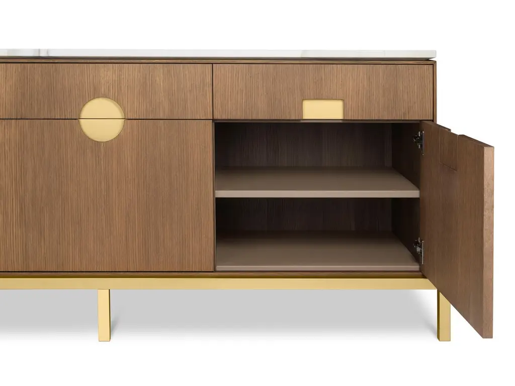 Elegant cabinet with essential lines of Japanese flavor. The slender structure in essence is opposed by four slim legs in gilded metal. Zuan is recognizable by the detail of the support, a quarter of a circle with great aesthetic and functionality, which defines the character of the storage unit. The central compartment, closed by essential brass handles, has shelves in Verde Alpi marble, a gesture of surprising refinement. The upper part of the cabinet is divided into four sections, in turn divided into smaller niches, drawn according to the golden proportion, inscribable in a perfect spiral. A wunderkabinet to exhibit our wonders.Different cultural needs and references in time and space are combined in the "Zuan" cabinet collection. The timeless classical Chinese cabinets and the 18th century English "chests" are revisited and updated. The single piece combines three materials in a variable and versatile way: brass, wood and marble. The brass for the support frames and partition walls, the wood for the containers and the marble for the support surfaces.The passionate quality of traditional cabinetmakers is supported by engineering in all production phases and by numerical control technologies, from the general scale to that of detail. The result is a product freed from fashions and boundaries.Additional information:Materials: Satin brass, oak and Calacatta marbleDimensions: W 184 x D 59 x H 78 cmAvailable in other finish options: Polished brass, light burnished brass, brown burnished brass, dark burnished brass, black gold.