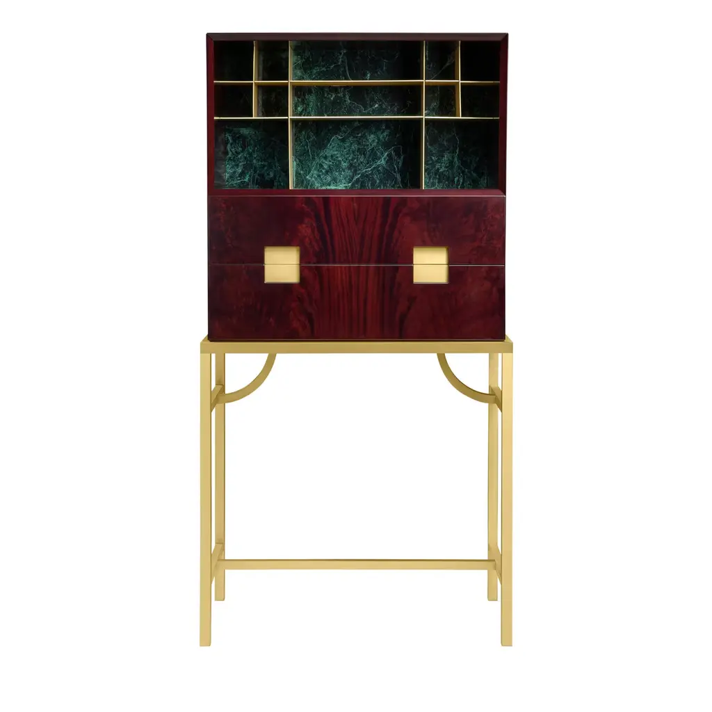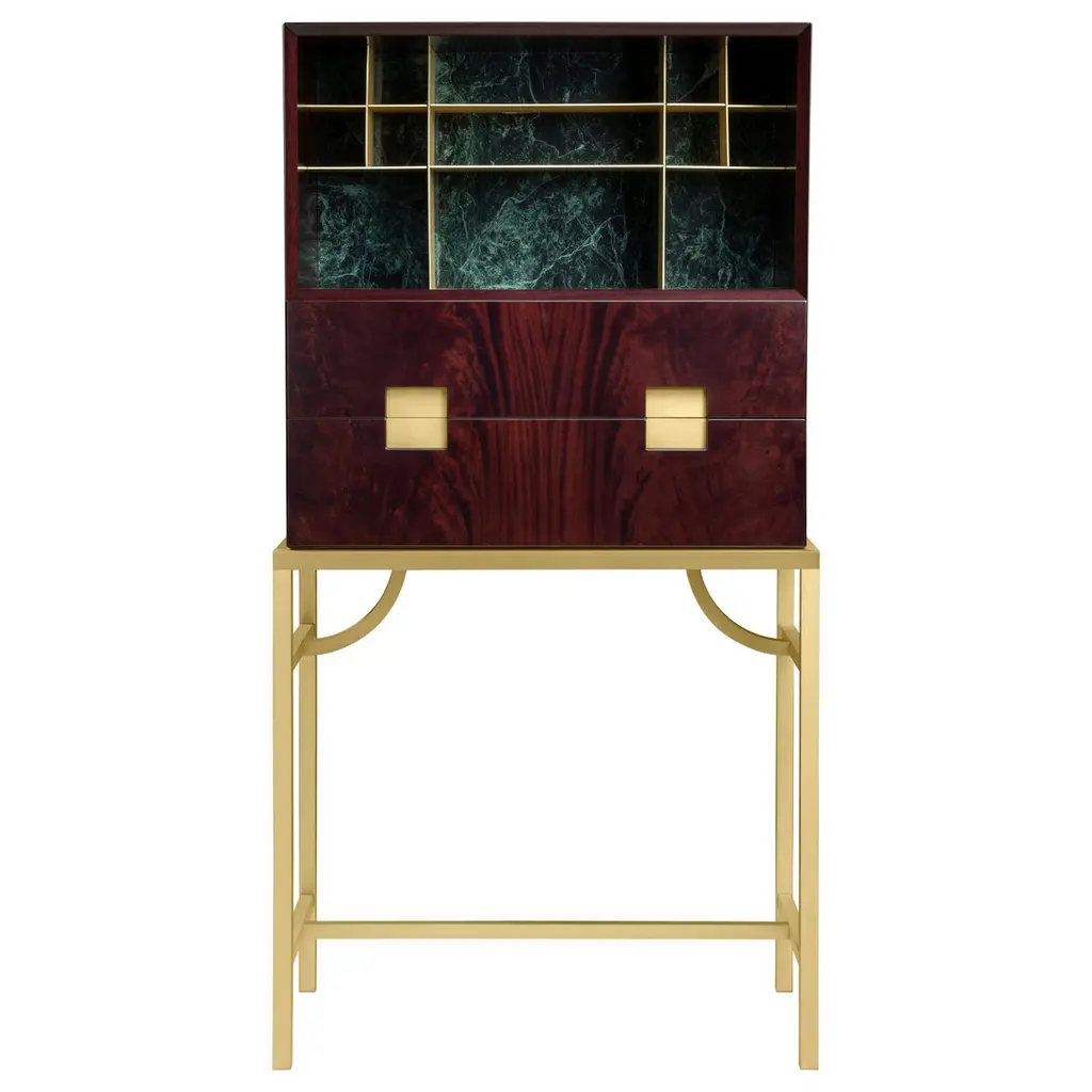 Elegant cabinet with essential lines of Japanese flavor. The slender structure in essence is opposed by four slim legs in gilded metal. Zuan is recognizable by the detail of the support, a quarter of a circle with great aesthetic and functionality, which defines the character of the storage unit. The central compartment, closed by essential brass handles, has shelves in Verde Alpi marble, a gesture of surprising refinement. The upper part of the cabinet is divided into four sections, in turn divided into smaller niches, drawn according to the golden proportion, inscribable in a perfect spiral. A wunderkabinet to exhibit our wonders.Different cultural needs and references in time and space are combined in the "Zuan" cabinet collection. The timeless classical Chinese cabinets and the 18th century English "chests" are revisited and updated. The single piece combines three materials in a variable and versatile way: brass, wood and marble. The brass for the support frames and partition walls, the wood for the containers and the marble for the support surfaces.The passionate quality of traditional cabinetmakers is supported by engineering in all production phases and by numerical control technologies, from the general scale to that of detail. The result is a product freed from fashions and boundaries.Additional information:Materials: Satin brass, oak and Calacatta marbleDimensions: W 89 x D 44 x H 170 cmAvailable in other finish options: Polished brass, light burnished brass, brown burnished brass, dark burnished brass, black gold.