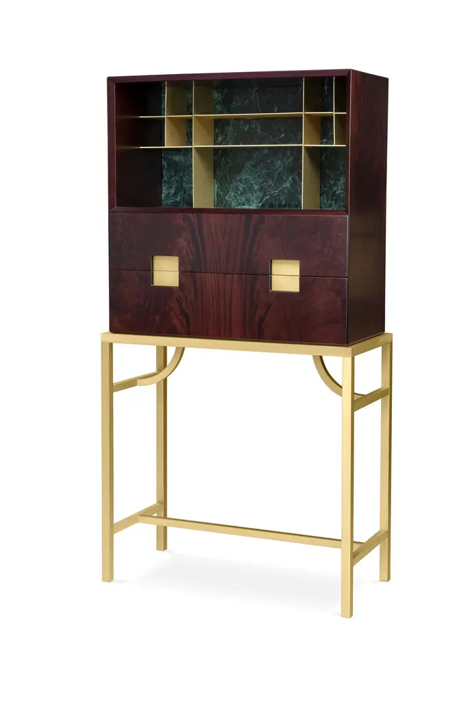 Elegant cabinet with essential lines of Japanese flavour. The slender structure in essence is opposed by four slim legs in gilded metal. Zuan is recognizable by the detail of the support, a quarter of a circle with great aesthetic and functionality, which defines the character of the storage unit. The central compartment, closed by essential brass handles, has shelves in Verde Alpi marble, a gesture of surprising refinement. The upper part of the cabinet is divided into four sections, in turn divided into smaller niches, drawn according to the golden proportion, inscribable in a perfect spiral. A wunderkabinet to exhibit our wonders. Different cultural needs and references in time and space are combined in the ""Zuan"" cabinet collection. The timeless classical Chinese cabinets and the eighteenth-century English ""chests"" are revisited and updated. The single piece combines three materials in a variable and versatile way: brass, wood and marble. The brass for the support frames and partition walls, the wood for the containers and the marble for the support surfaces. The passionate quality of traditional cabinetmakers is supported by engineering in all production phases and by numerical control technologies, from the general scale to that of detail. The result is a product freed from fashions and boundaries.Structure: 30 x 30mm squared tubular in satin brass and lacquered mahogany feather veneered melamine container, matte polished with filling bottom visible shelving in satin brass. Top in Green Alps marble. Handles in satin brass. Interior: Interior shelving and internal bases covered in natural leather. Materials: Satin brass, mahogany wood and marble.
