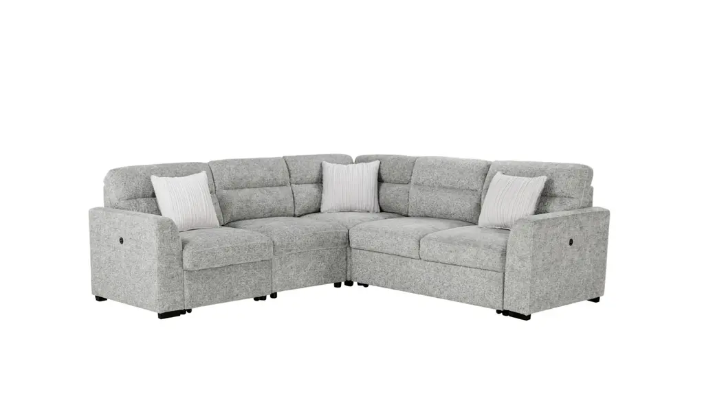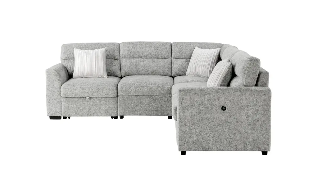 The Global Furniture Nickel Sectional with 3 Pillows and Ottoman is designed to adapt to the changing needs of a modern home. Upholstered in a soft nickel grey fabric, the sectional offers generous seating and includes a pull-out sleeper that easily converts into a bed, making it ideal for overnight guests. The included ottoman doubles as a storage unit, providing a discreet space to tuck away blankets, books, or other everyday items, helping to keep your living area tidy. Built-in USB ports on the armrest add a thoughtful touch, allowing you to keep your devices charged without reaching for wall outlets. The three coordinating pillows included enhance comfort and style, while the overall design remains clean and simple, fitting easily into both casual and contemporary interiors. Whether used for relaxing, hosting, or organizing, this sectional is a practical addition to any living room. Configuration: Sectional Sofa (1) + Pillows (3) + Ottoman (1)