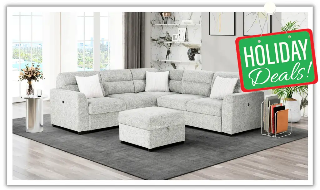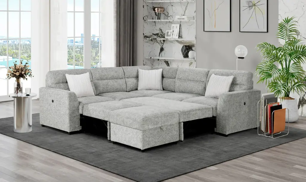 Global Furniture Nickel L-Shape Fabric Sleeper Sectional Sofa With 3 Pillows And Ottoman