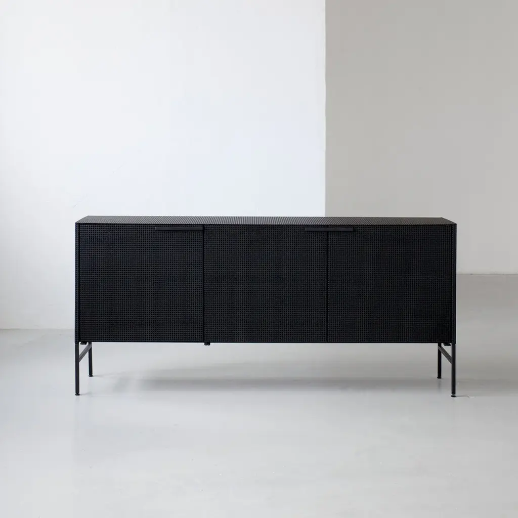 Grid Sideboard is a newcomer in the Kristina Dam Design Studio collection. The Grid Sideboard is made of black powder-coated steel. The sides and top plate are made of perforated steel. The Grid Sideboard is well-suited for storing books, objects or dishes and the see-through aspect brings forth a light appearance. An elegant and large side board with a transparent design. Use it to display your dearest accessories or as a remarkable spacious storage unit for your office space.