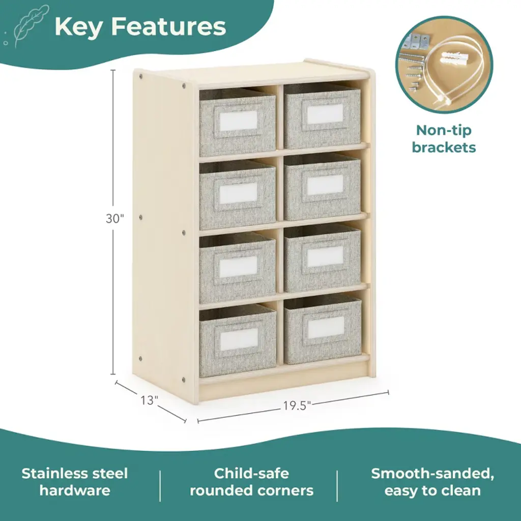 Guidecraft's EdQ collection satisfies practical storage and organizational needs in classrooms, homeschool environments and kids' play areas. The versatile, attractive furniture pieces in this complete collection provide opportunities for various easy configurations in any spaces where children learn and play. Keep kids' toys, books, art supplies and learning materials organized and accessible with the EdQ Cubby Bin Storage Organizer. This spacious storage unit features deep shelves divided into eight cubbies complete with durable fabric bins. A finished back panel allows for multiple room arrangement options.