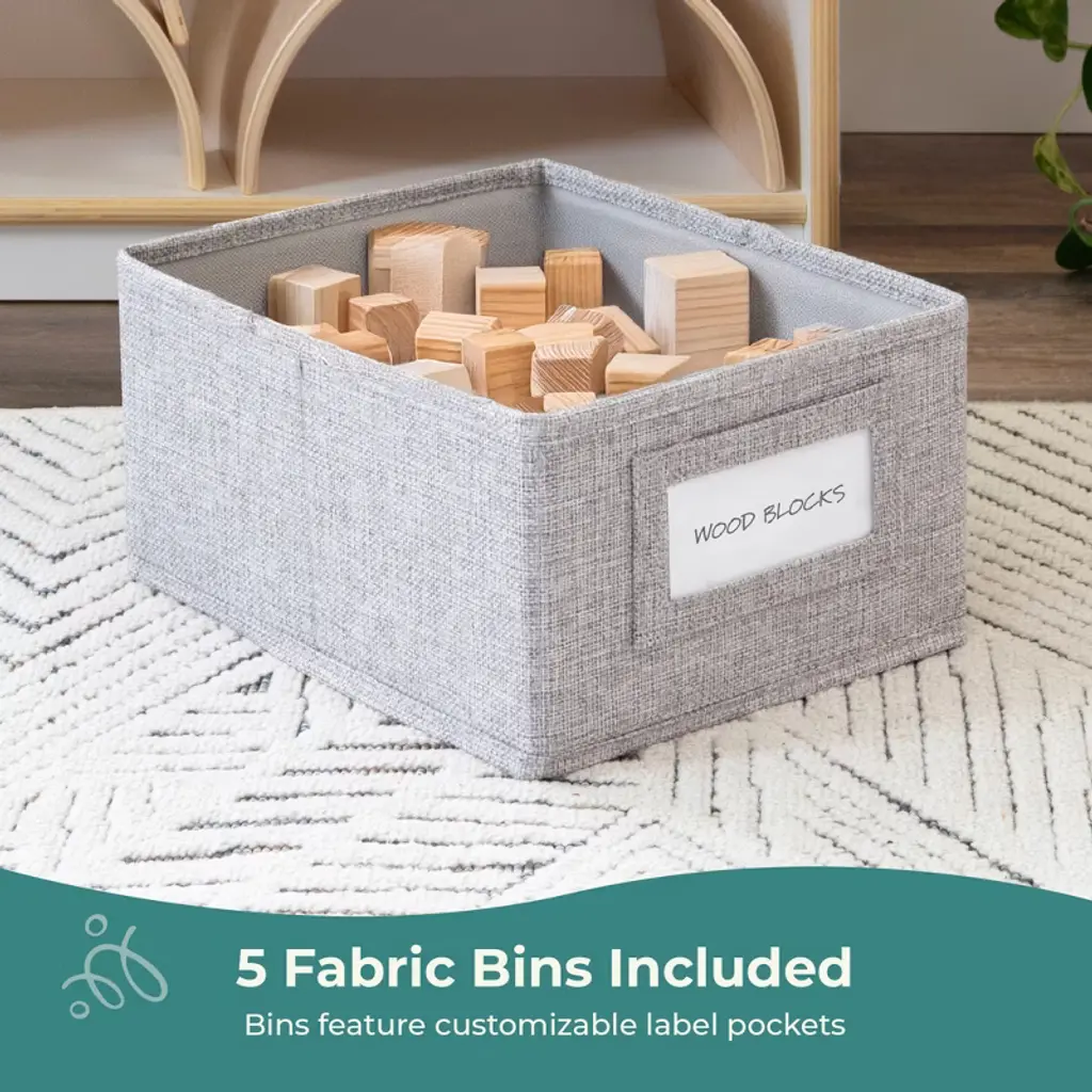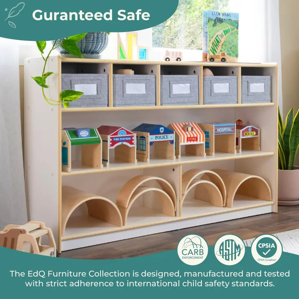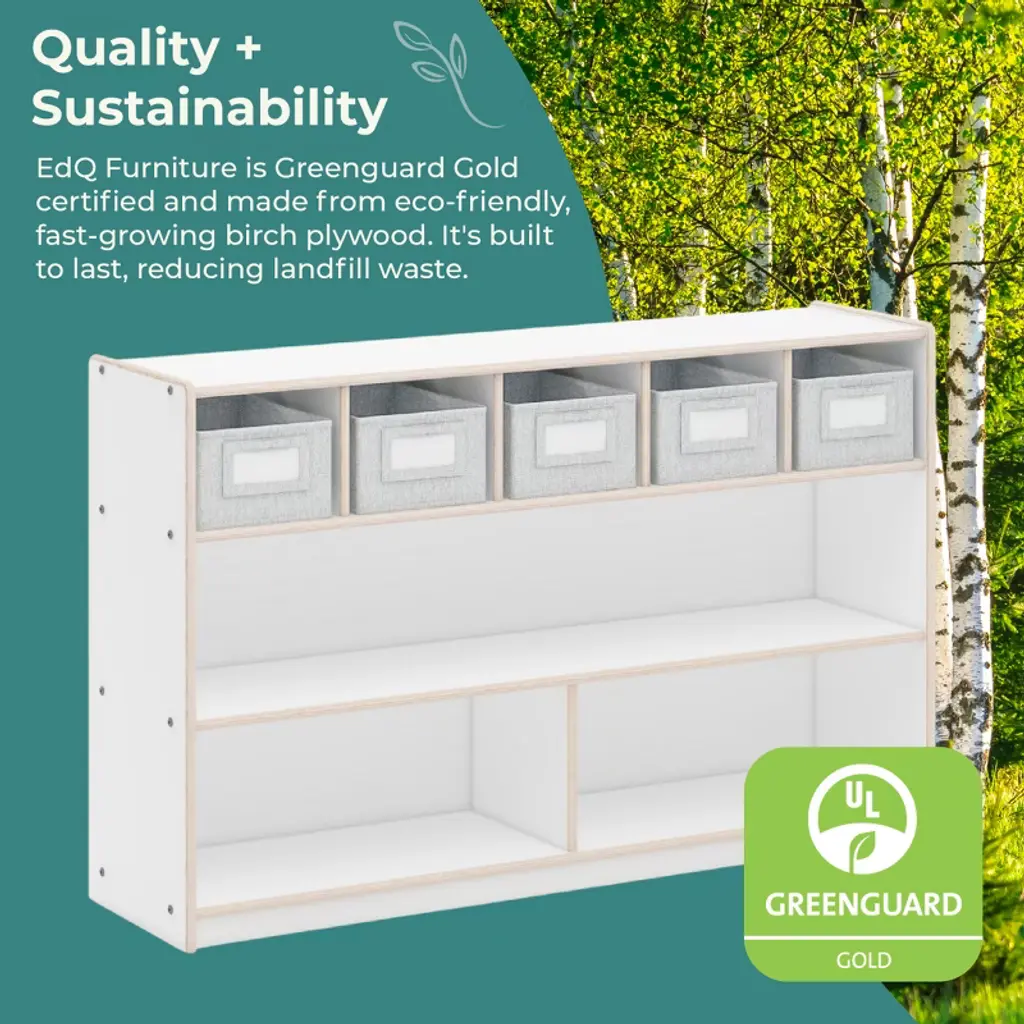 Guidecraft's EdQ collection satisfies practical storage and organizational needs in classrooms, homeschool environments and kids' play areas. The versatile, attractive furniture pieces in this complete collection provide opportunities for various easy configurations in any spaces where children learn and play. Keep kids' toys, books, art supplies and learning materials organized and accessible with the EdQ Shelves and 5 Bin Storage Unit. This spacious, compartmentalized unit features a variety of storage shelves and cubby spaces. A finished back panel prevents objects from falling through and allows for multiple room arrangement options.