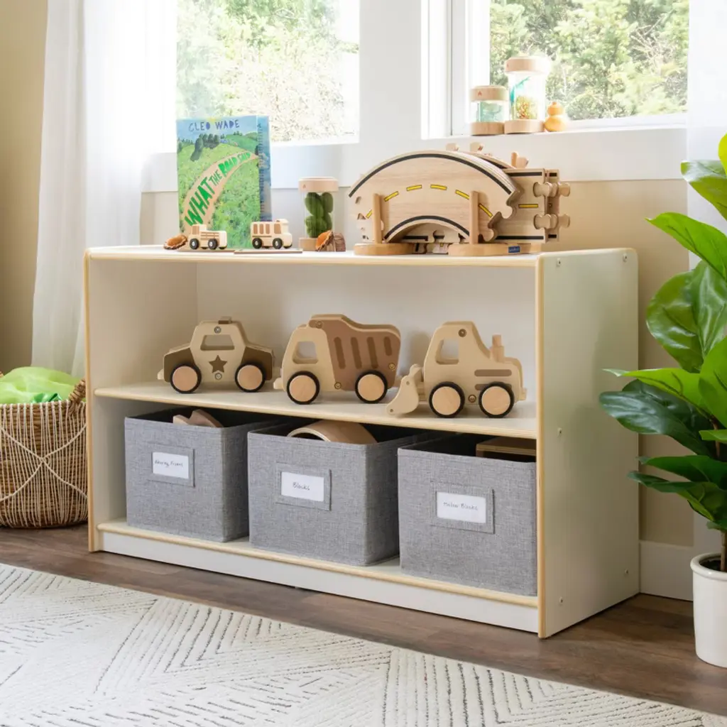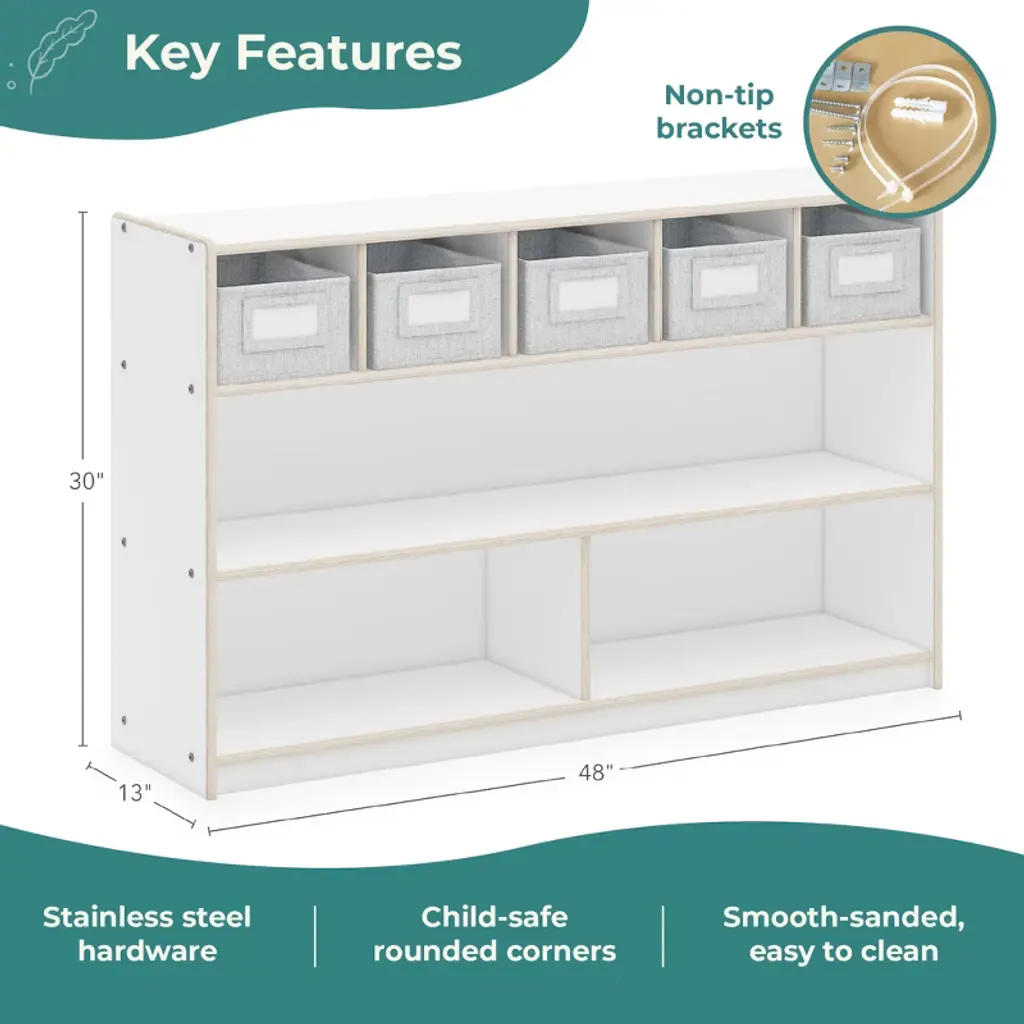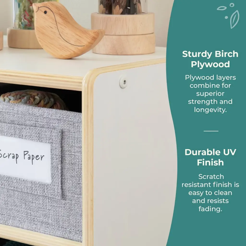 Guidecraft's EdQ collection satisfies practical storage and organizational needs in classrooms, homeschool environments and kids' play areas. The versatile, attractive furniture pieces in this complete collection provide opportunities for various easy configurations in any spaces where children learn and play. Keep kids' toys, books, art supplies and learning materials organized and accessible with the EdQ Shelves and 5 Bin Storage Unit. This spacious, compartmentalized unit features a variety of storage shelves and cubby spaces. A finished back panel prevents objects from falling through and allows for multiple room arrangement options.