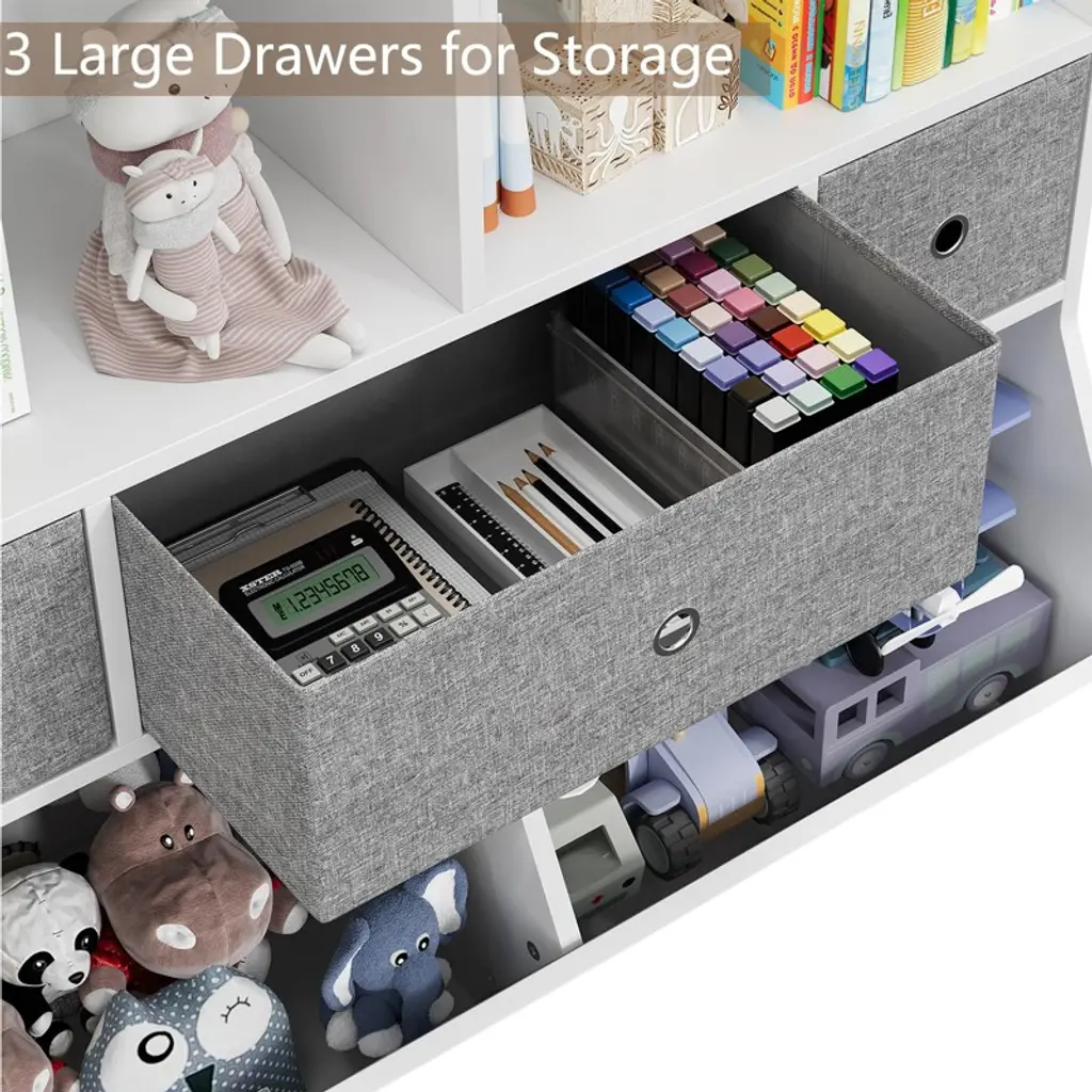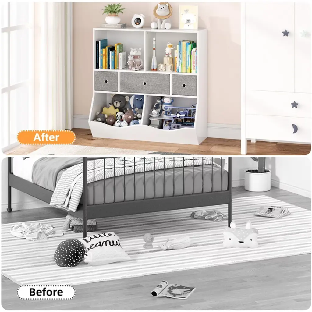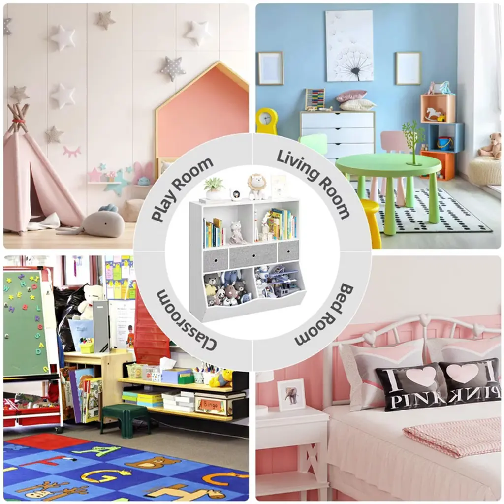 This multifunctional toddler bookshelf and toy storage unit combines practical organization with child-friendly design. Featuring two open compartments for books and two slanted toy chests with three removable drawers, it provides easy access and ample storage for children’s favorite items. Crafted from high-quality, eco-friendly materials with a safe, stable construction, it’s perfect for nurseries, bedrooms, playrooms, and schools. Its bright colors and smooth finish add a cheerful touch to any room while promoting reading and organization skills.