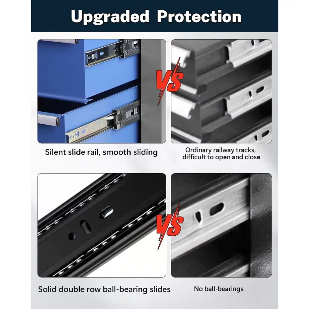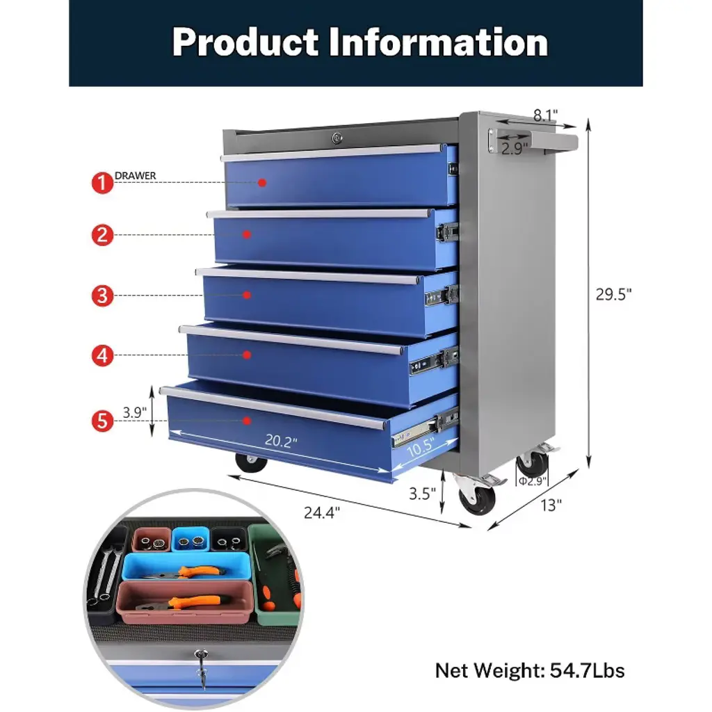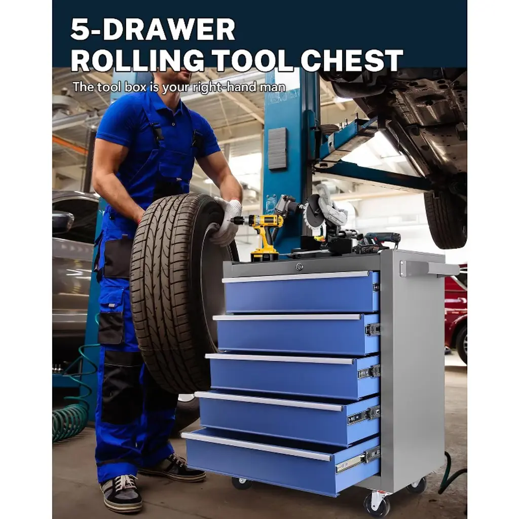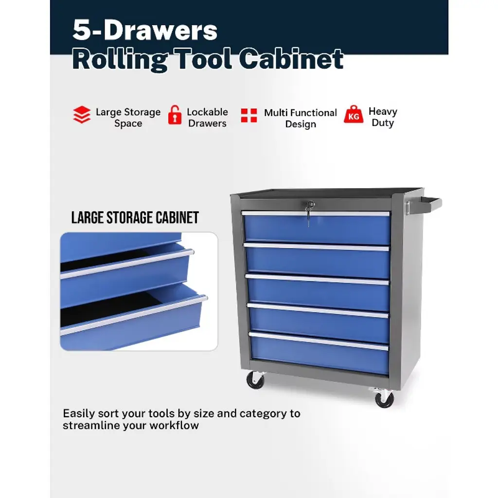 Heavy-duty 5-drawer Rolling Tool Chest With Lock & Liner ̈C Blue-grey Workshop Storage Cabinet With Wheels, 7 Organizer Boxes & 8 Hooks, Blue