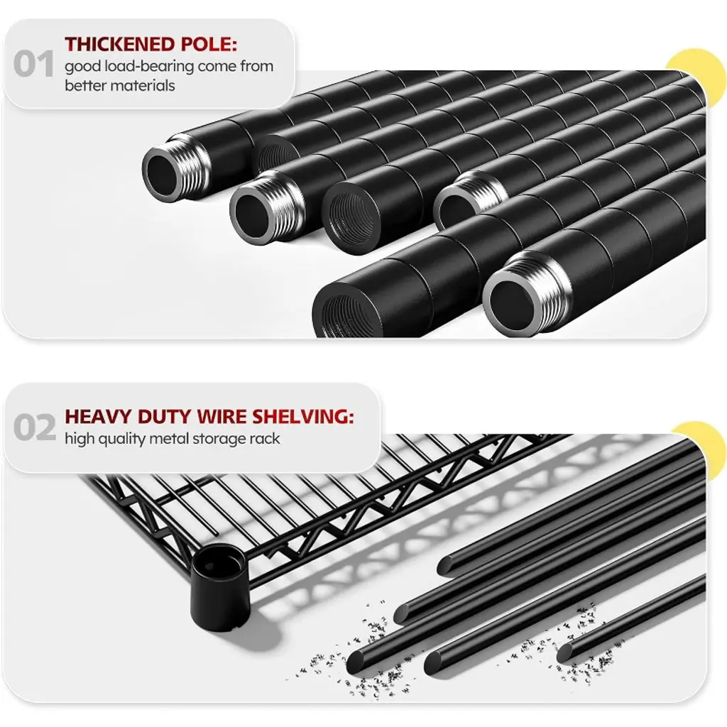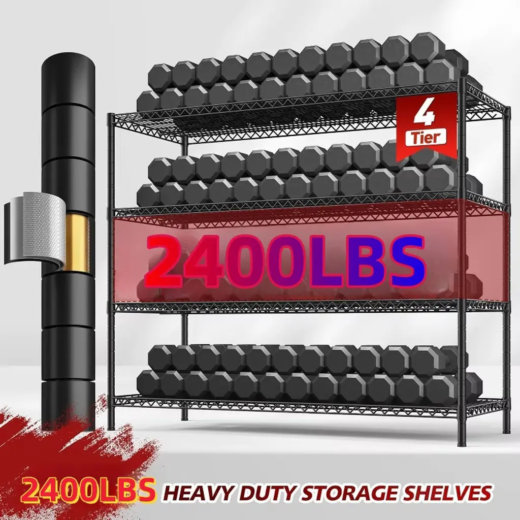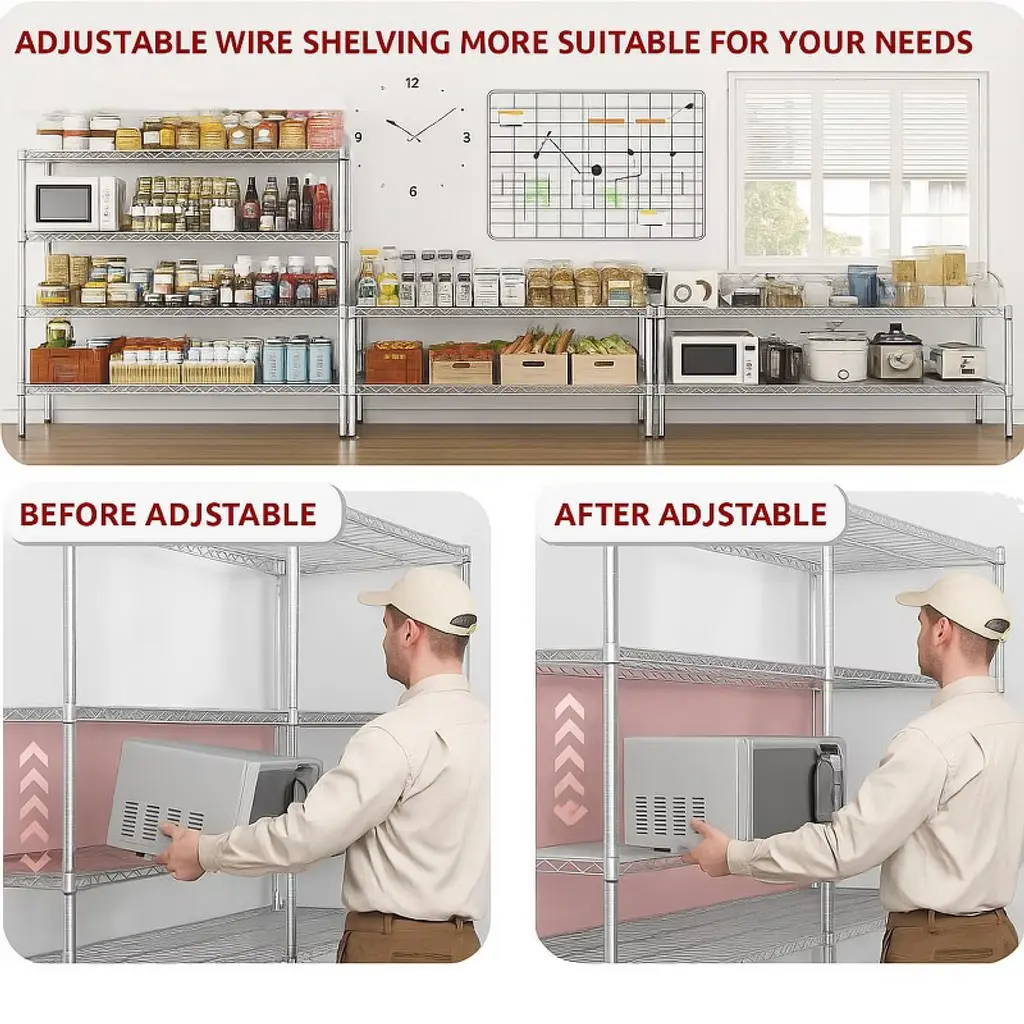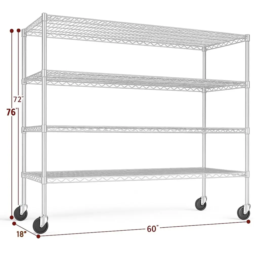Heavy Duty Storage Shelves Load 2400LBS, Metal Shelving 4-tier Wire Shelving Unit Metal Shelves With Wheels for Storage Adjustable Garage Shelving for Pantry Kitchen Garage Commercial school 60" W x 18" D x 72" H Product Description: Material: Metal Mounting Type: Floor Mount Shelf Type: Metal Shape: Rectangular Number of Shelves: 4 Product Dimensions: 18"D x 60"W x 72"H Finish Type: Powder Coated WIRE SHELVING LOADS: 2400 LBS Room Type: Kitchen, Garage, Basement, Living Room, Laundry, Pantry, Home, Industrial, Stores Special Feature: Heavy Duty, Adjustable, 4 Tier Wire Shelving Unit, Metal Shelving, Space Saving, Leveling/Corner Mounting Assembly Required: Yes Product Feature: PERFECT FOR YOUR PANTRY: Transform your storage space with professional-grade shelving designed specifically for pantry and utility room organization. TWICE THE CAPACITY OF OTHER SHEELVES: Maximize your storage potential with double the capacity compared to standard shelving units, giving you more space for all your essentials. 2400LBS HEAVY DUTY STORAGE SHELVES: Built to last with industrial-strength construction supporting up to 2400 pounds, perfect for storing heavy items, bulk goods, and equipment. ADJUSTABLE WIRE SHELVING MORE SUITABLE FOR YOUR NEEDS: Customize shelf heights to accommodate items of various sizes - from small containers to large appliances. Adjust before and after installation to meet your changing needs. STEEL SHELVING WITH WHEELS: Effortlessly move your entire storage unit wherever needed with smooth-rolling wheels, making cleaning and reorganization a breeze. HIGH QUALITY DESIGN: THICKENED POLE- good load-bearing come from better materials; HEAVY DUTY WIRE SHELVING- high quality metal storage rack. Transform your storage challenges with this industrial-grade 4-tier metal shelving unit designed to handle your heaviest organizational needs. Built with premium heavy-duty steel construction, this 60" W x 18" D x 72" H storage powerhouse supports an impressive 2400 lbs total weight capacity while maintaining exceptional stability and durability. The adjustable wire shelving design allows you to customize shelf heights to accommodate items of varying sizes, from small containers to large equipment. Equipped with smooth-rolling wheels, this mobile storage solution effortlessly moves wherever you need it most - whether in your garage, pantry, kitchen, commercial space, or school facility. The open wire construction promotes optimal air circulation, keeping stored items fresh and accessible, while the tool-free assembly ensures quick and easy setup. Perfect for organizing tools, supplies, inventory, food storage, and heavy equipment with professional-grade reliability.