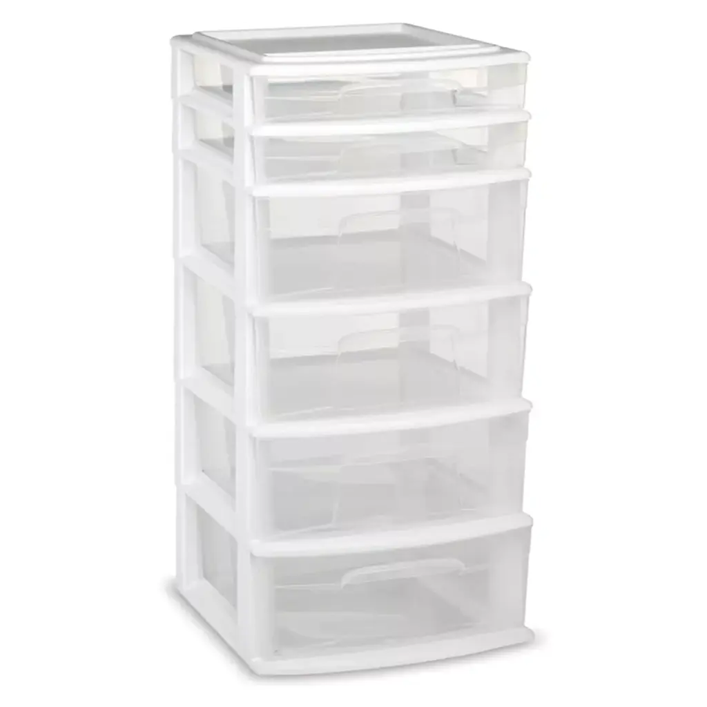 Your kitchen junk drawer isn't doing you any favors. Organize your random clutter with help from the 2-Pack of Homz 6 Drawer Container Towers. Equipped with 2 small and 4 large drawers, this multi-purpose organizer unit is perfect for storing small to medium-sized items. Whether you place it in the bathroom, your bedroom, the laundry room, or the kitchen, make use of this convenient storage organizer. The heavy-duty white plastic frame keeps the 6 drawers in place so you can store everything from shoes and clothing to art supplies and holiday decorations. The clear drawer design makes it easy for you to quickly identify the contents without having to remove or open the container. A top recessed lid makes it easy to keep small items in place without rolling off. Measuring 12.5 inches long, 14 inches wide, and 31 inches tall overall, the large drawer measures 12.31 inches long, 10 inches wide, and 7 inches tall. On the other end, the small drawers measure 12.3 inches long, 10 inches wide, and 3 inches tall. So, enjoy keeping your home more organized with the 2-Pack 6 Drawer Storage Container Towers from Homz.