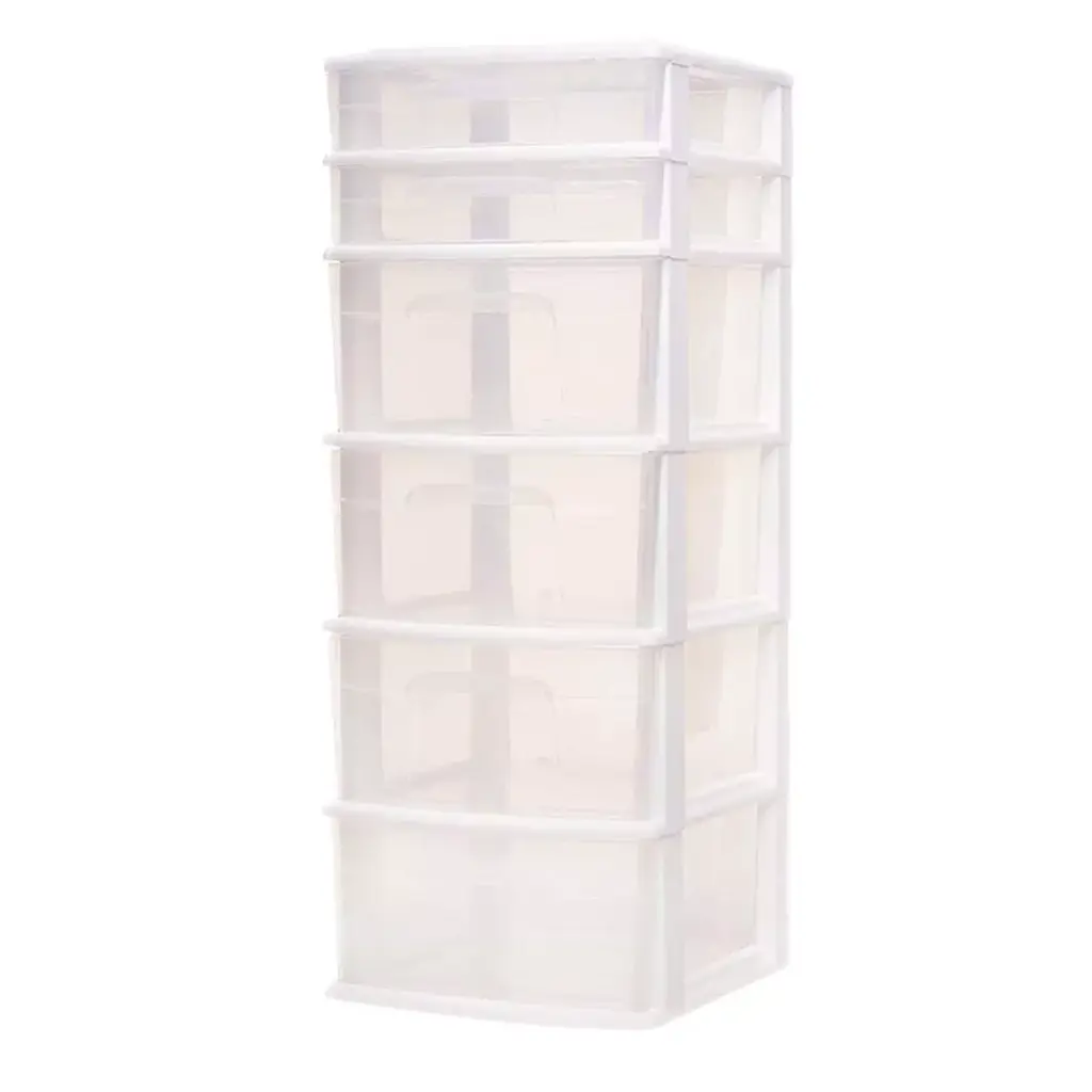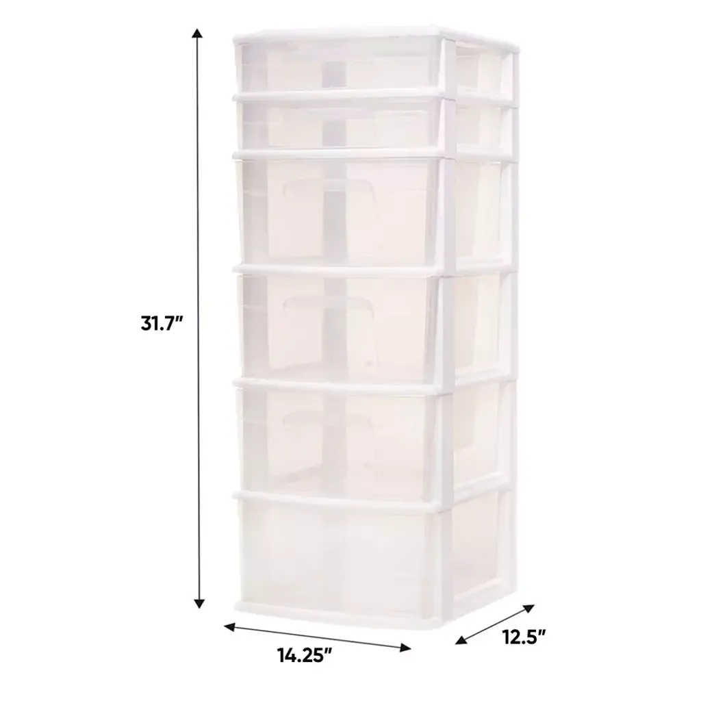 Homz Plastic 6 Clear Drawer Medium Home Organization Storage Container Tower With 4 Large Drawers And 2 Small Drawers, White Frame (2 Pack)
