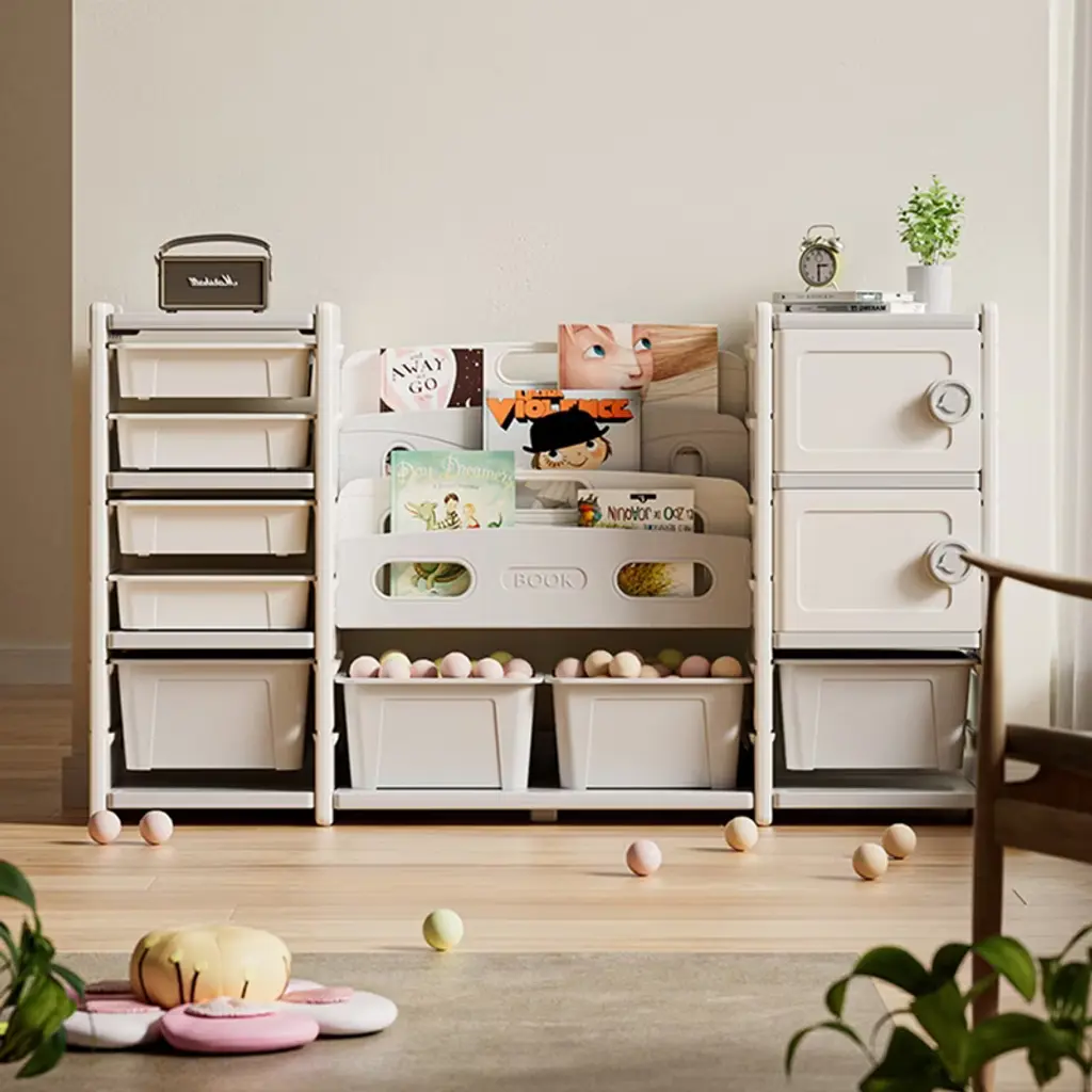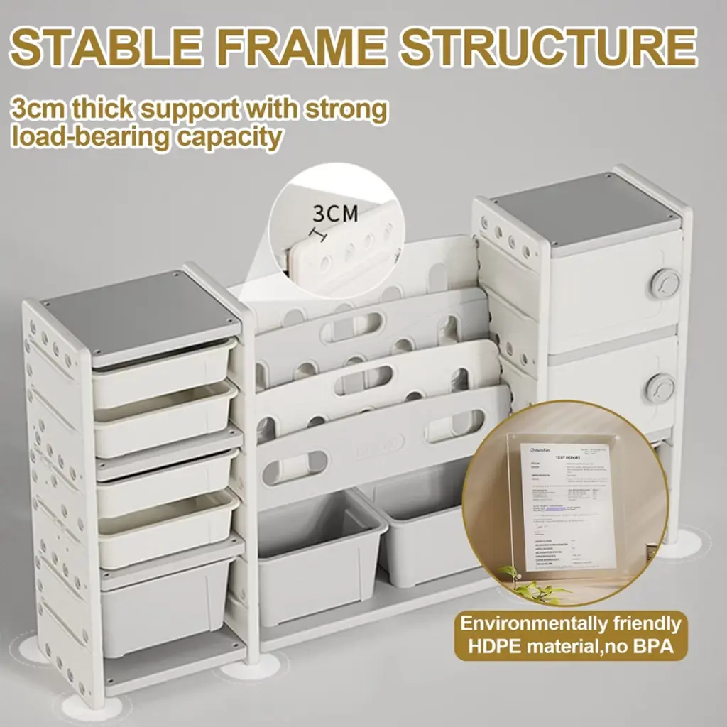 Hrinhom 63"w Kids Toy Storage Shelf,4 Tier Shelf+8 Toy Bins+ 2 Cabinet Storage