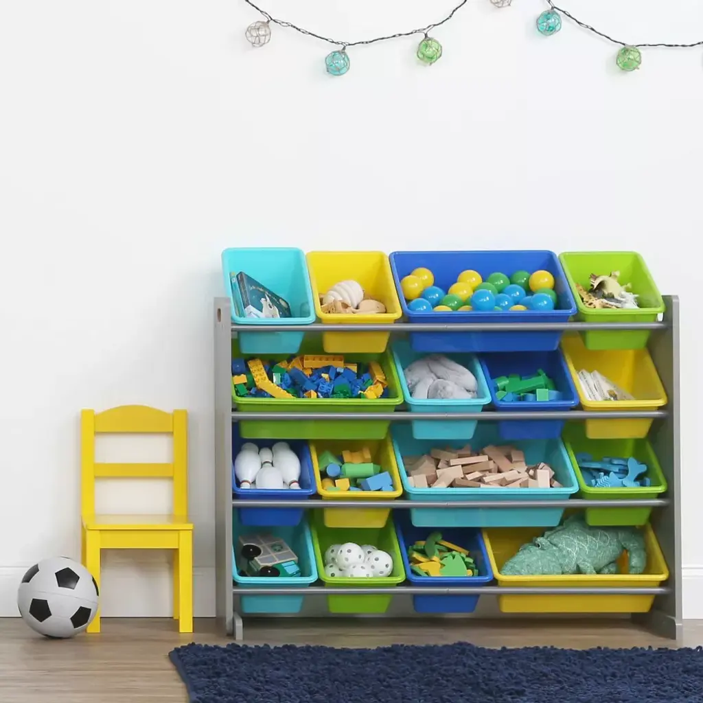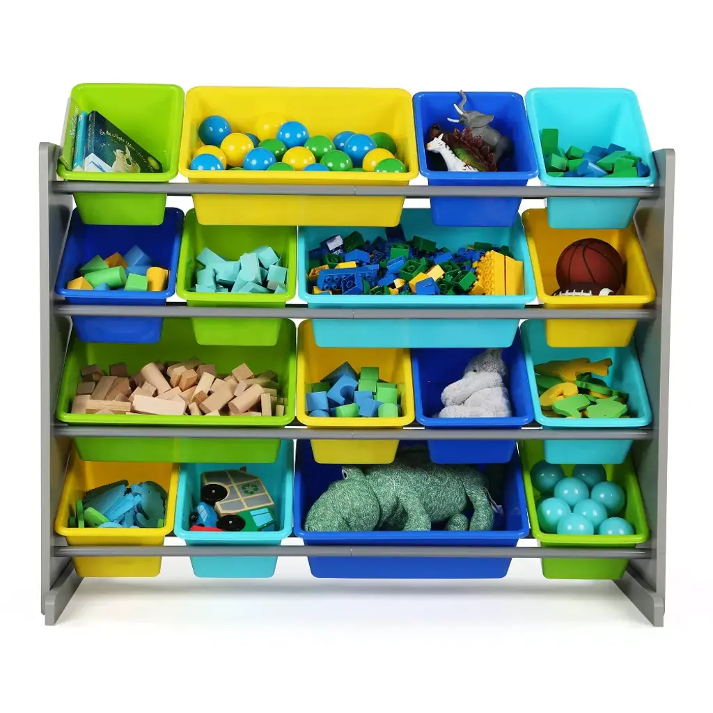 Playtime is more fun when your kids can easily take out their toys, books and games and then quickly clean up afterwards. The space-saving Humble Crew Super Sized Toy Storage Organizer with 16 Storage Bins stows your children's toys in easy-to-see, easy-to-access BPA and phthalate free plastic storage bins. Stylish colorways make it ideal for organizing your child’s nursery, bedroom, playroom, closet, even the living room....the options are endless! The 12 standard and 4 large storage containers are easy to remove, replace and reposition along the 4 tiered shelves—sized just right within the toy organizer for toddlers and preschool-aged children. It makes a great toy box storage alternative, helping keep your little one’s room clean and organized while at the same time teaching sorting and cognitive skills. Made with a sturdy engineered wood construction frame and steel shelving rods, each level can hold up to 20 pounds. Some assembly is required and all hardware is included. Product sizing -42"W x 11"D (15.5"D with stabilizing braces) x 31" HStandard bin sizing: 12" L x 9"W x 6" HLarge bin sizing: 16"L x 12"W x 6"HAdditional plastic storage toy bins are sold separately.