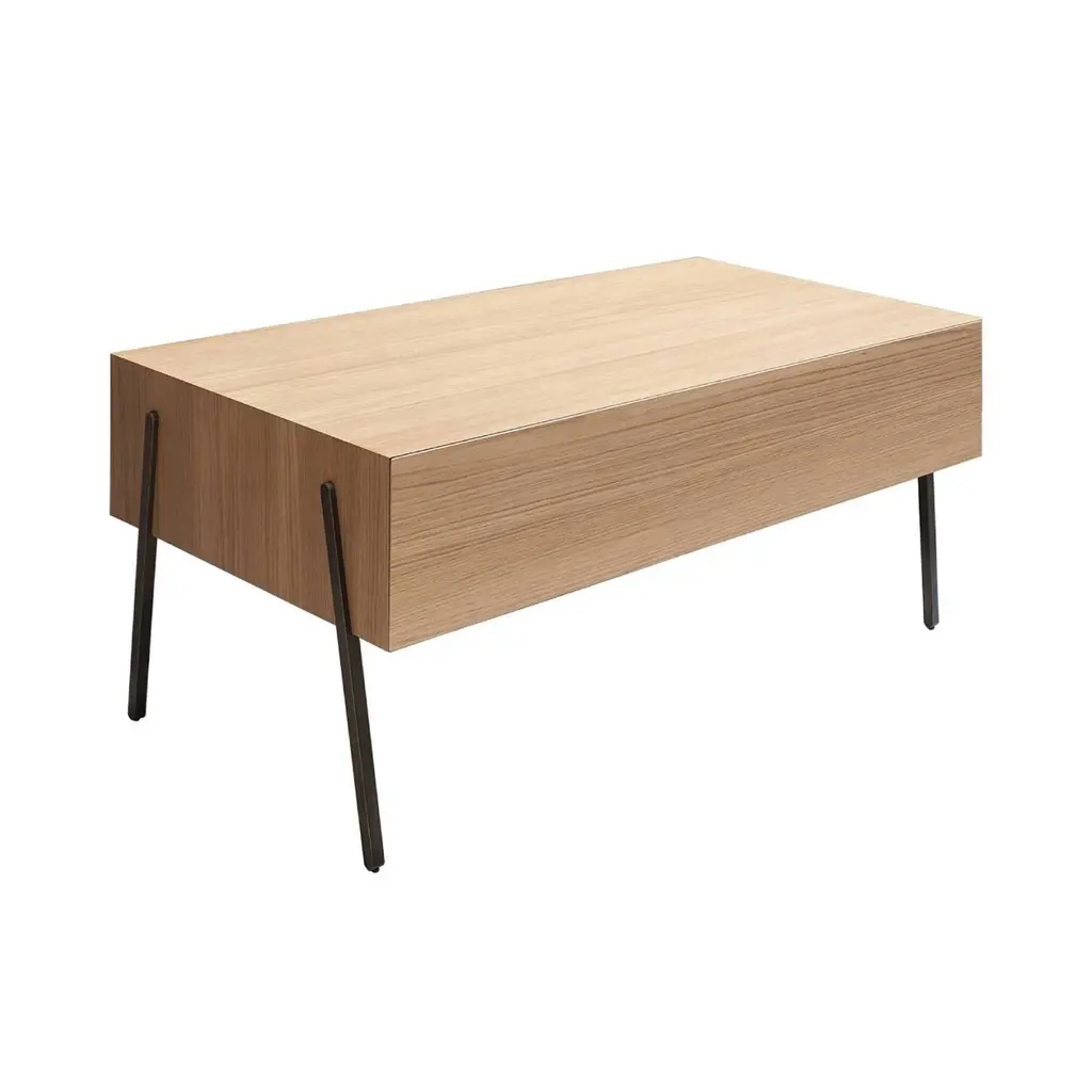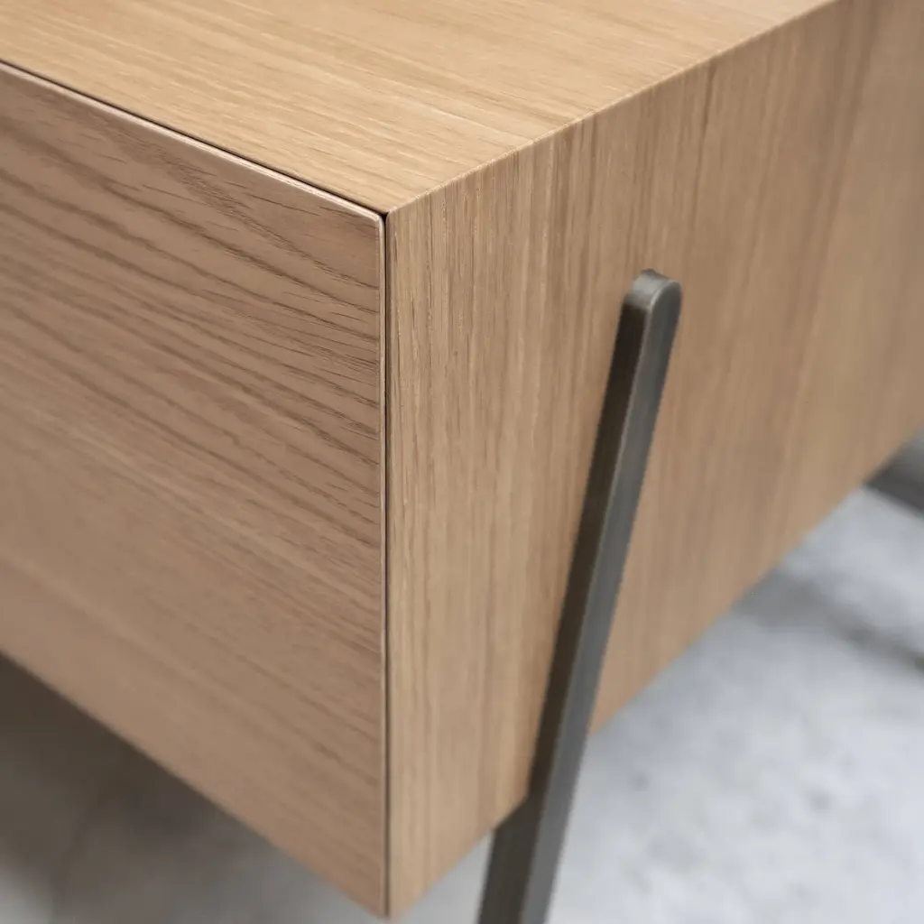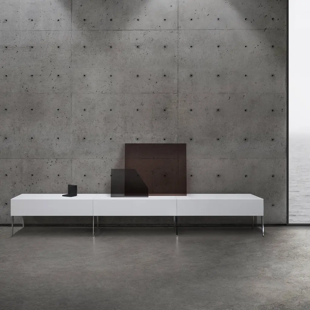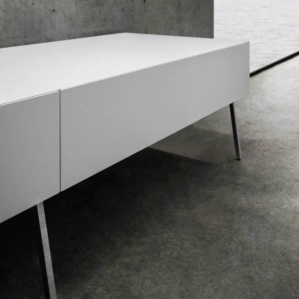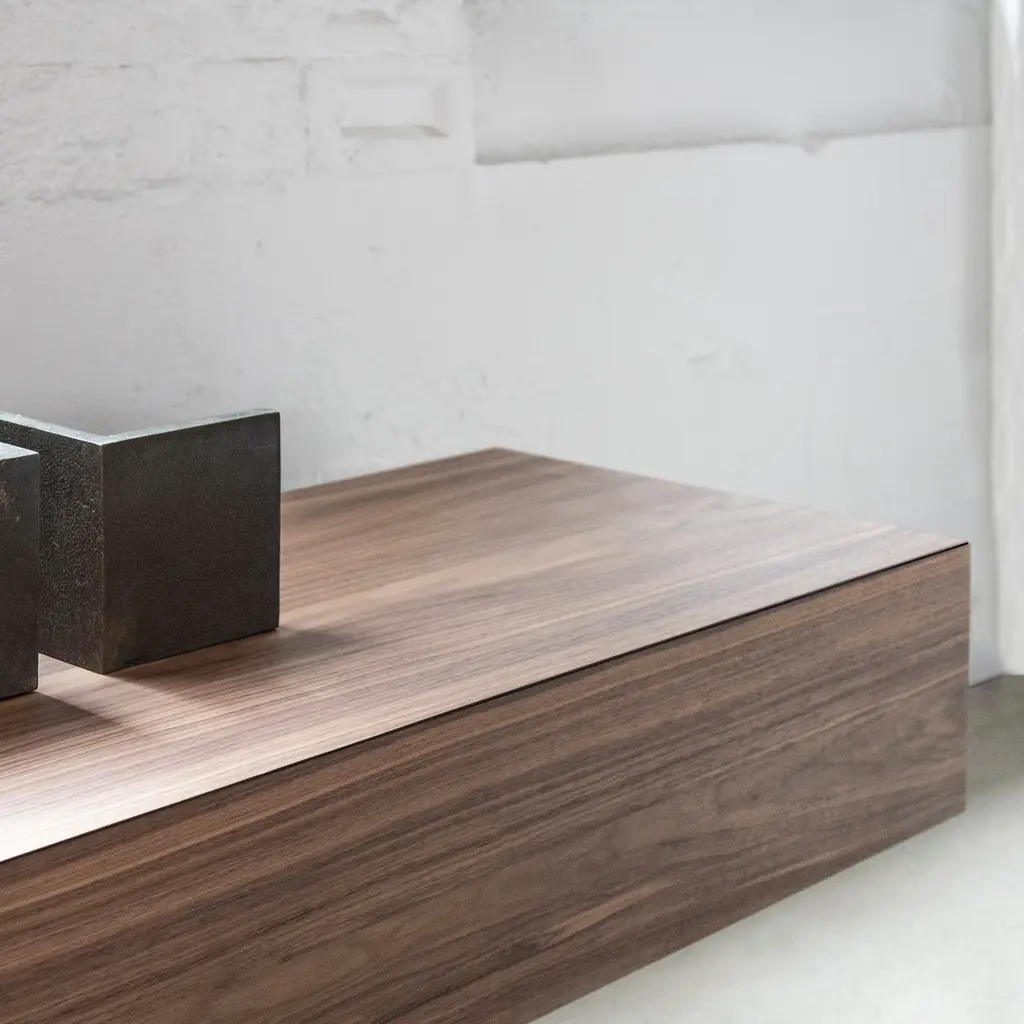 Elevated on slender metal legs, the geometric Into drawer cabinet floats serenely above the floor surface. Canadian-based Bensen’s superb made-in-Italy craftsmanship shines as the top woodgrain wraps around the sides for a continuous visual effect. Available in a variety of curated finishes, the cabinet comes in a choice of sizes—to use by the bed, as a side table or to combine as a larger storage setup.