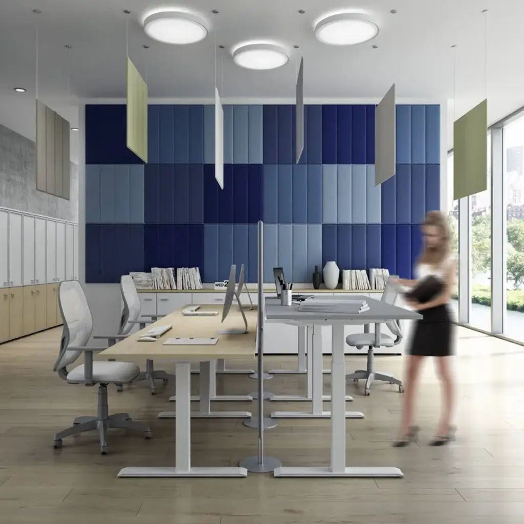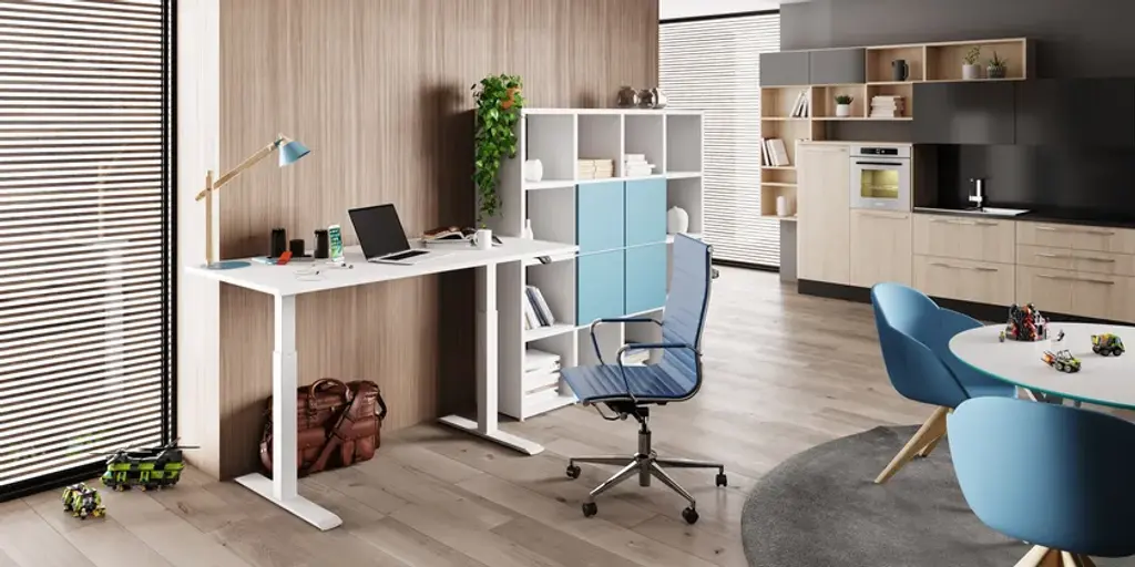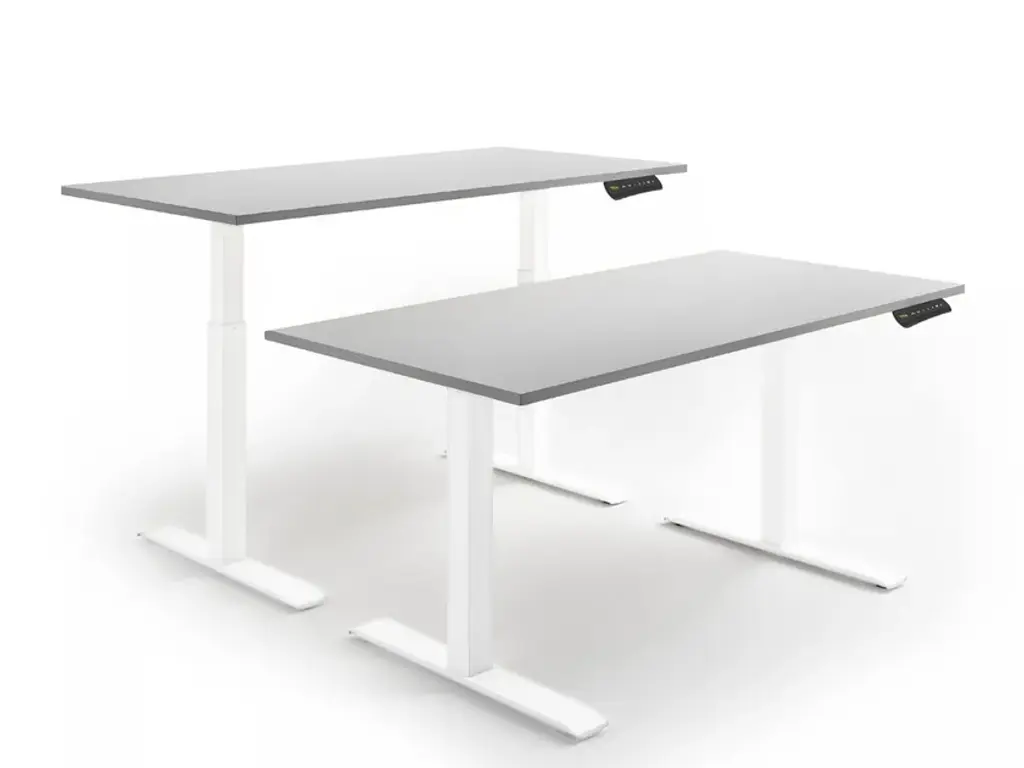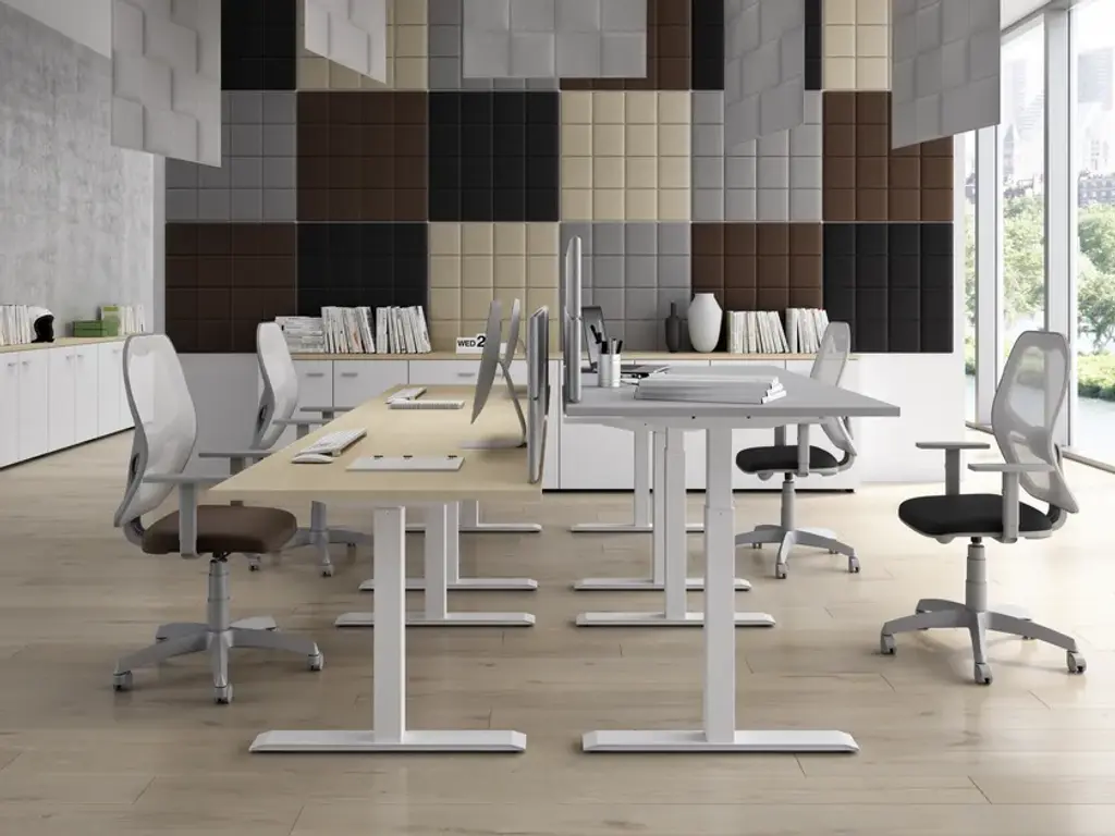 Isola Up is the height-adjustable version of the Isola collection, an operative furniture system with a T-leg. The worktops are made of scratch-resistant melamine wood conglomerate 30 mm thick in plain grey or veined birch. The white metal telescopic structure is composed of a fixed part and an elevating part, both in painted metal. Technical data: Elevation: from H. 68 cm to H. 118 cm. Load capacity: - static: 100kg - dynamic: 80 kg Speed: 36 mm/second Lifting: 2 motorsIsola is an operative furnishing system based on a T-leg structure. The worktops are made of scratch-resistant melamine wood conglomerate 30 mm thick, in plain grey or veined birch finishes. All metal parts are made of 20/10 thick sheet metal and are epoxy powder coated in White RAL 9003 finish or in Bonderized Grey finish. The system is also equipped with a carter for wiring the desk, which hooks onto the T-leg by means of a special magnet.On demand Isola is also equipped with all accessories and complements, such as modesty panel, supports for screen dividers, storage units, drawer units, etc..