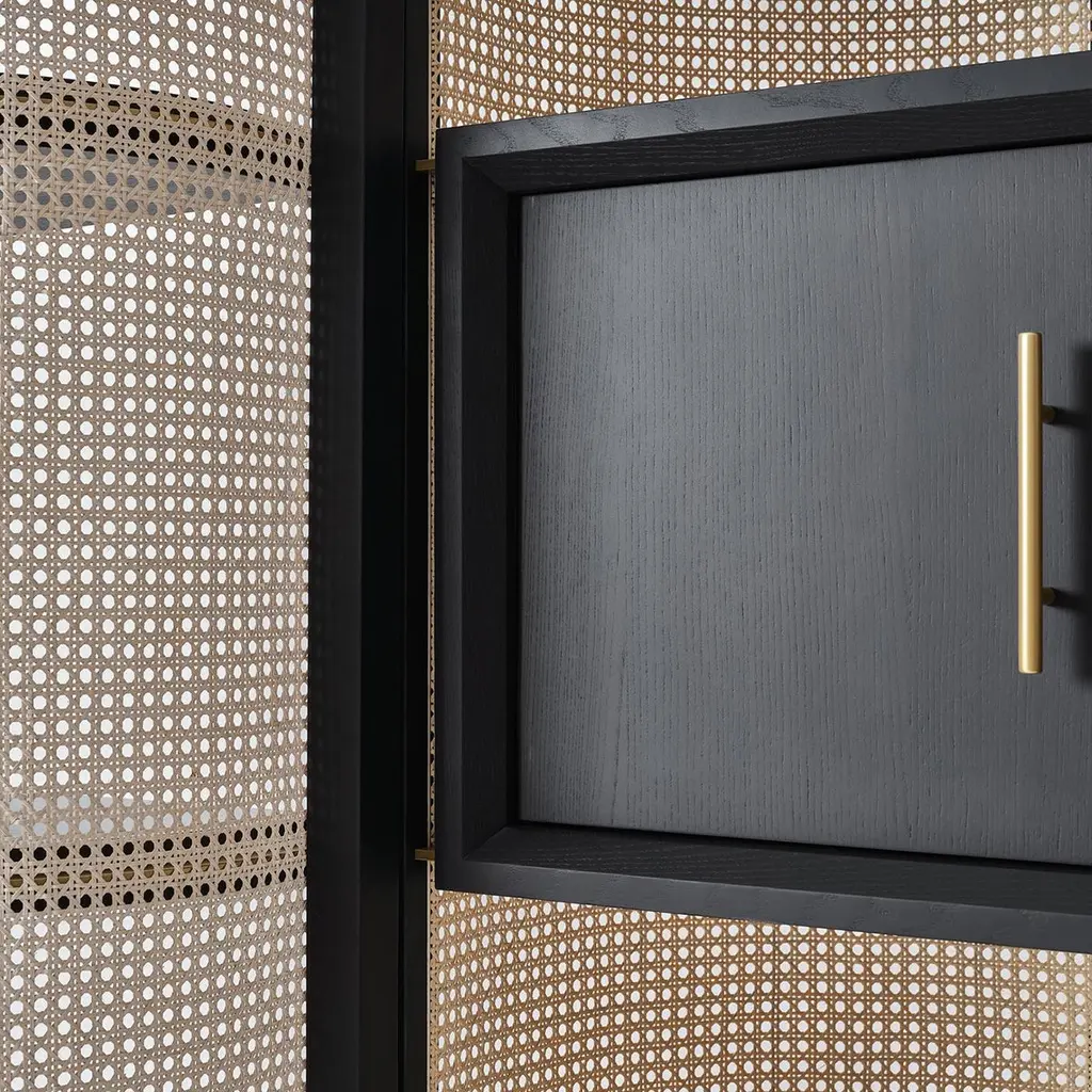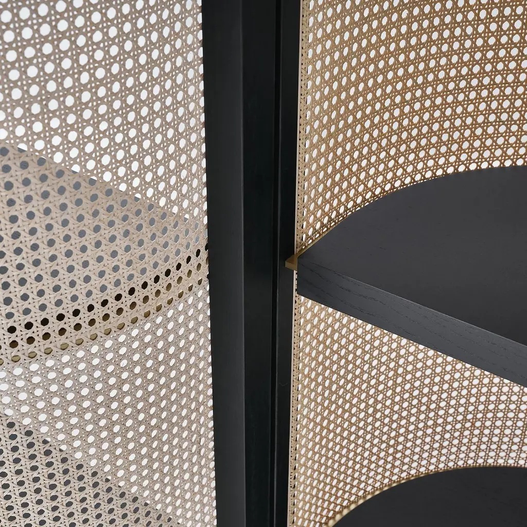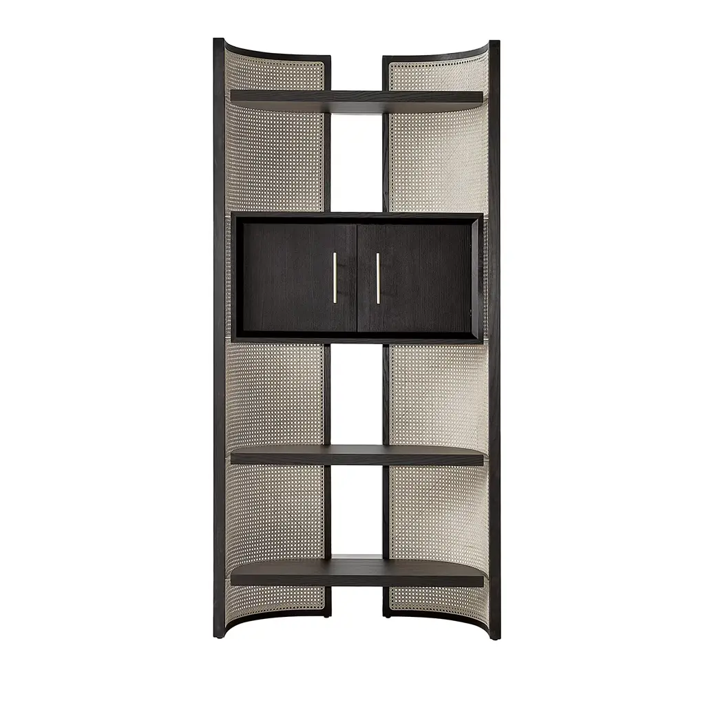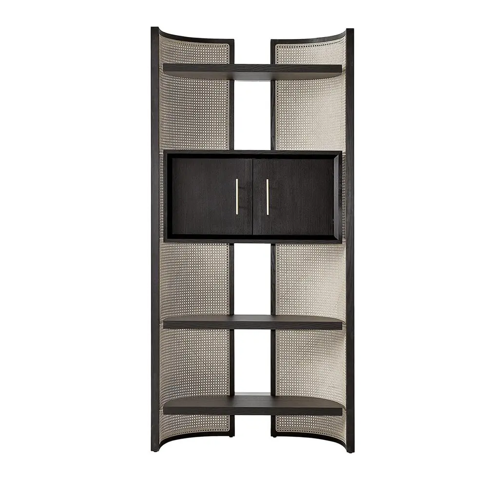 Precious finishes and enveloping curves characterize this bookcase, a subtly sculptural design echoing refined oriental atmospheres. Set in a couple of curved moka-stained ash frames, Vienna straw adds a traditional accent to its silhouette, complete with shaped shelves and a closed storage unit all crafted of moka-stained ash-veneered MDF. Matte golden metal details perfect the design.
